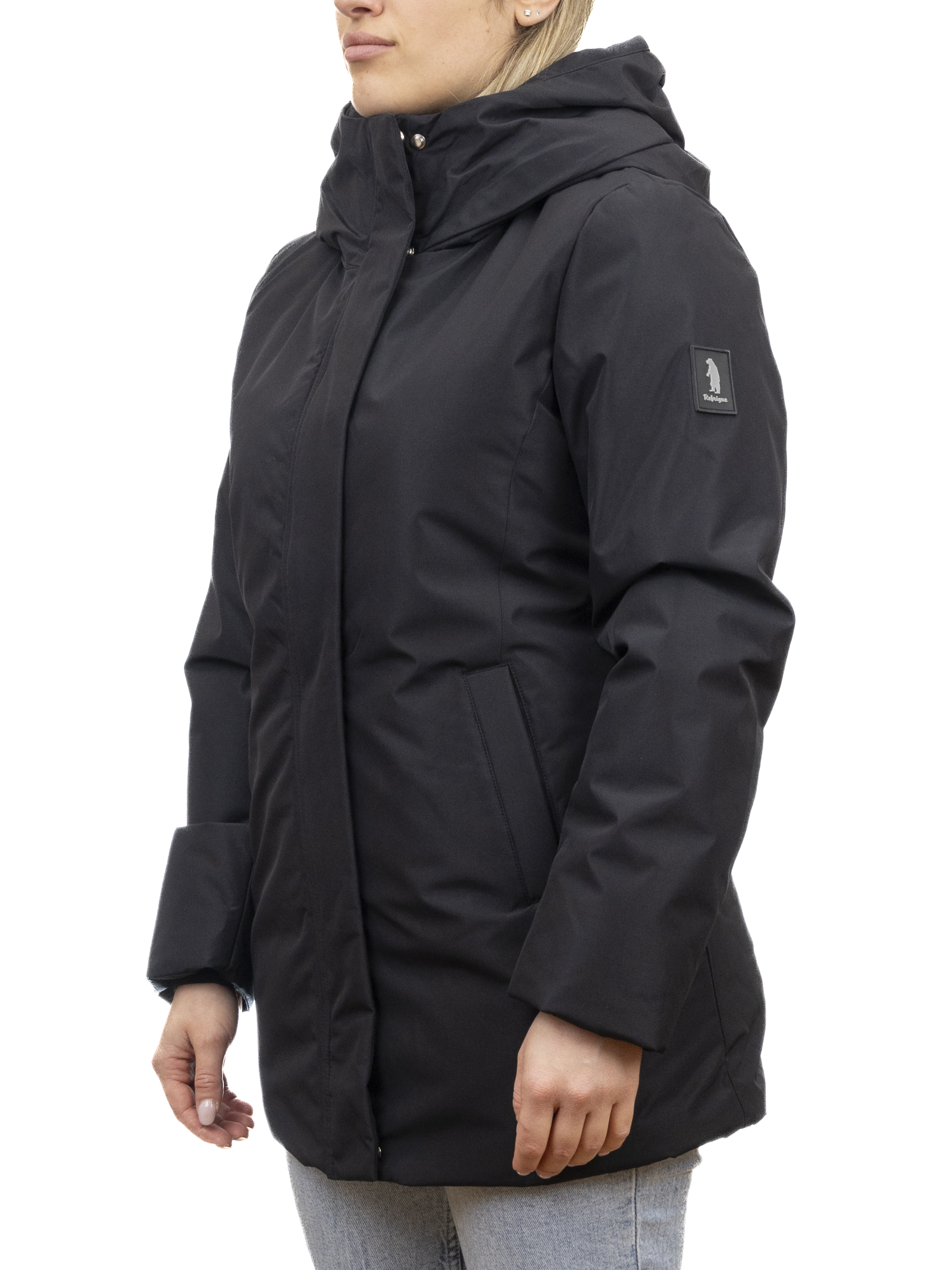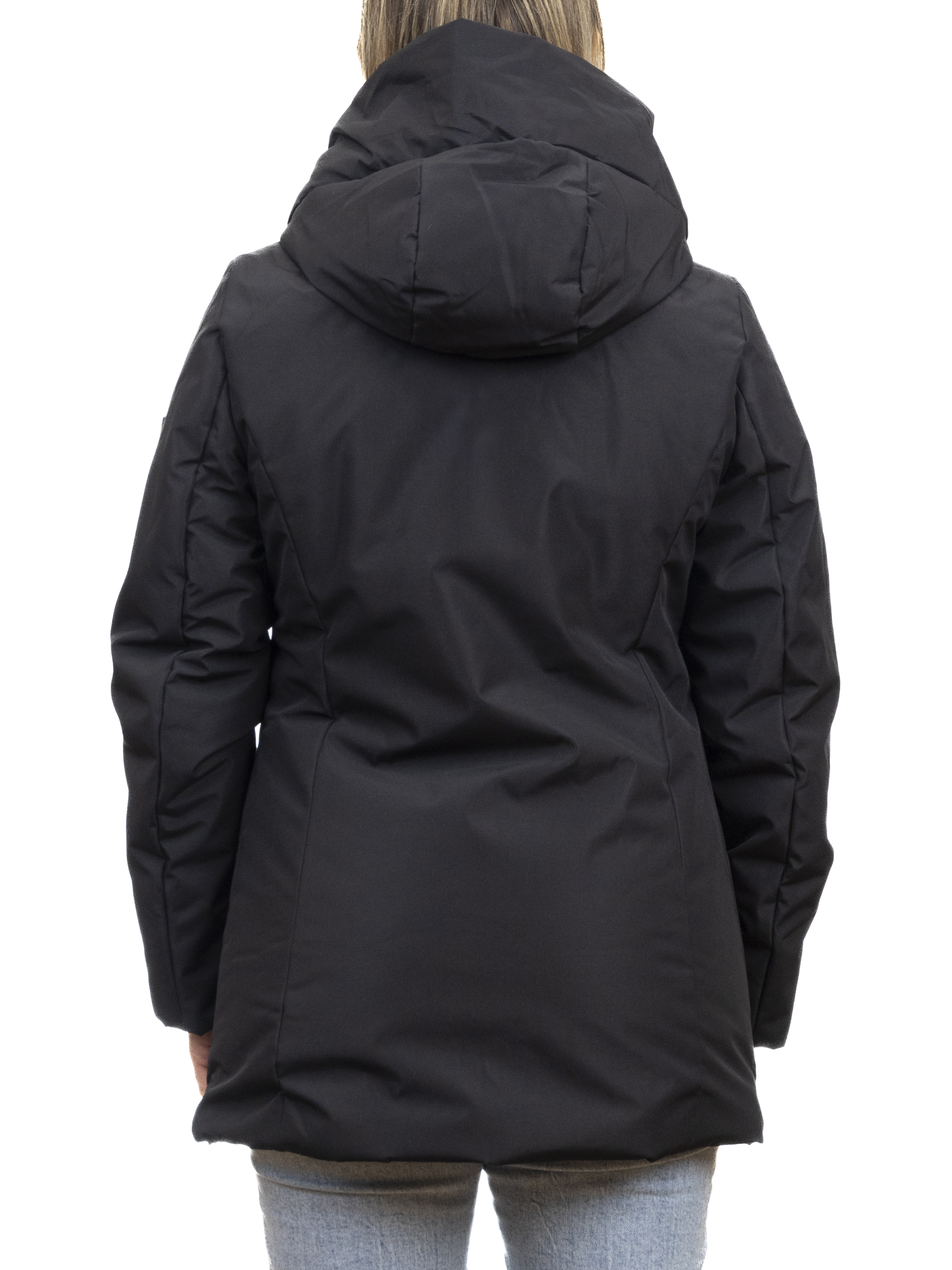 Nylon jacket. Double slider zip and press stud closure. Fixed hood. Side pockets with snap buttons. Logo on the sleeve.