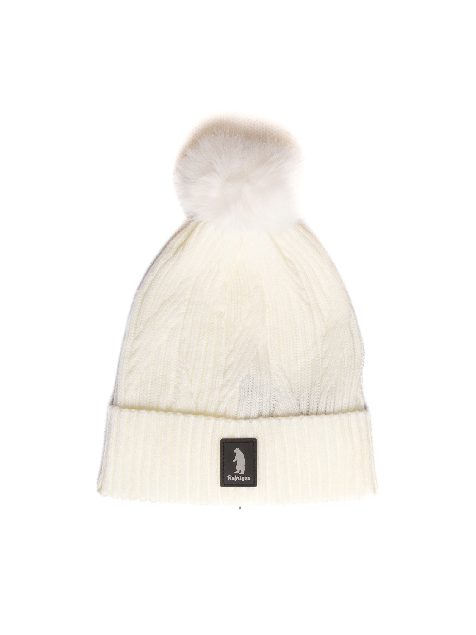 The cable-knit ice hat with a pom pom and Refrigue logo is the perfect accessory for facing the winter in style.