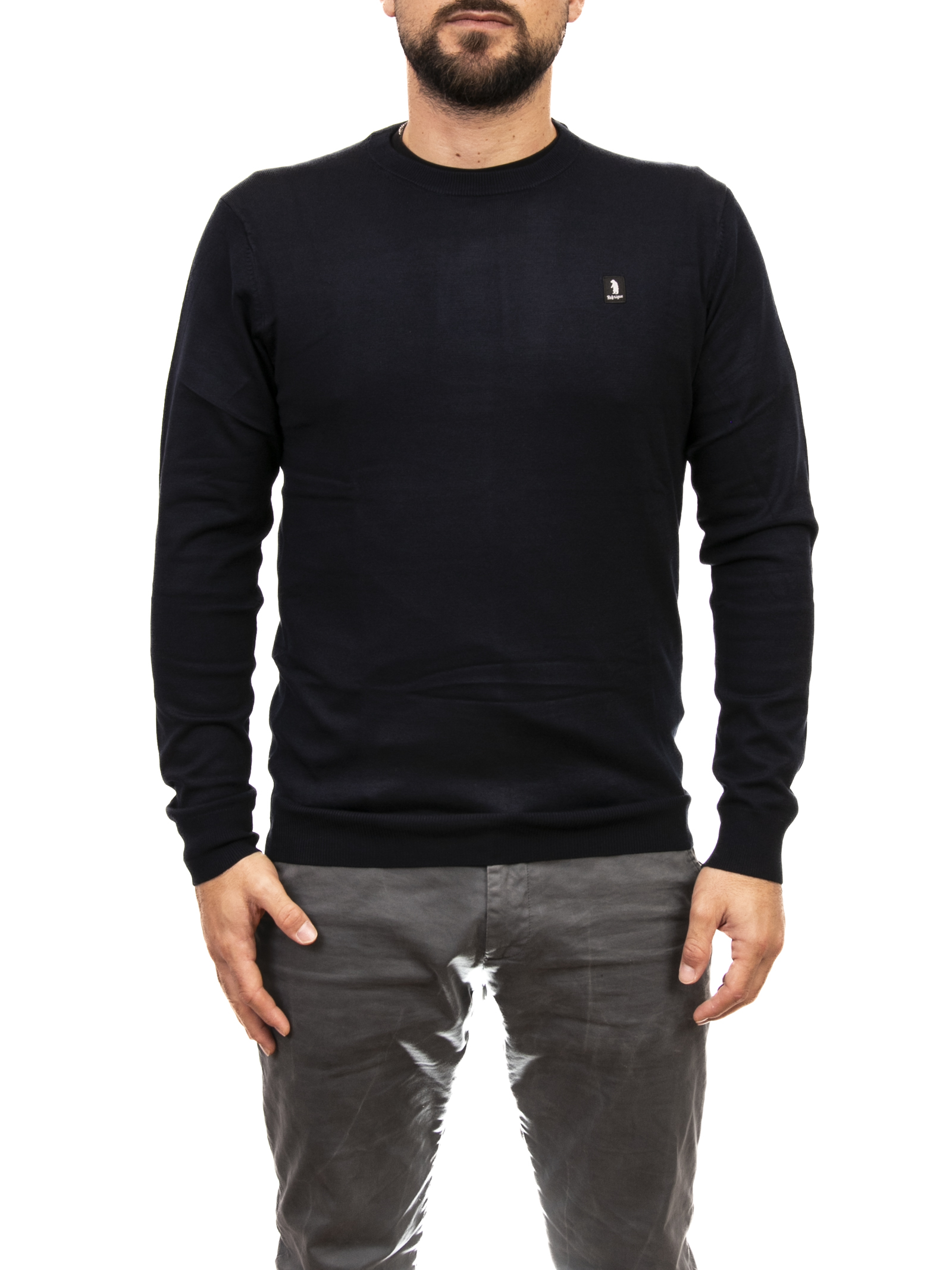 Wool sweater. Crew neck. Micro-ribbed on the neck, hem and cuffs. Side front logo patch.