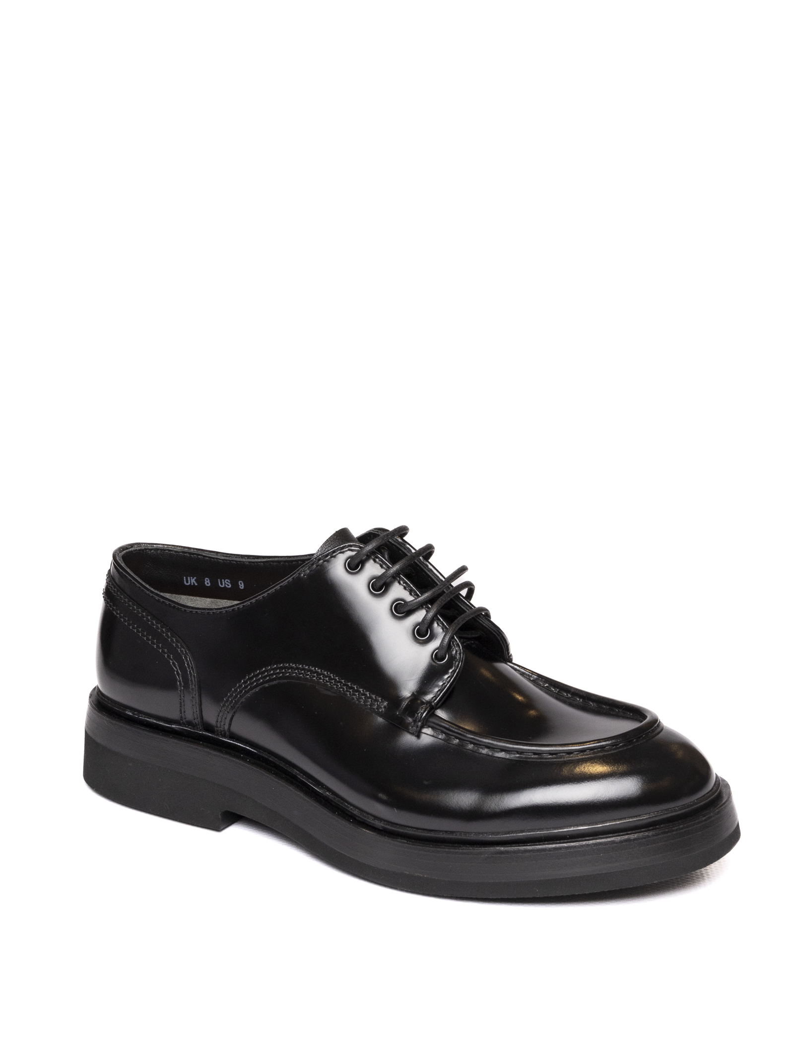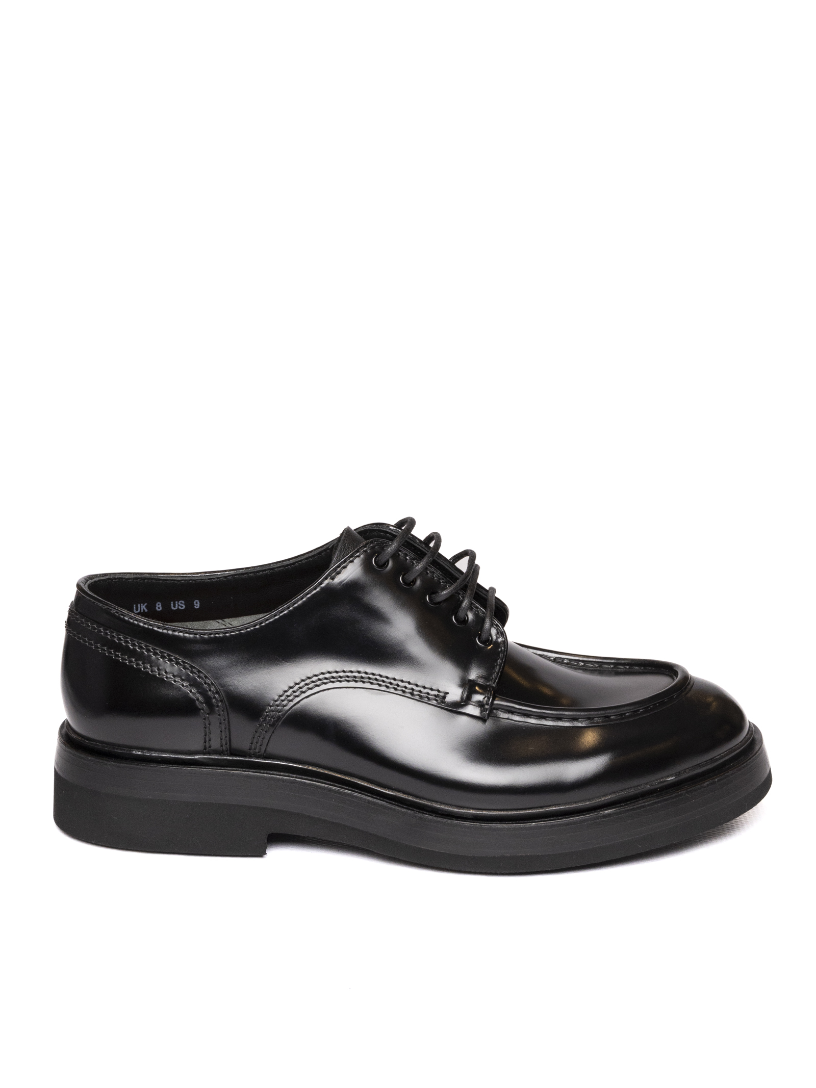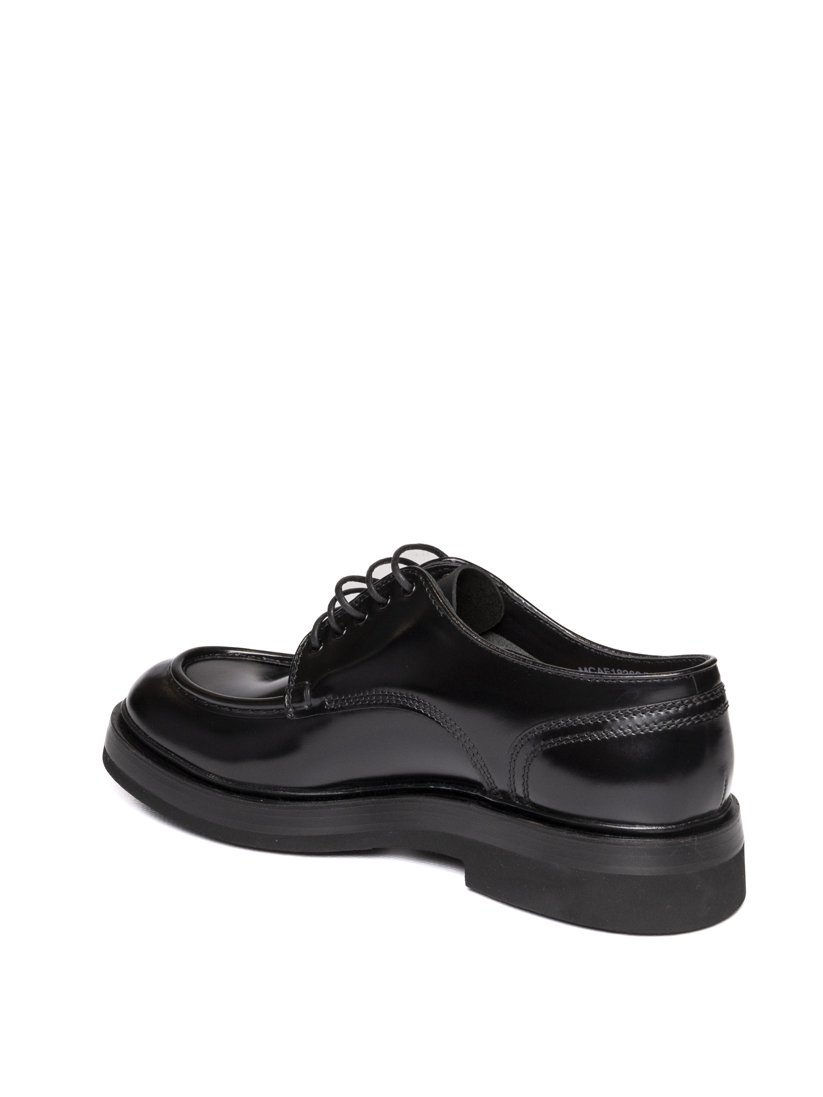 Leather lace up derby. Lace closure. Tray with raised stitching. Orange leather lining. Santoni logo imprinted on the insole. Rubber sole.