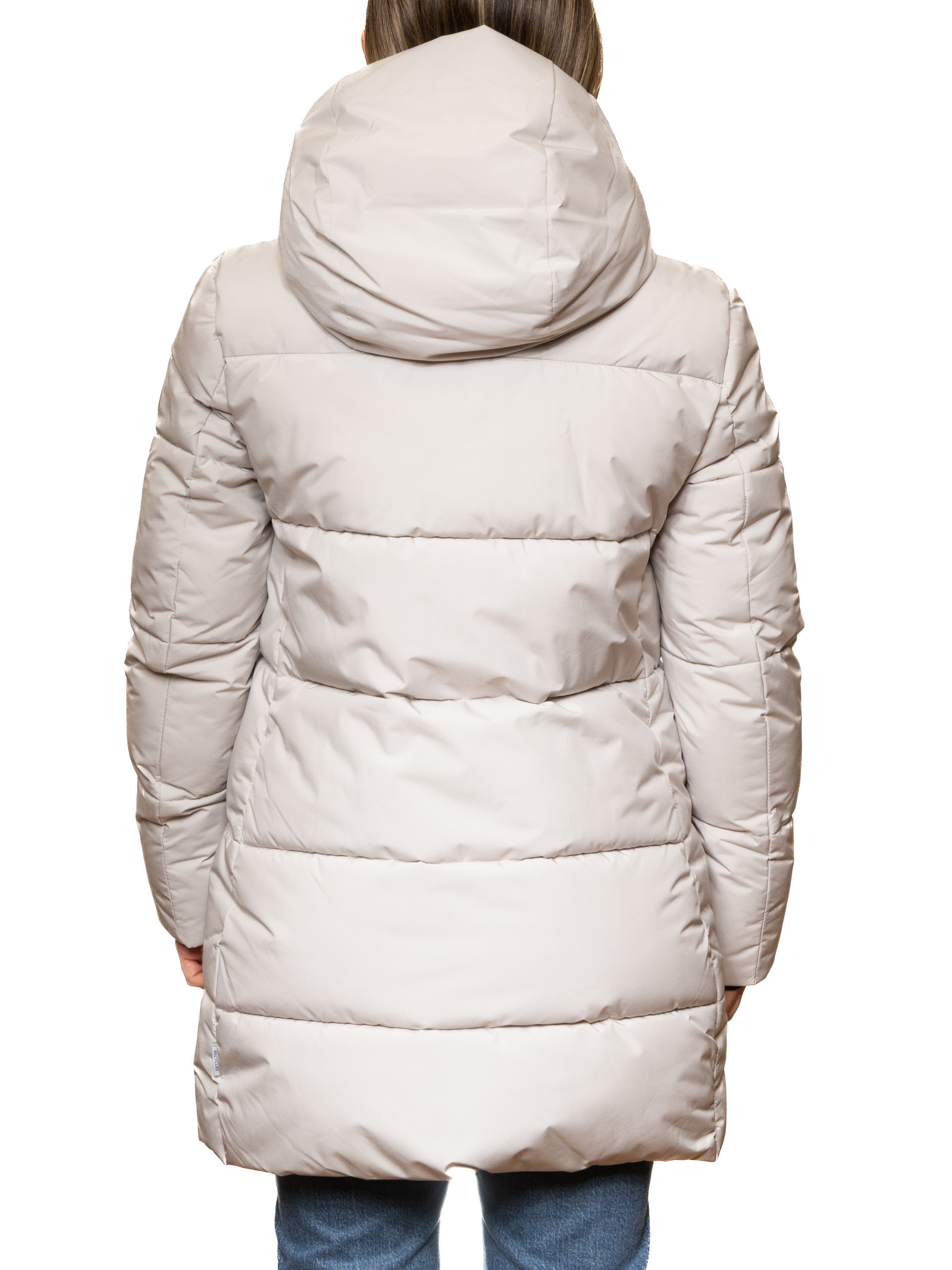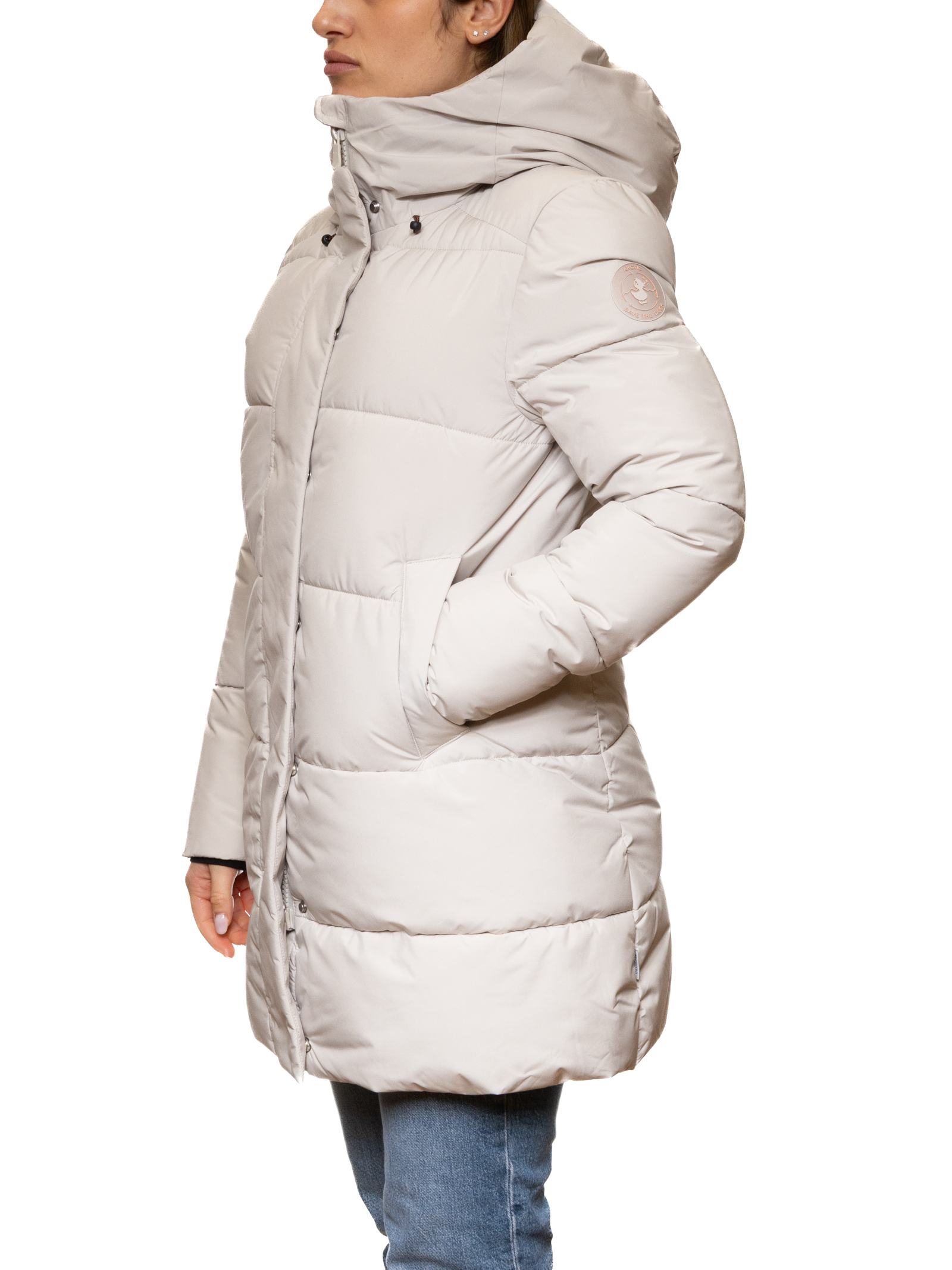 The Save The Duck women's long down jacket in beige is the ideal choice for those seeking a warm, lightweight, and refined garment.