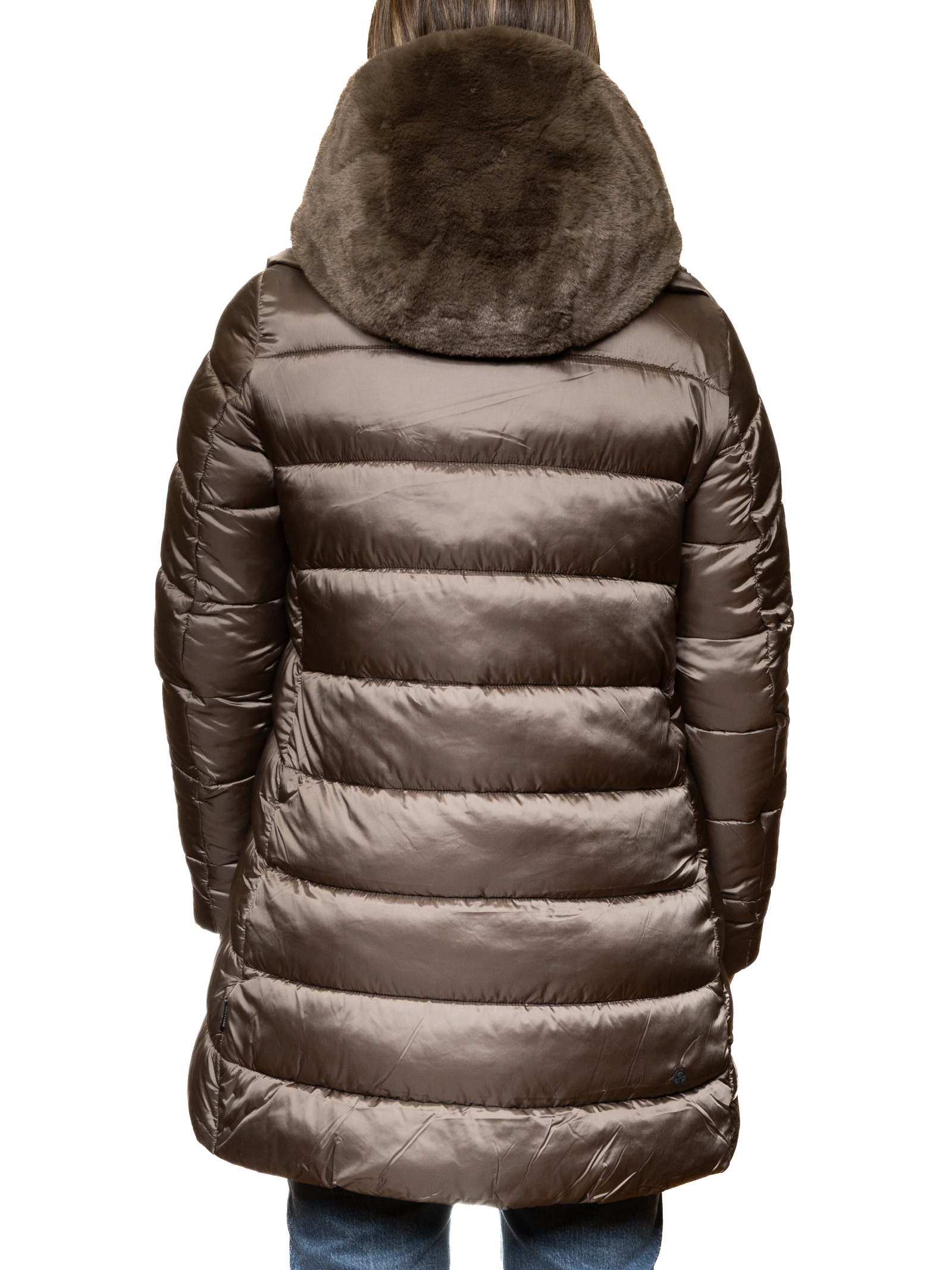 The quilted design and fitted silhouette flatter the figure, while the hood offers extra protection on colder days.