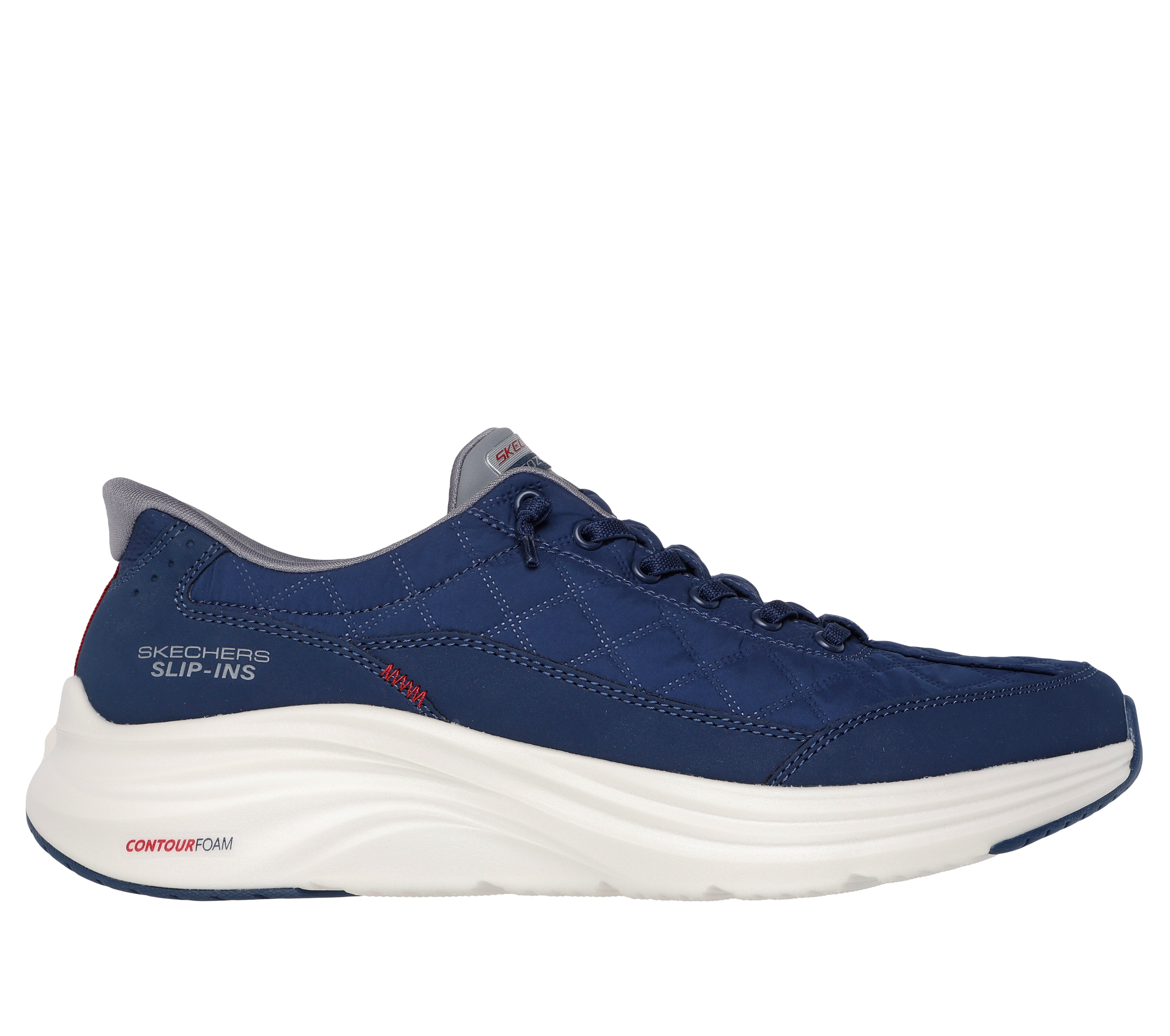Skechers Hands Free Slip-ins®: Contour Foam - Cozy Fit (Model 232619 NVY): technological excellence that redefines everyday wellness. This men's sneaker stands out with its elegant navy quilted upper, designed to provide a snug, soft, and warm feel. The revolutionary Hands Free Slip-ins® system with the exclusive Heel Pillow design allows for instant, hands-free entry, ensuring a secure and comfortable heel fit. The combination of the ultra-lightweight Contour Foam midsole and the Air-Cooled Memory Foam® insole ensures personalized cushioning that adapts to every stride, making this 100% vegan model the ideal choice for a dynamic and modern lifestyle.