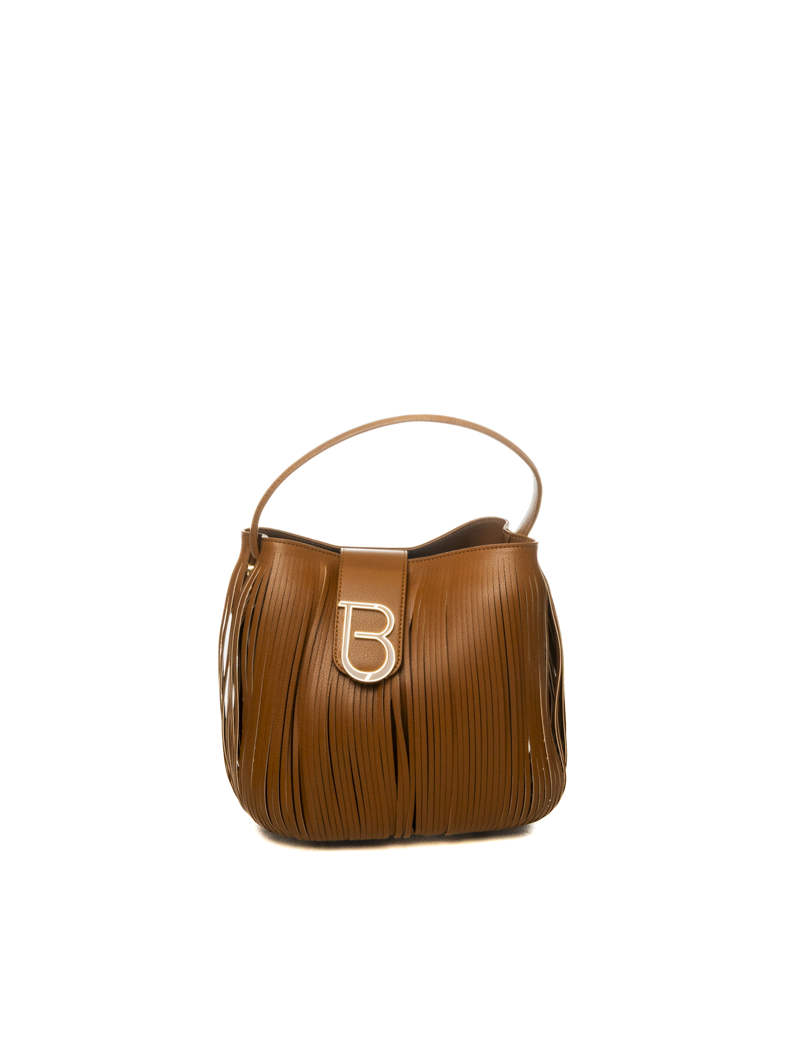 Design: Structure with applied leather fringes and a metal "B" logo on the front
