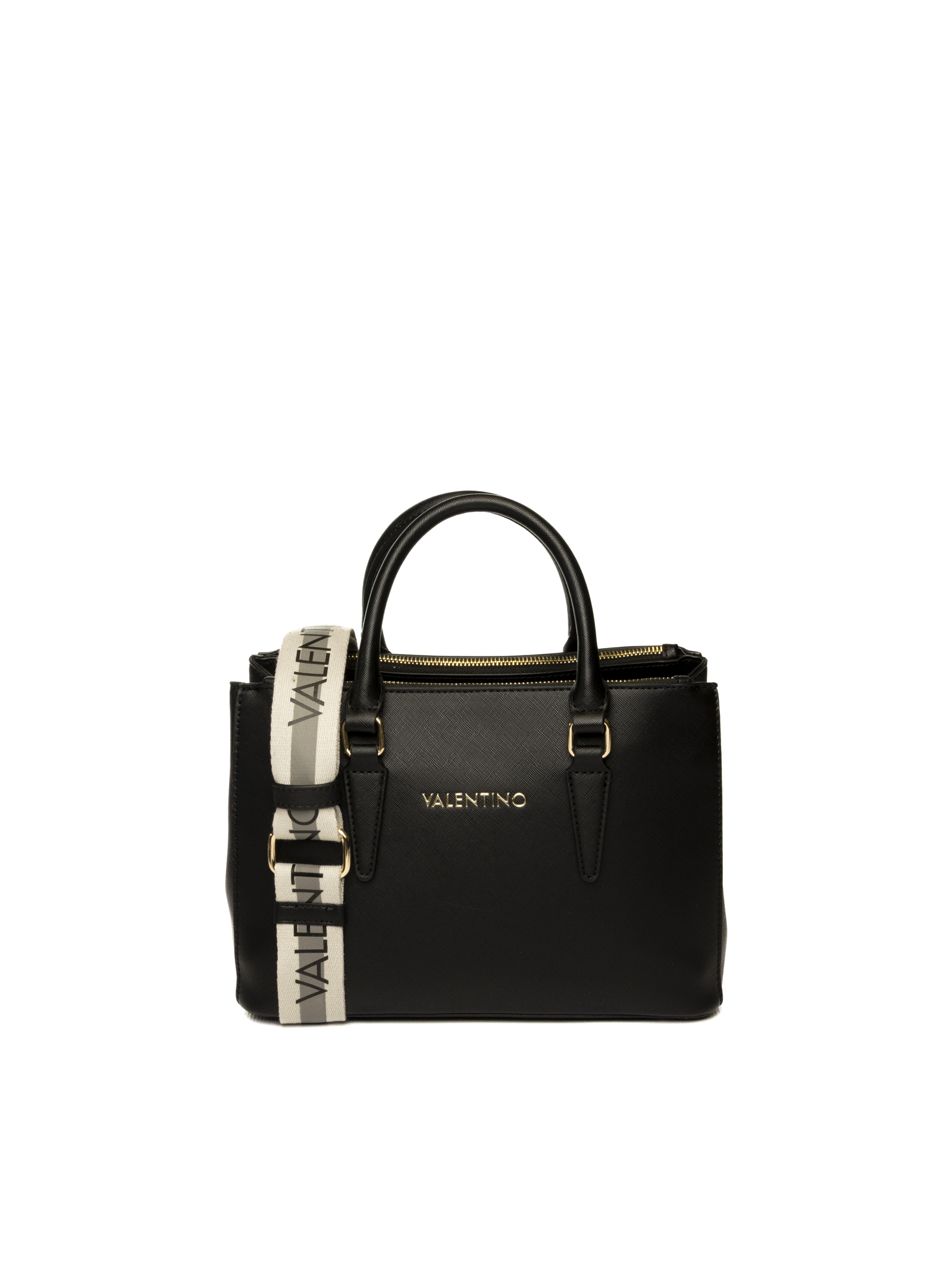 The structured and compact design is embellished with the gold Valentino logo on the front and the removable and adjustable two-tone fabric shoulder strap with logo, giving it a bold and contemporary look.
