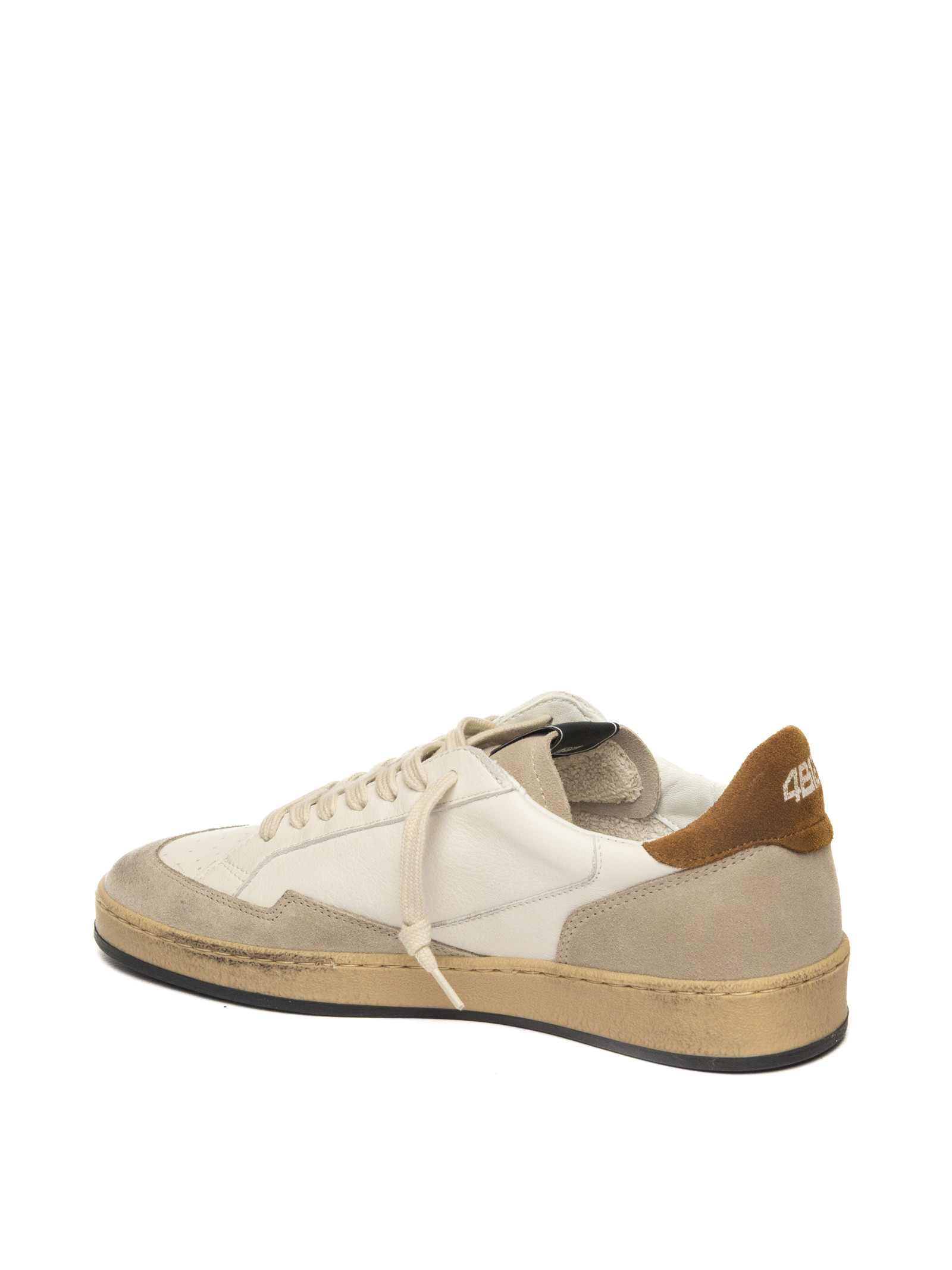 Sneakers dal fascino casual-chic firmata 4B12, realizzata in pelle liscia e camoscio premium nei toni naturali del beige e del bianco. L'armonia delle texture e il contrasto del logo laterale verde oliva conferiscono un carattere raffinato ma contemporaneo. Il tallone in pelle color caramello aggiunge una nota calda e distintiva, rendendo il modello versatile e perfetto per ogni stagione. L'interno è completamente foderato in pelle per offrire comfort e traspirabilità, mentre il sottopiede imbottito garantisce un'esperienza di camminata morbida e sostenuta. La suola in gomma beige con bordo nero rifinisce la silhouette con un tocco sportivo ma elegante.