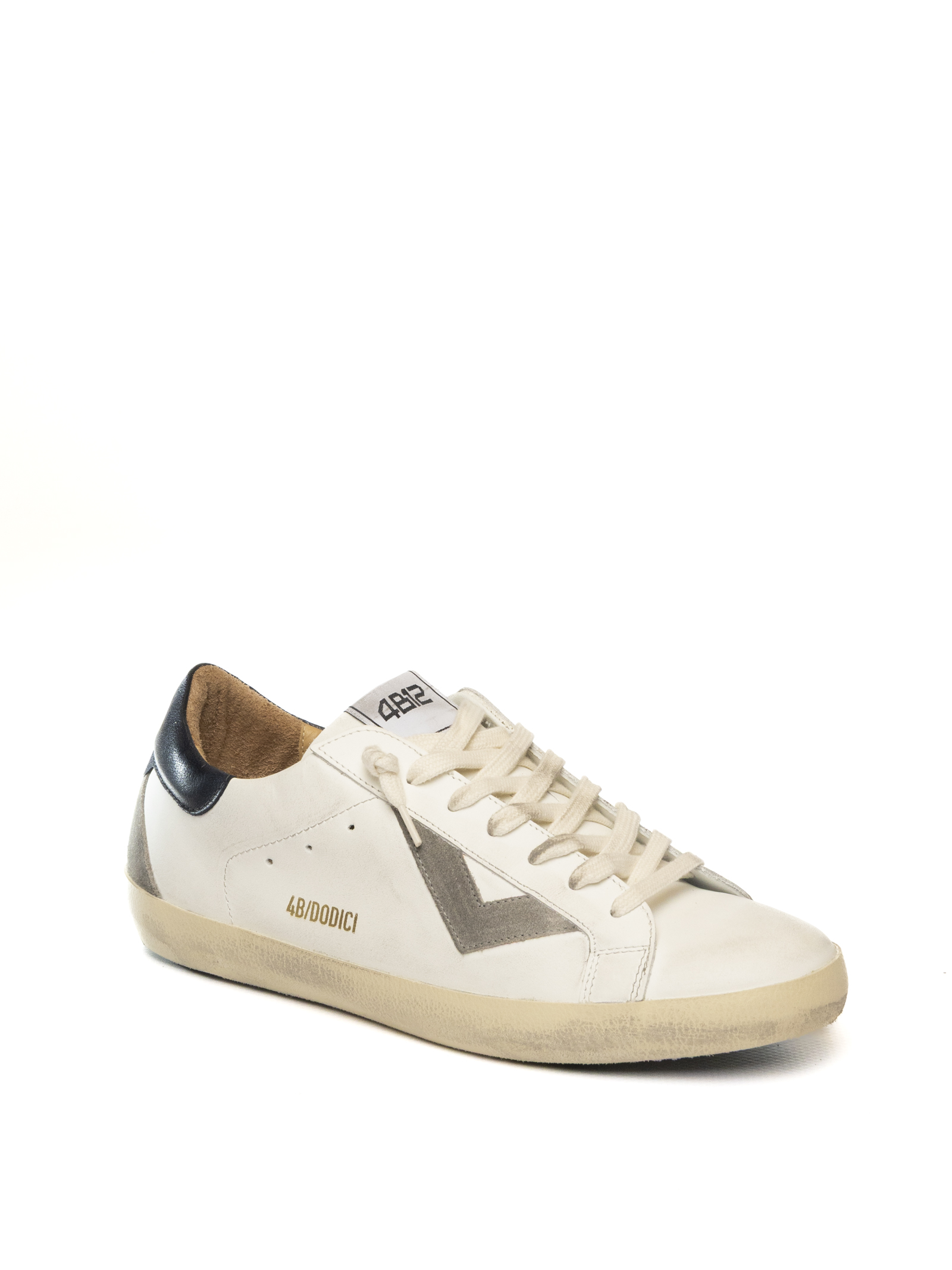 Sneakers 4B12 SUPRIME 217 dal carattere moderno e raffinato, realizzata in pelle liscia color panna con logo laterale in pelle grigio chiaro e rinforzo sul tallone in pelle nera. Il design gioca con contrasti eleganti e discreti, creando una scarpa versatile e contemporanea perfetta per l'uso quotidiano. La fodera interna in pelle naturale garantisce traspirabilità e comfort, mentre il sottopiede imbottito offre una calzata morbida e stabile. La suola beige effetto used conferisce alla sneaker un tocco vintage in perfetta armonia con lo stile artigianale tipico di 4B12.