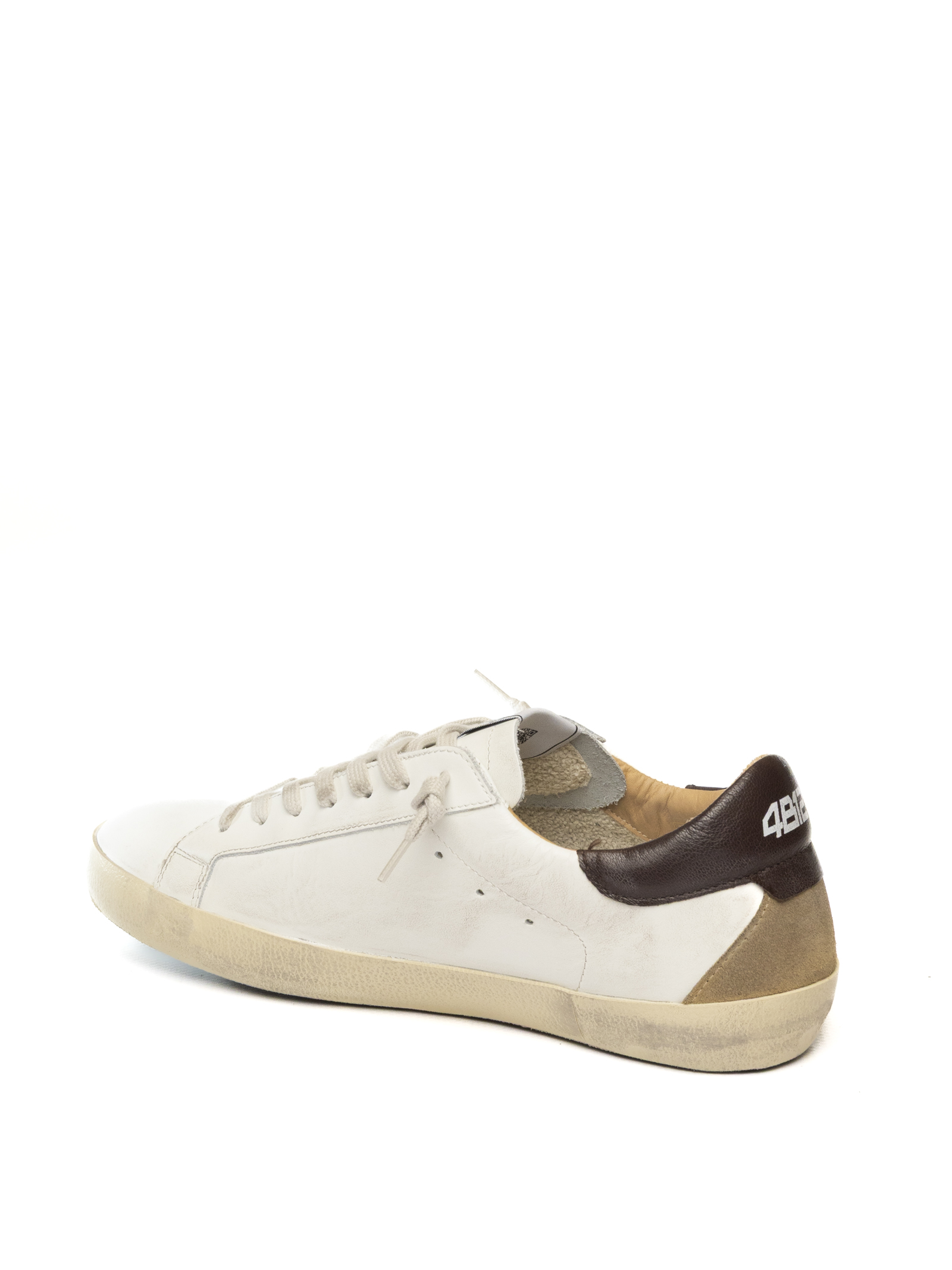 Sneakers 4B12 SUPRIME 216 dal design rétro e sofisticato, realizzata in pelle liscia color panna con logo laterale in pelle bordeaux e inserti sul tallone in pelle marrone cuoio. L'insieme dei toni caldi e delle finiture artigianali dona alla scarpa un'identità elegante ma disinvolta, perfetta per chi cerca uno stile casual con personalità. L'interno in pelle naturale assicura traspirabilità e comfort, mentre il sottopiede imbottito offre un'ammortizzazione ottimale durante la camminata. La suola beige effetto used completa il look con un tocco vintage, mantenendo la versatilità tipica del brand 4B12.