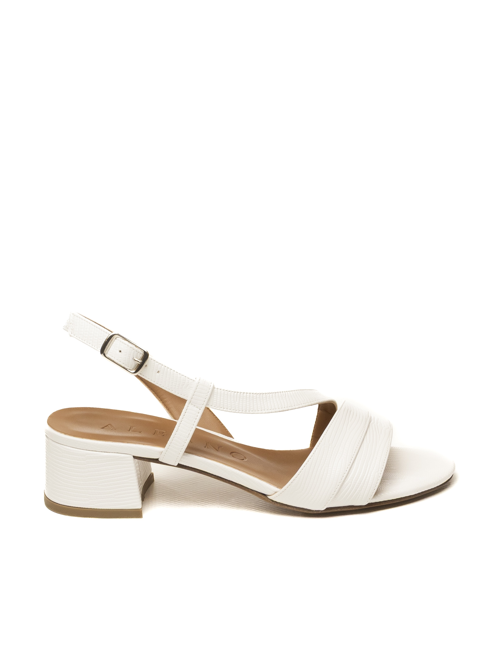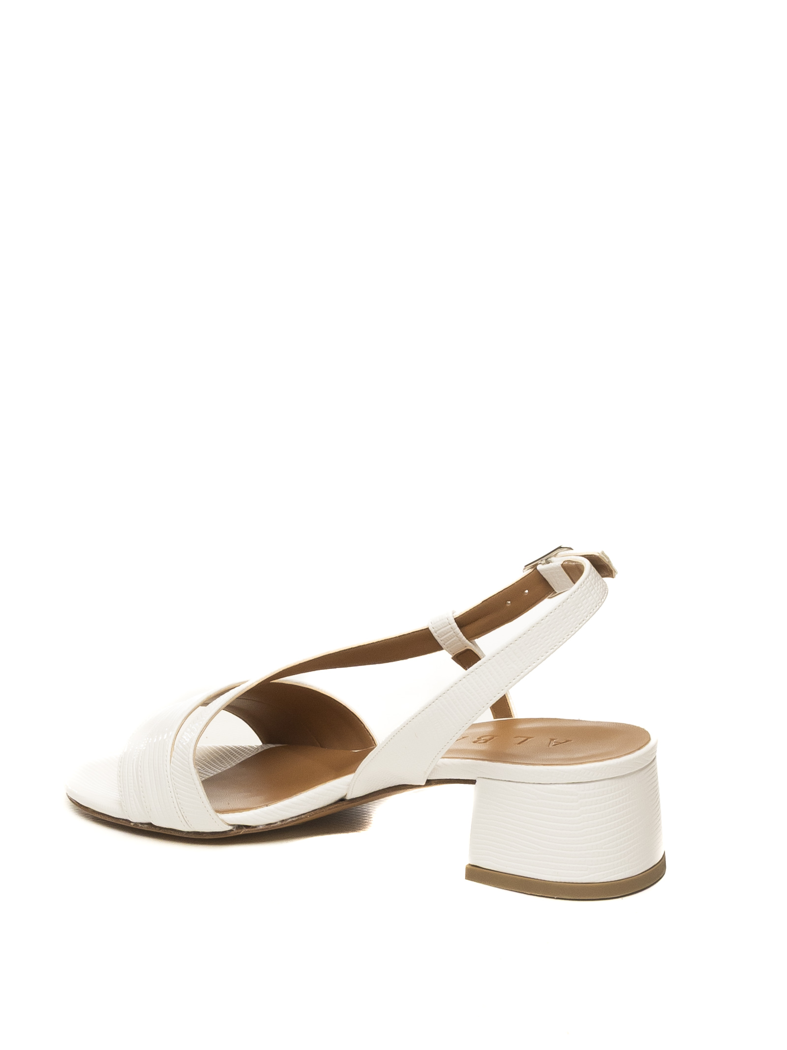 Il Sandalo Albano 421 in versione bianco che esprime una femminilità luminosa e sofisticata, impreziosita dal pellame effetto tejus, una texture raffinata che dona carattere, eleganza e personalità al design.