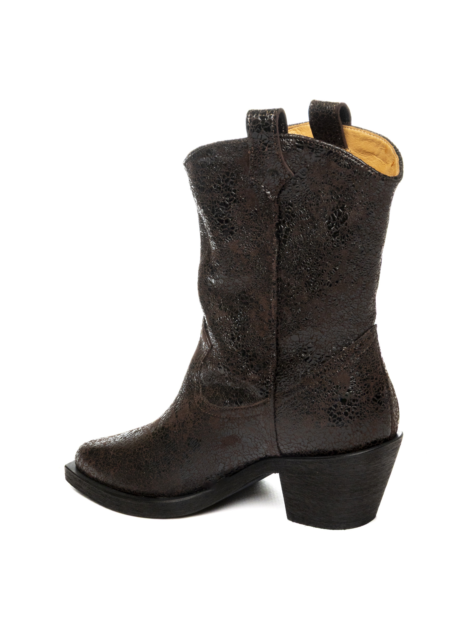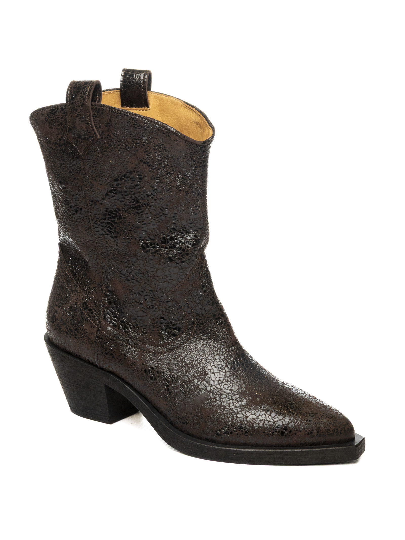 Texano in pelle effetto lucido color moro, dal carattere deciso e sofisticato.