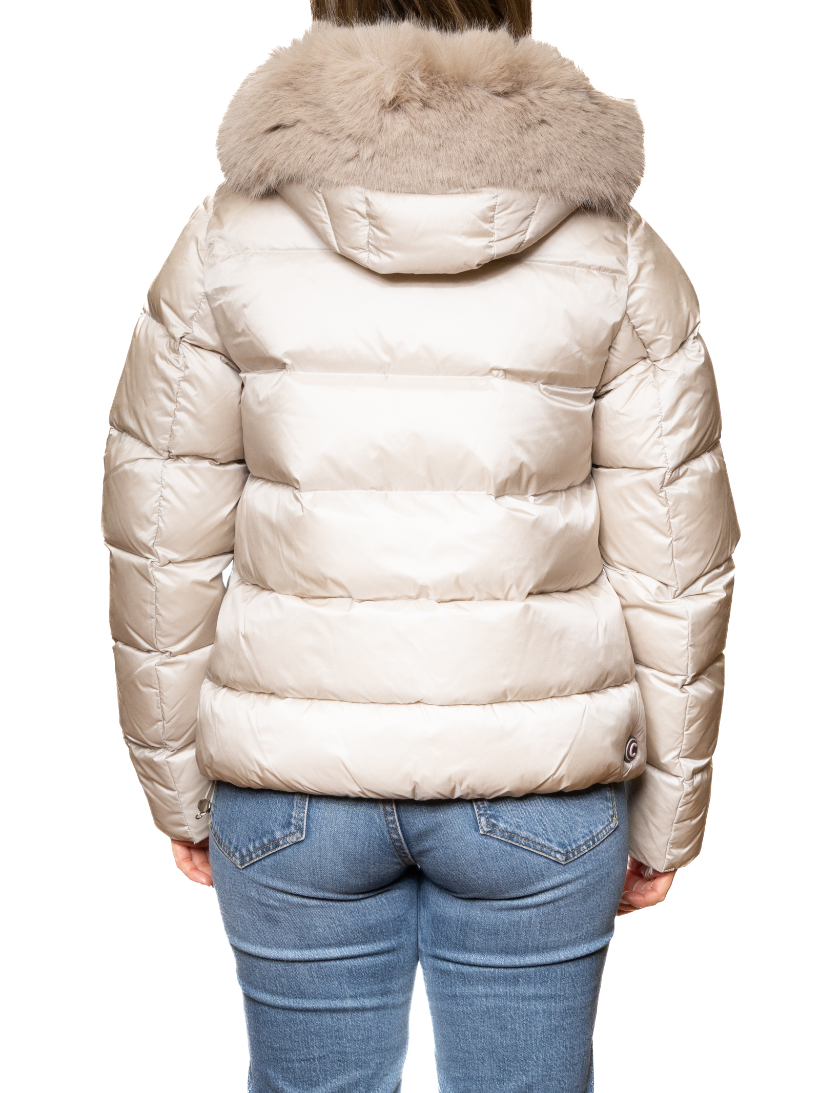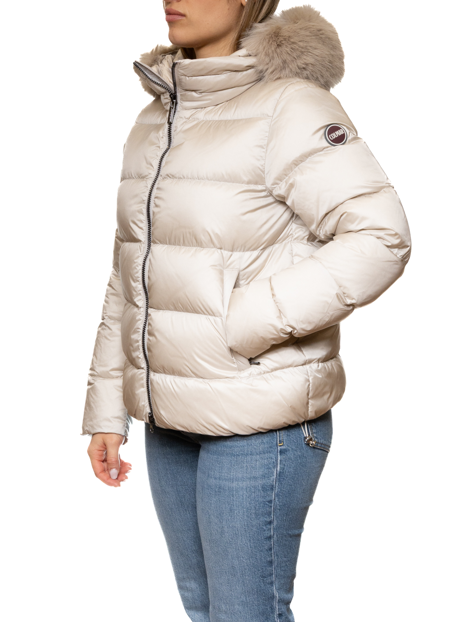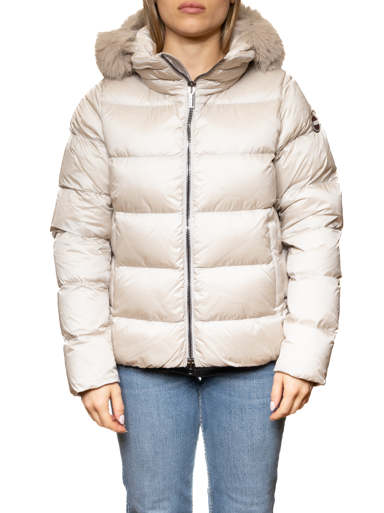 La chiusura frontale con zip garantisce praticità e comfort, mentre il cappuccio integrato arricchito da morbida pelliccia sintetica offre un riparo aggiuntivo nelle giornate più fredde, aggiungendo al contempo un dettaglio ricercato. La vestibilità regolare permette piena libertà di movimento, rendendo il piumino ideale per l' uso quotidiano.