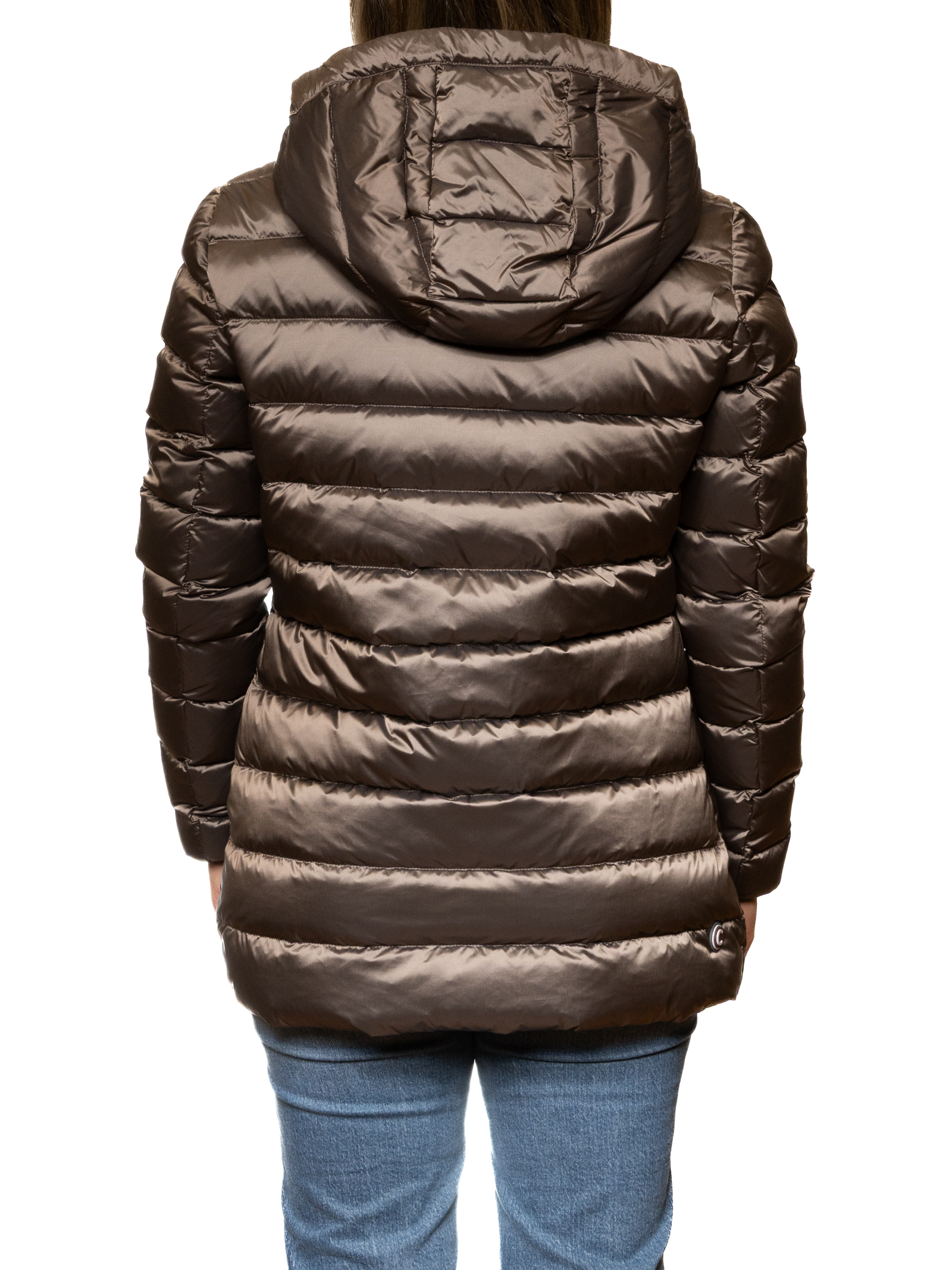 Piumino da donna dal design moderno e funzionale, ideale per affrontare la stagione fredda con un perfetto equilibrio tra stile e comfort. Realizzato con materiali leggeri e isolanti, garantisce un' ottima protezione dal freddo senza appesantire la figura. La trapuntatura orizzontale dona un look contemporaneo e valorizza la silhouette, mentre la superficie lucida aggiunge un tocco elegante e distintivo.