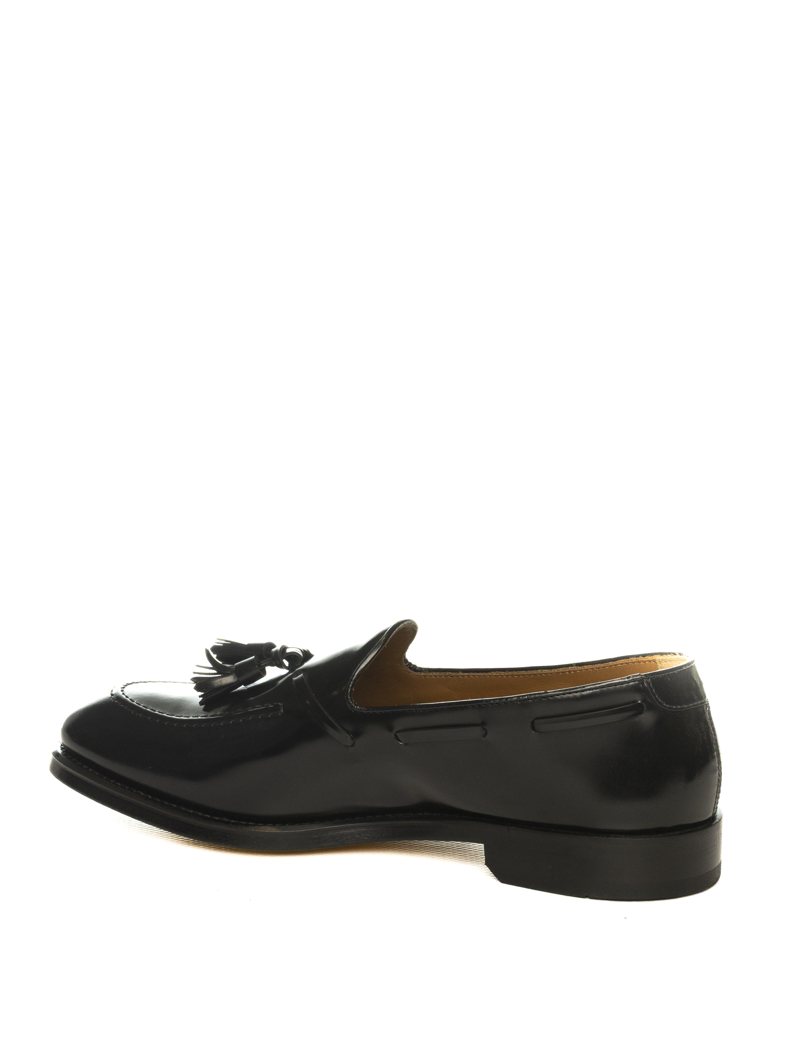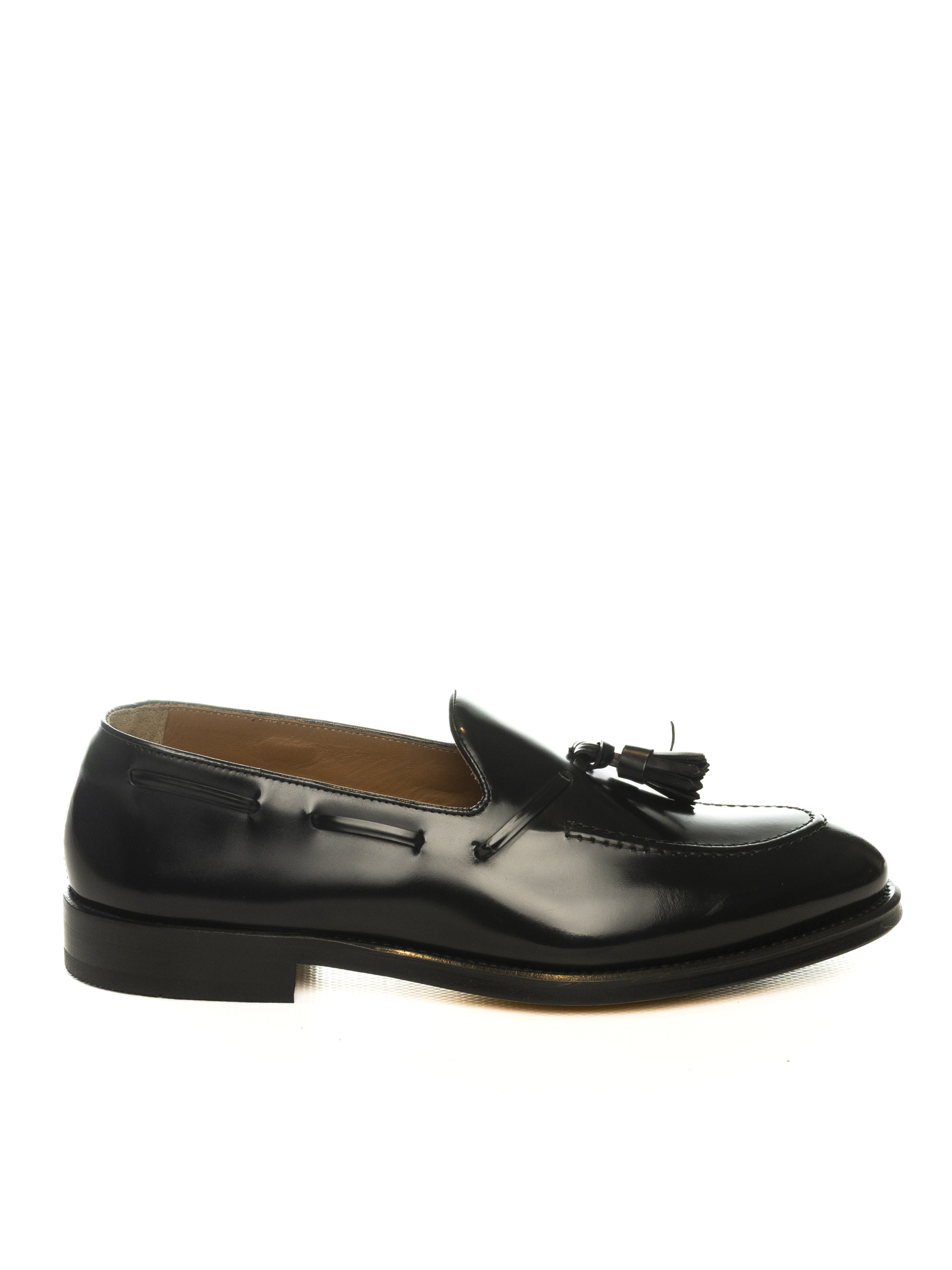 La tomaia è realizzata in pregiata pelle di vitello spazzolata di colore nero, caratterizzata da una finitura semilucida che dona profondità e lucentezza alla calzatura. La classica cucitura a vaschetta definisce la struttura della punta, mentre le nappine coordinate sul collo del piede aggiungono un dettaglio ornamentale di grande classe.
