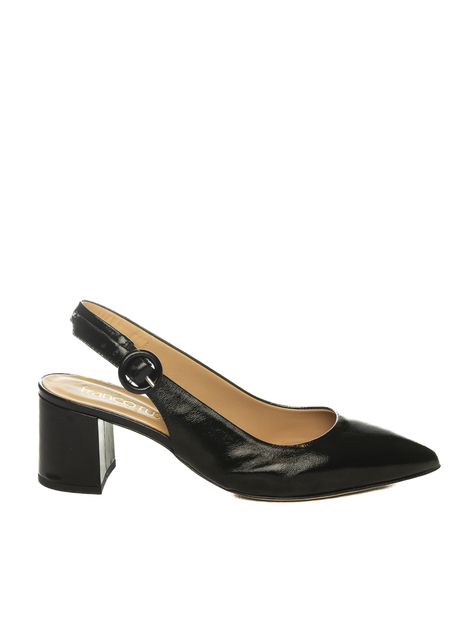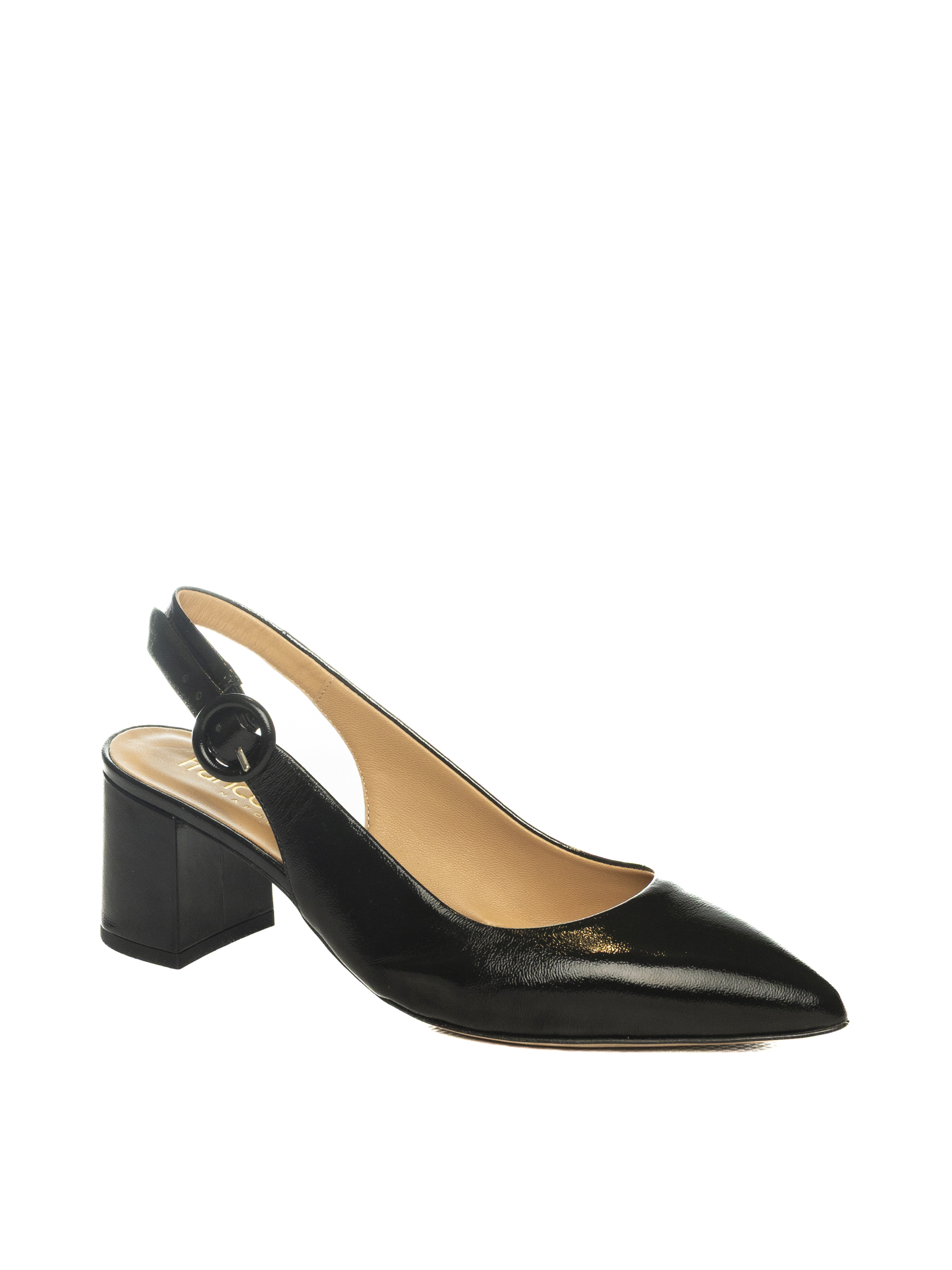 Chanel in nappa. A punta. Chiusura laterale regolabile. Sottopiede in pelle. Tacco largo. Altezza tacco 50mm. Extra comfort. Made in Italy.