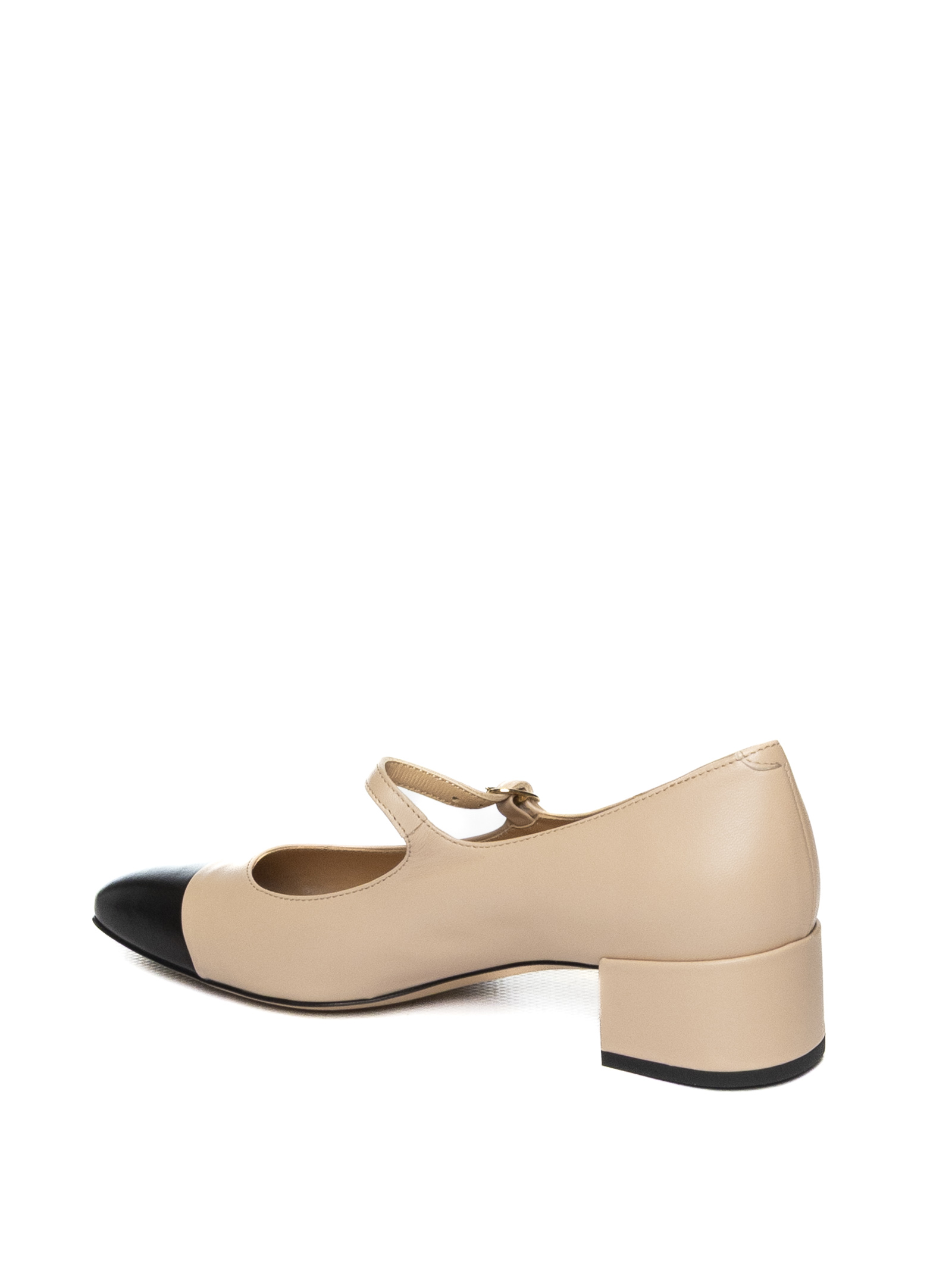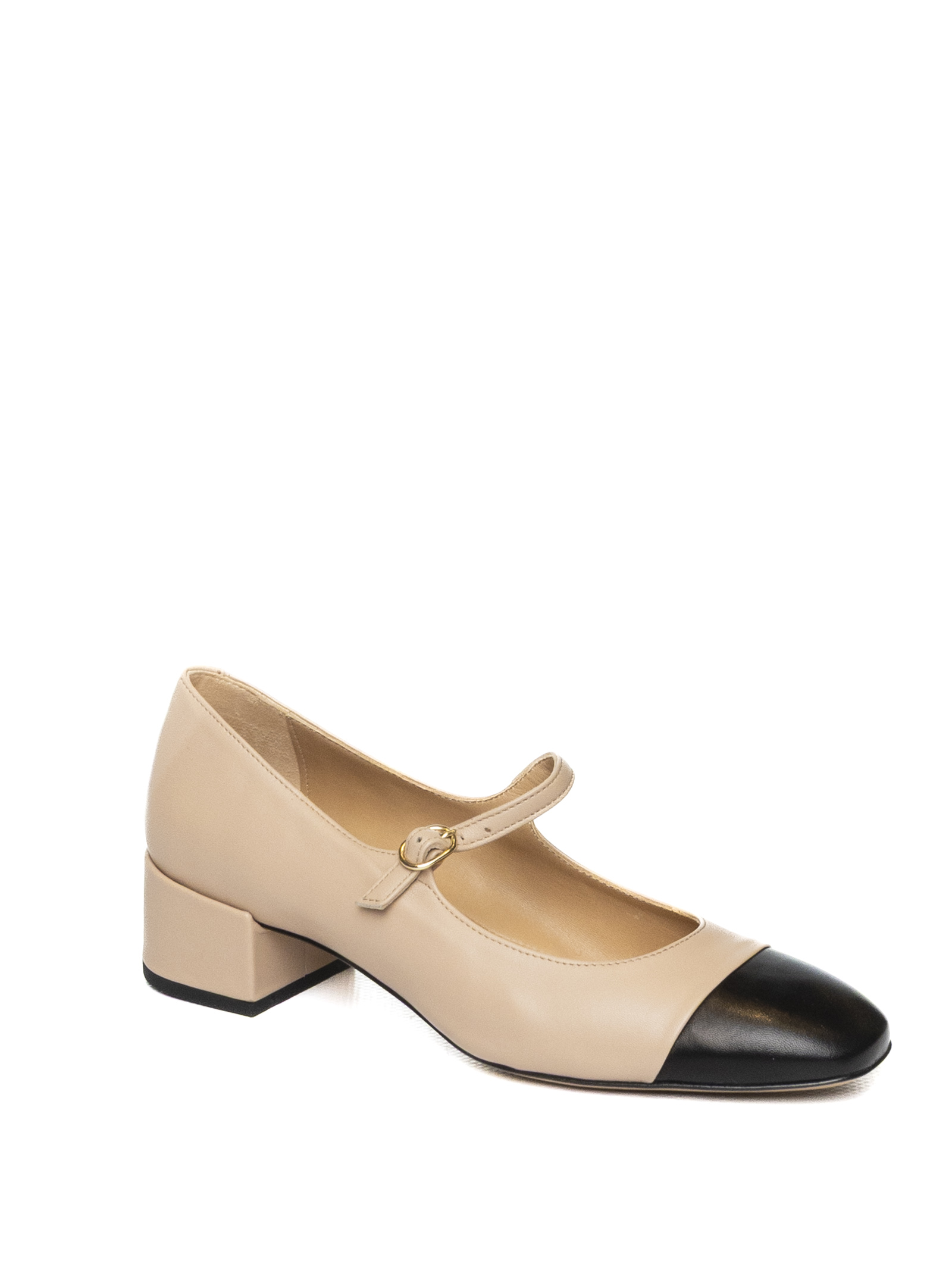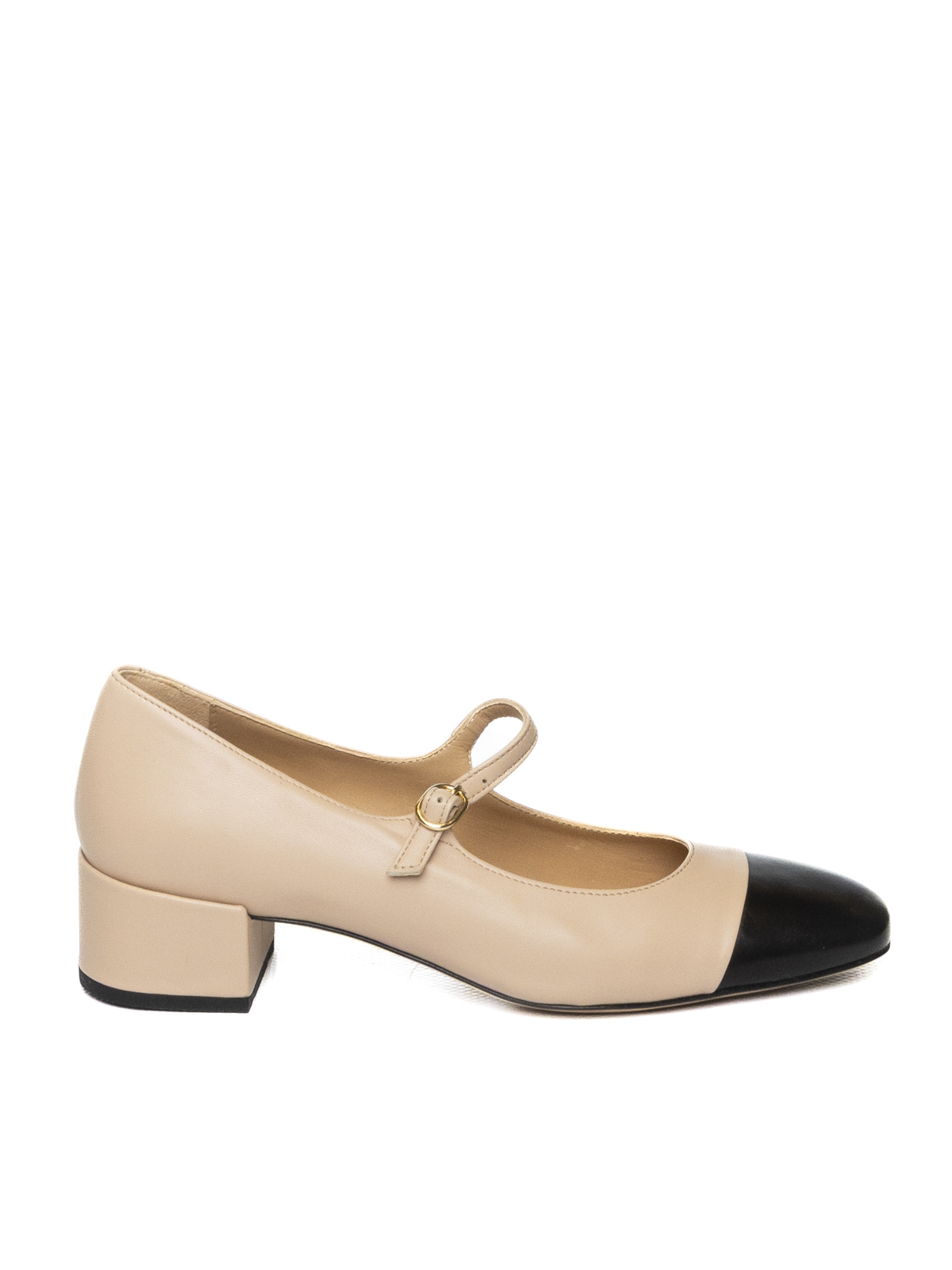 Décolleté in pelle. Cinturino collo piede. Sottopiede e fodera in pelle. Puntina a contrasto. Tacco quadrato. Tacco rivestito. Altezza tacco 30mm. Made in Italy