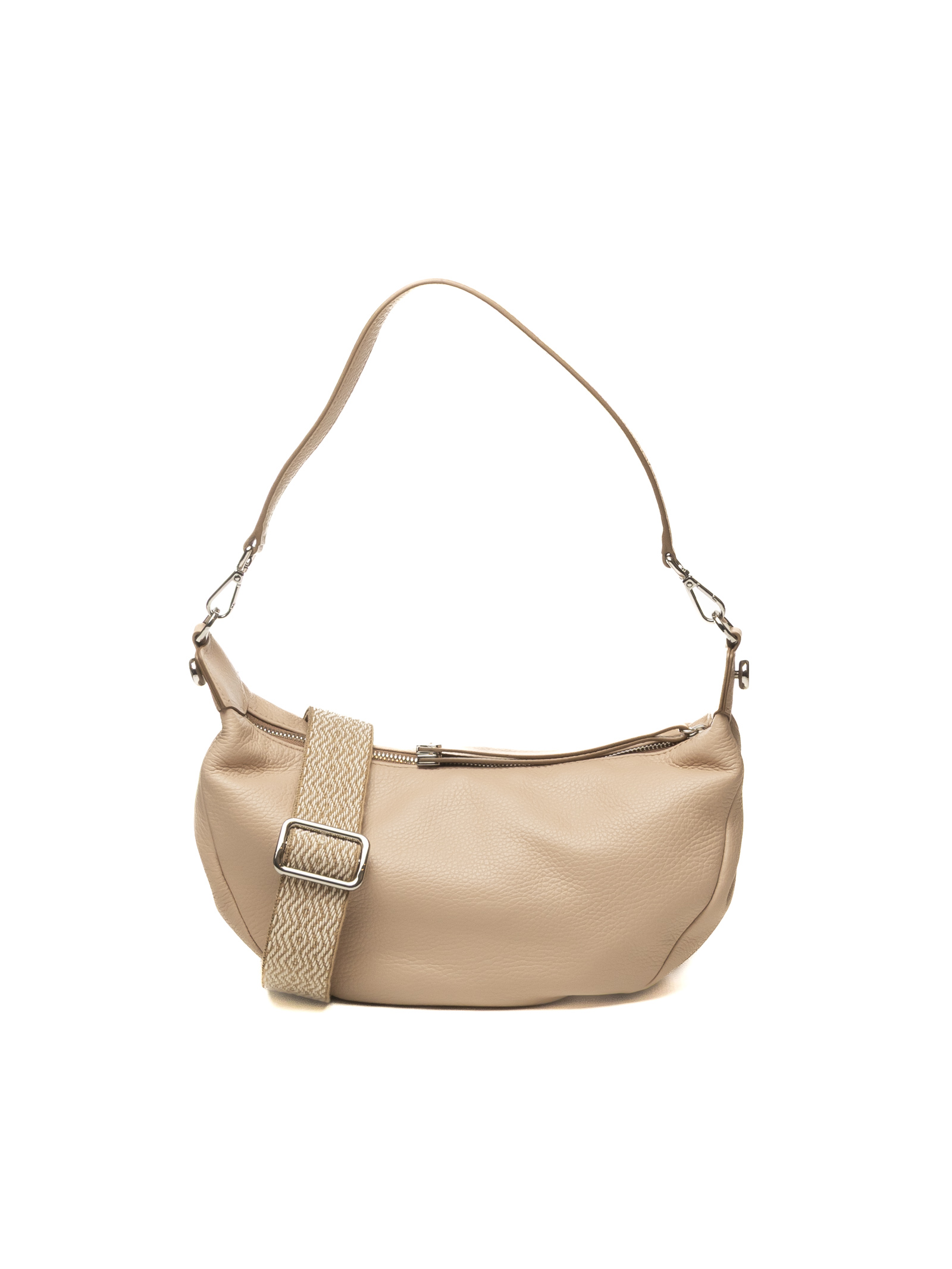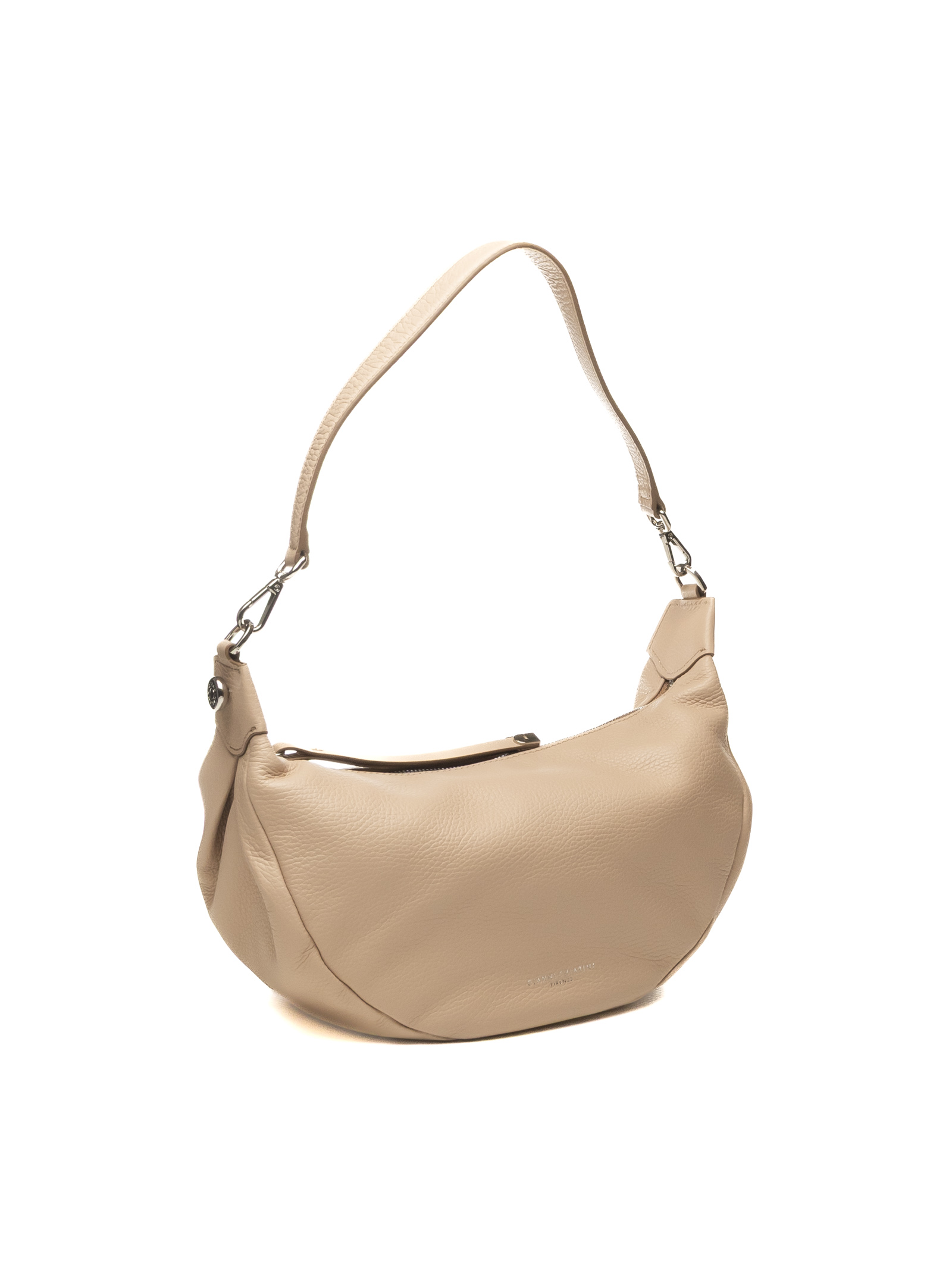 La superficie martellata conferisce profondità visiva e un effetto premium al materiale, mentre la tonalità beige rende la borsa estremamente facile da abbinare a qualsiasi palette cromatica, dalle nuance neutre ai colori più decisi.
