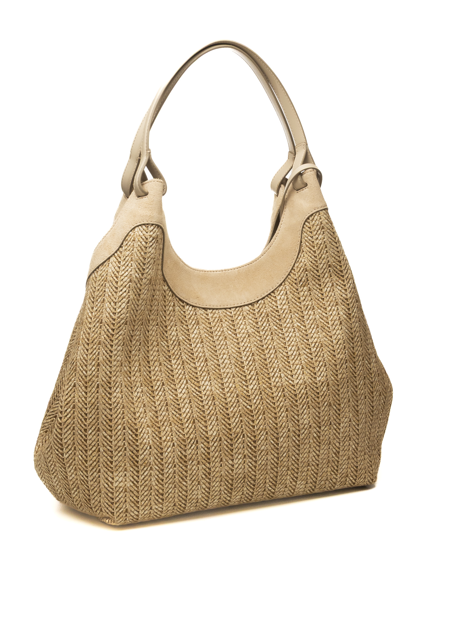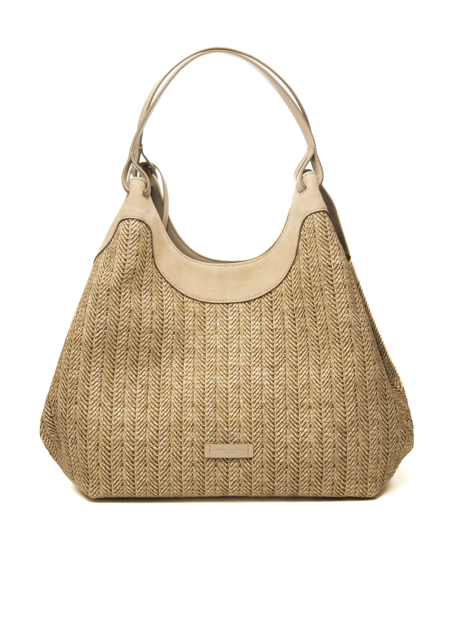 Borsa a spalla da donna dal design caldo e avvolgente, caratterizzata da una lavorazione intrecciata effetto paglia nei toni del beige che dona profondità e personalità al modello.
