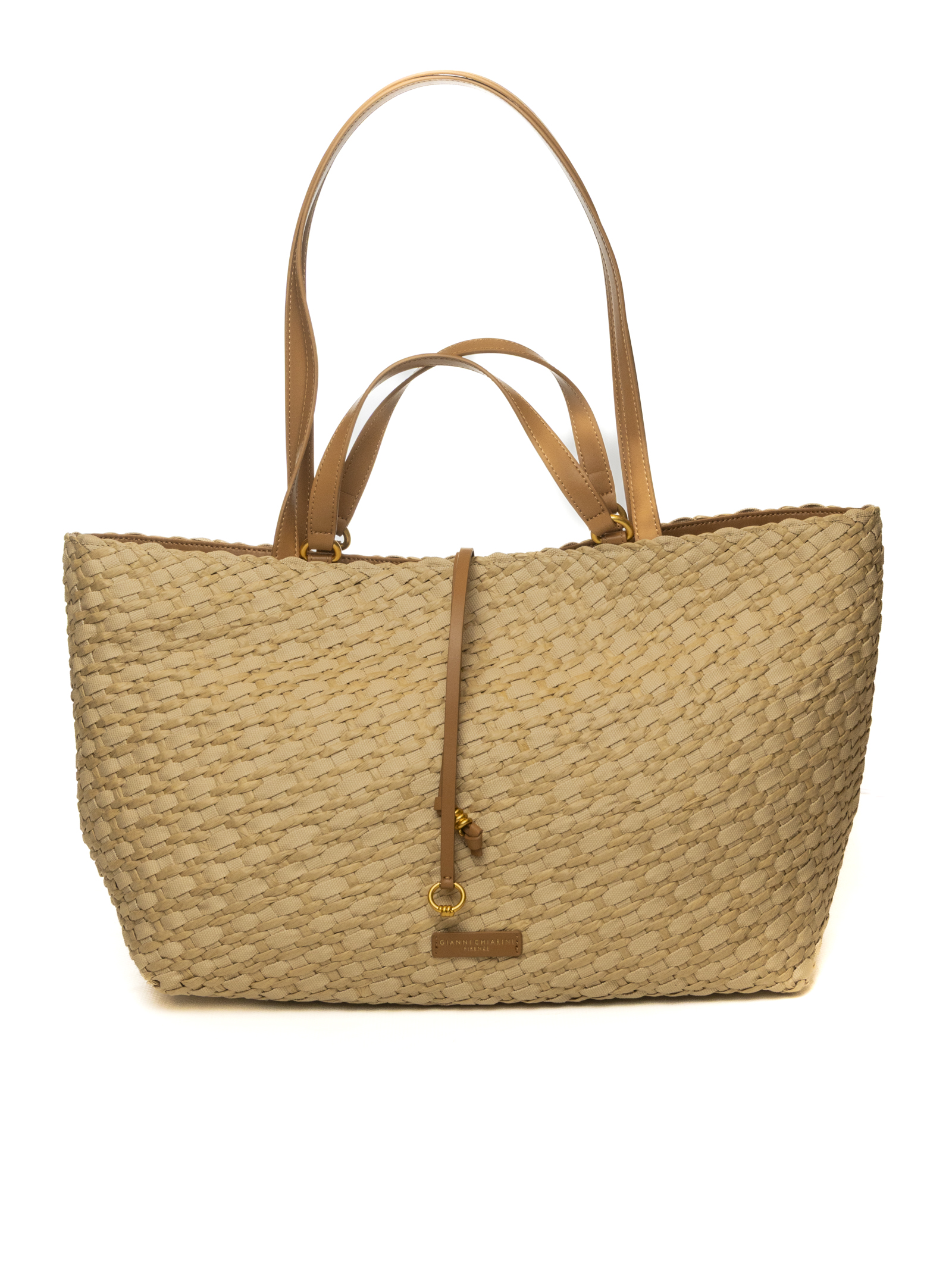 La silhouette ampia e strutturata a trapezio offre una praticità senza pari, ideale per le giornate in città o per le vacanze. Il calore della texture naturale è bilanciato con classe dai doppi manici in pelle color cuoio, progettati per garantire il massimo comfort sia nell'uso a mano che a spalla. I dettagli metallici dorati e la sottile chiusura con laccetti in pelle aggiungono un punto luce e un tocco di sicurezza al design.