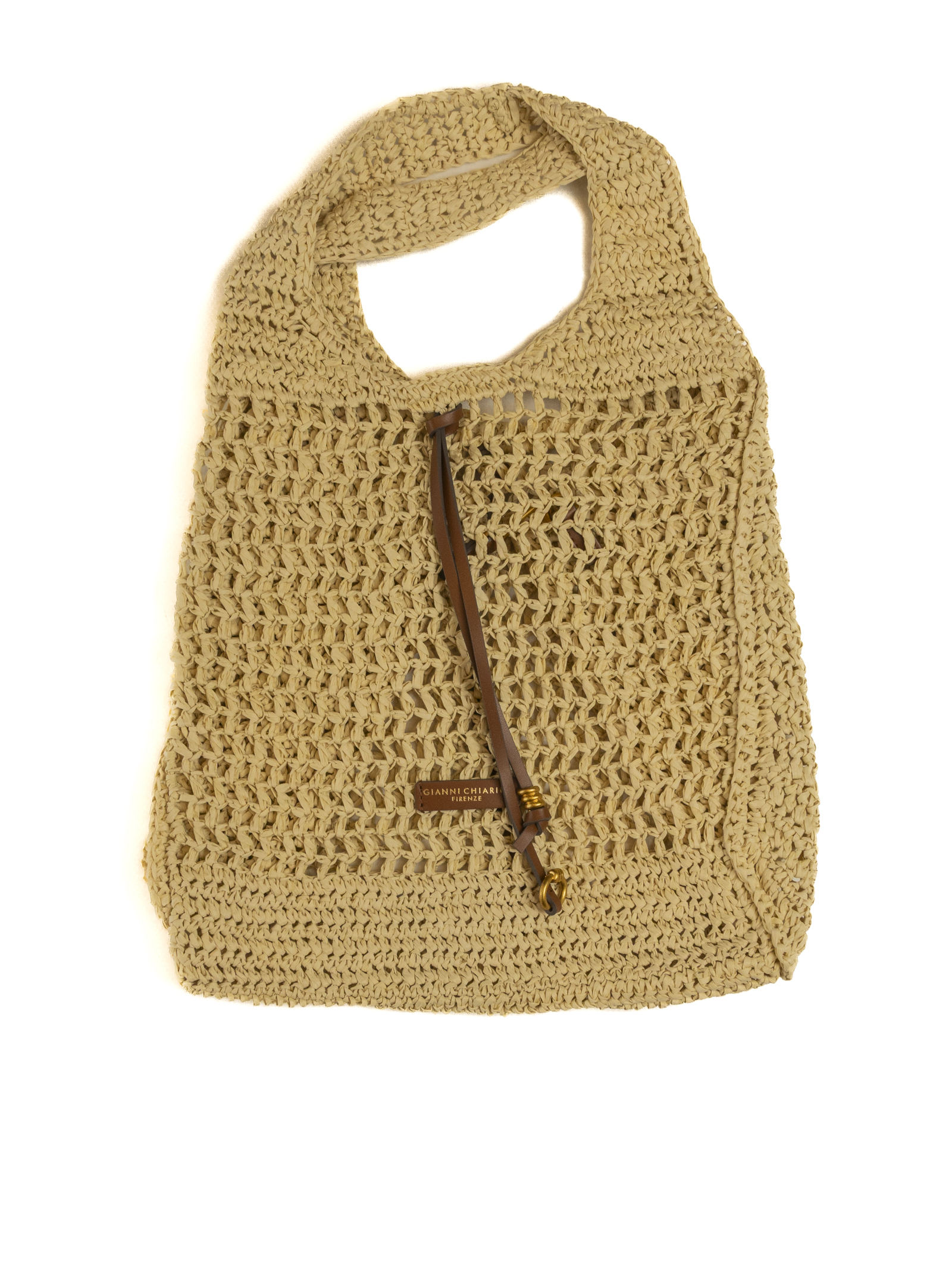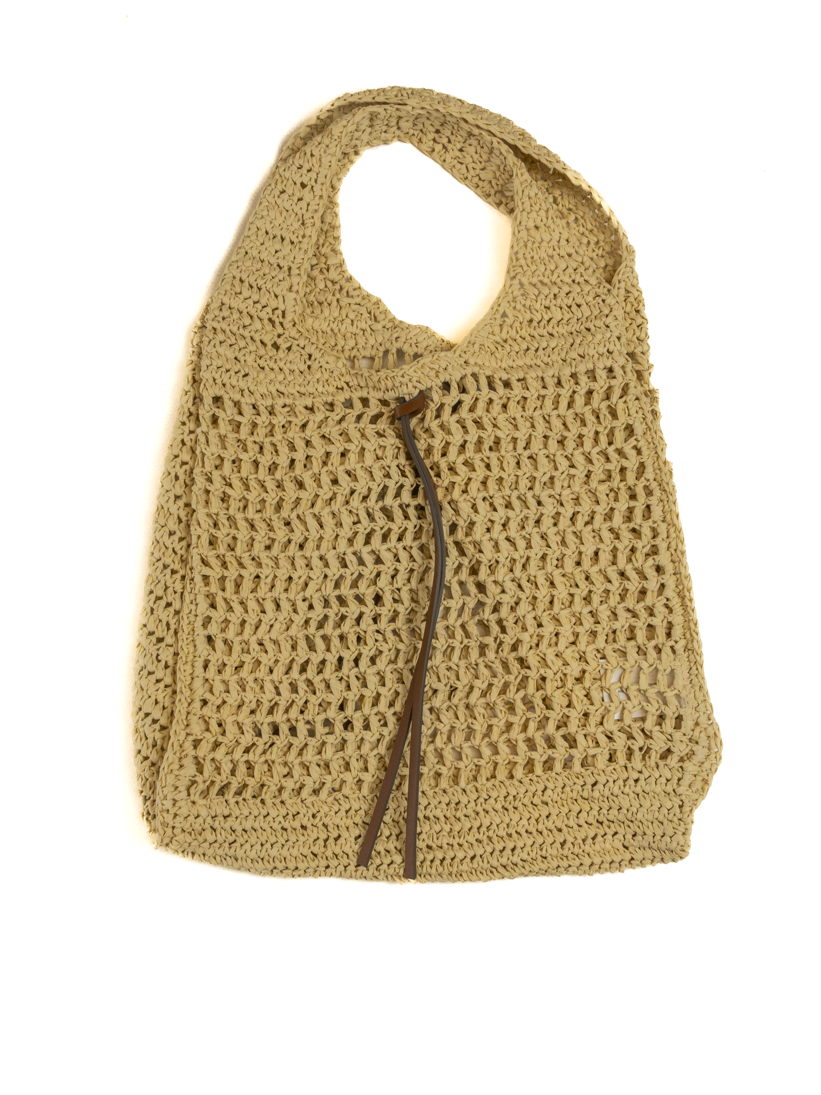 La silhouette a trapezio è definita da un intreccio a trama aperta che crea un sofisticato effetto semitrasparente e una texture ricca al tatto. La tonalità corda (beige) conferisce alla borsa un'allure neutra e senza tempo, perfettamente bilanciata dai dettagli in pelle color cuoio e dai lacci di chiusura regolabili che aggiungono un tocco di carattere e stile contemporaneo.