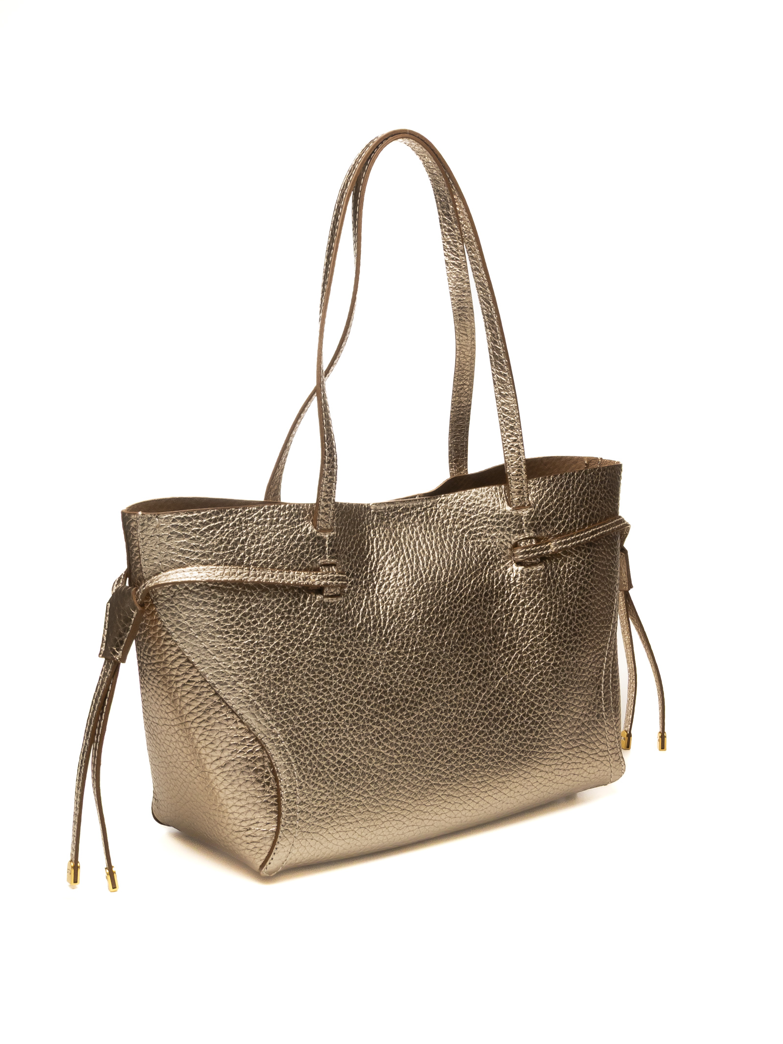 Le linee pulite e bilanciate valorizzano la forma della borsa, mentre la texture martellata dona profondità visiva e un' estetica premium. I manici lunghi permettono una portabilità comoda sia a spalla che a mano, garantendo praticità in ogni situazione. I laccetti laterali regolabili aggiungono un dettaglio di stile e permettono di modulare leggermente il volume della borsa, rendendola ancora più funzionale.
