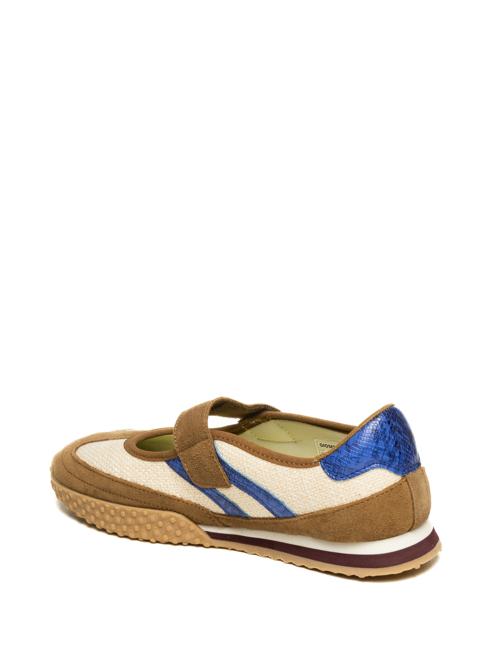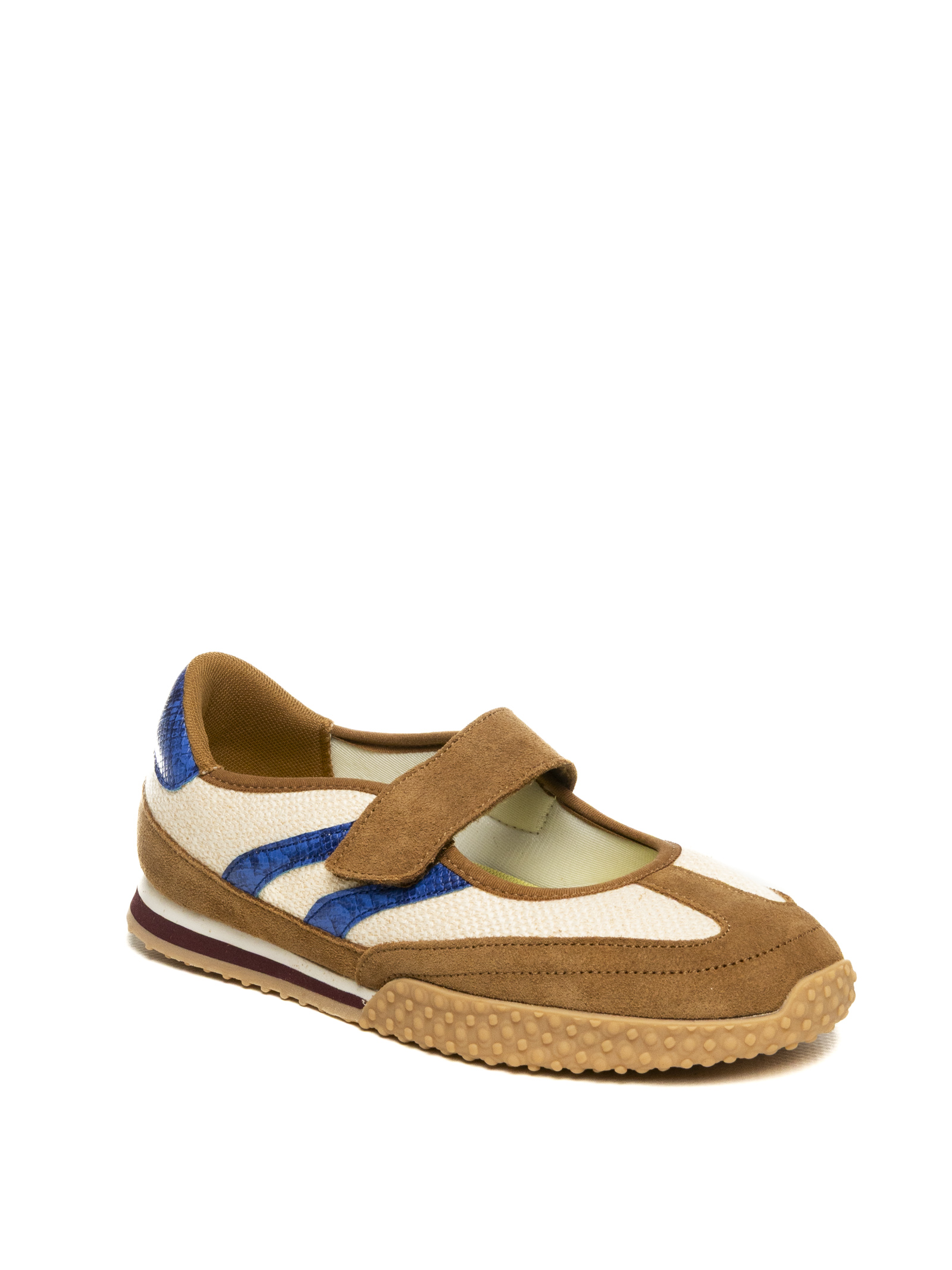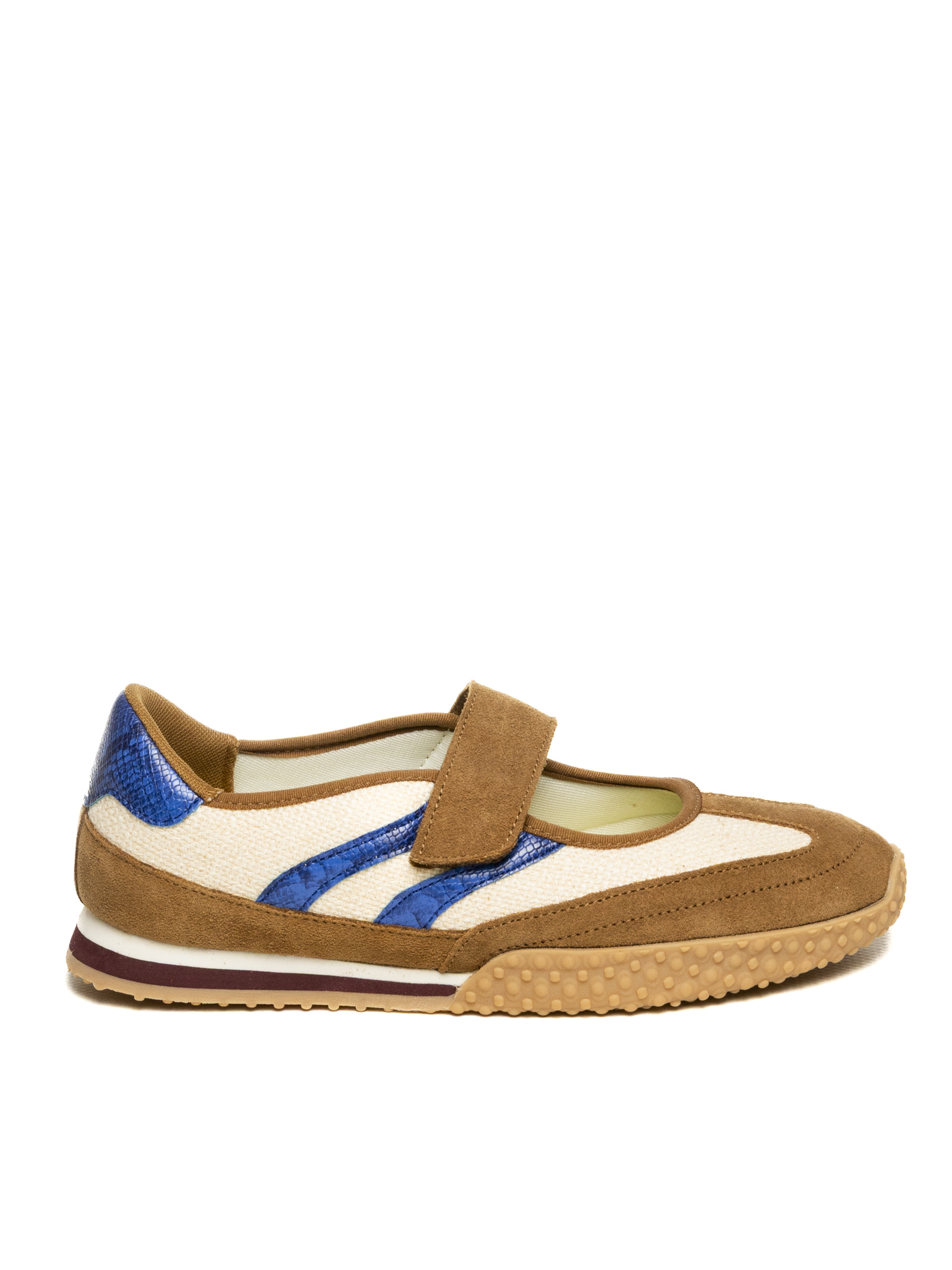 La tomaia è realizzata in un ricercato mix di materiali naturali e tecnici: una base in fresco tessuto di lino beige si sposa con inserti in morbida pelle scamosciata color cammello sulla punta e sul tallone. Il design è vivacizzato dalle iconiche strisce laterali e dal talloncino in pelle laminata blu elettrico con effetto pitonato, che conferiscono alla scarpa un carattere deciso e glamour. La chiusura con singolo cinturino a strappo (velcro) assicura una calzata rapida, stabile e personalizzata.