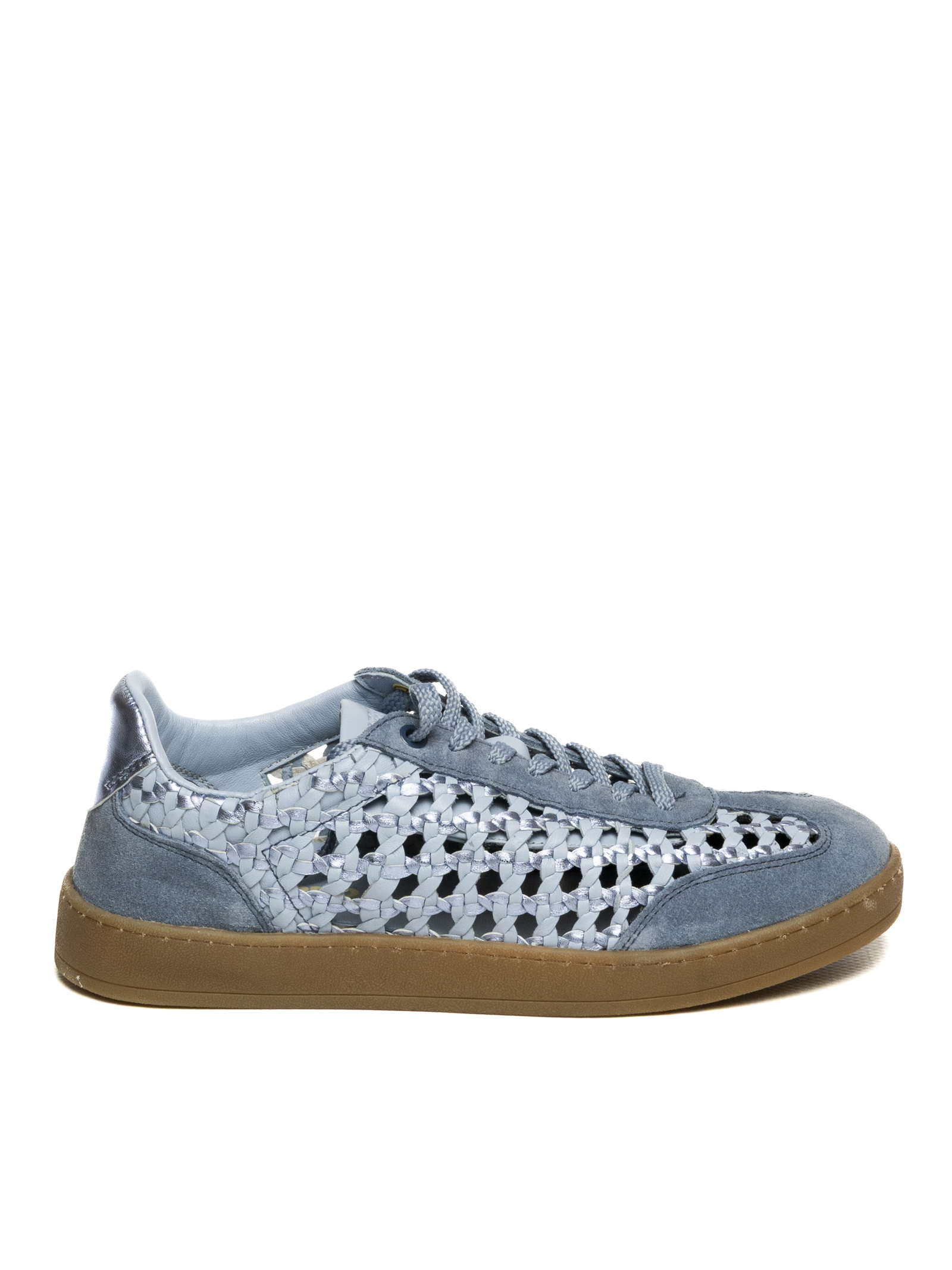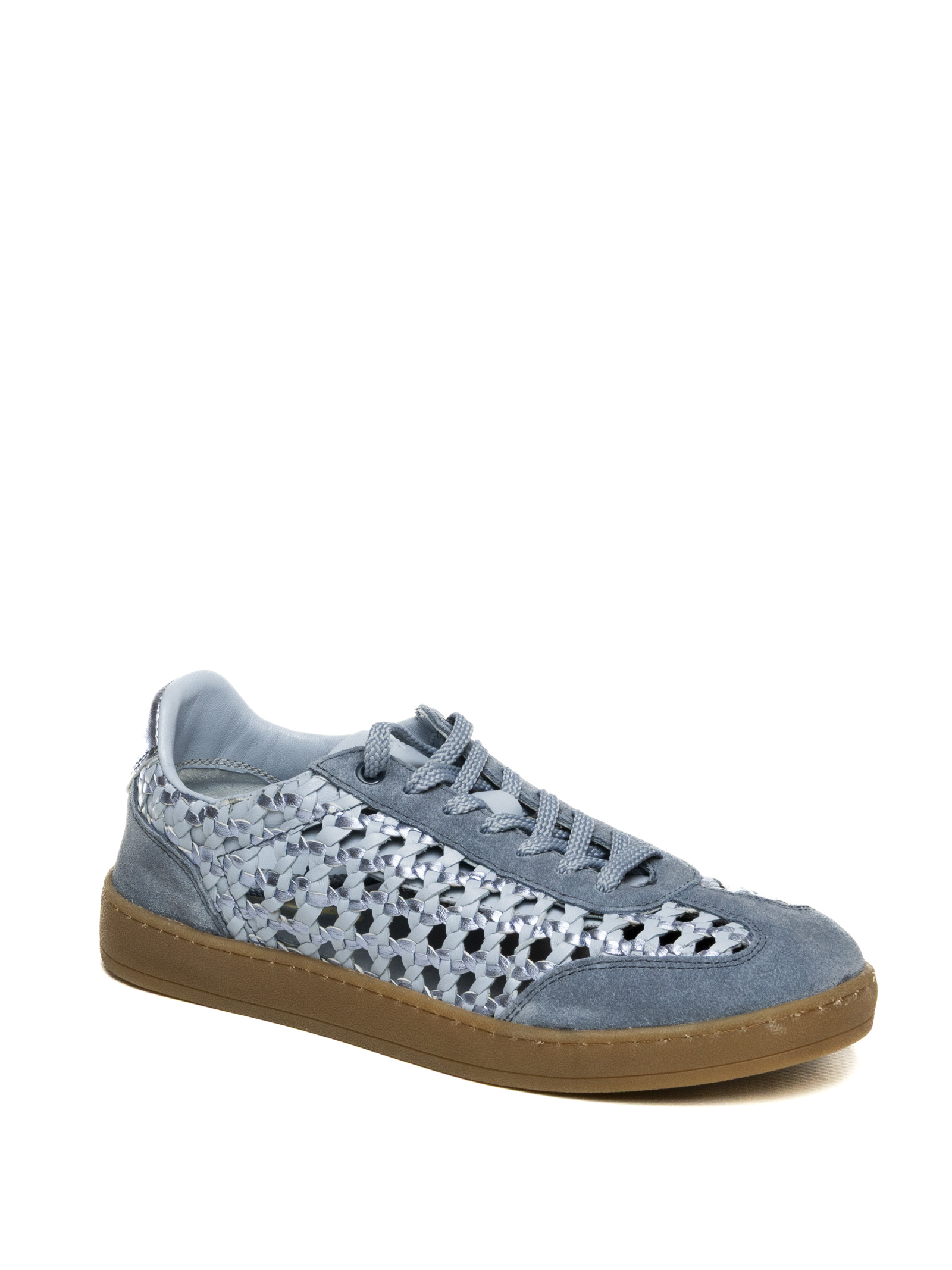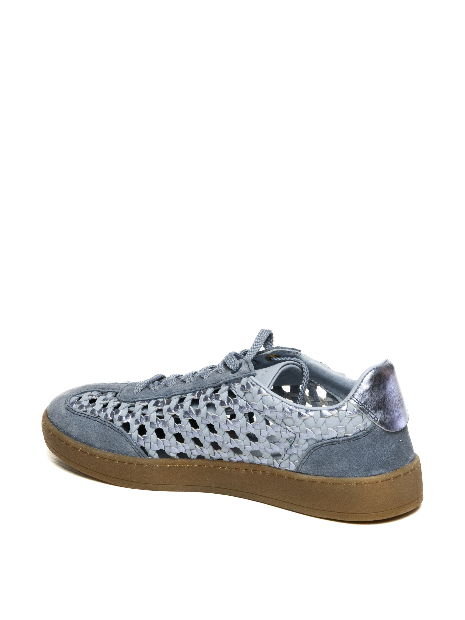 La tomaia è realizzata con un mix materico di alta qualità: una base in pelle scamosciata blu polvere sulla punta e sui profili si combina con una particolare lavorazione traforata a intreccio metallizzata sui fianchi. Questa struttura non solo garantisce una traspirabilità superiore, ideale per le giornate più calde, ma dona alla scarpa un aspetto dinamico e ricercato. Il design è completato dal talloncino in pelle laminata argento, che aggiunge un ulteriore punto di luce e modernità alla silhouette.