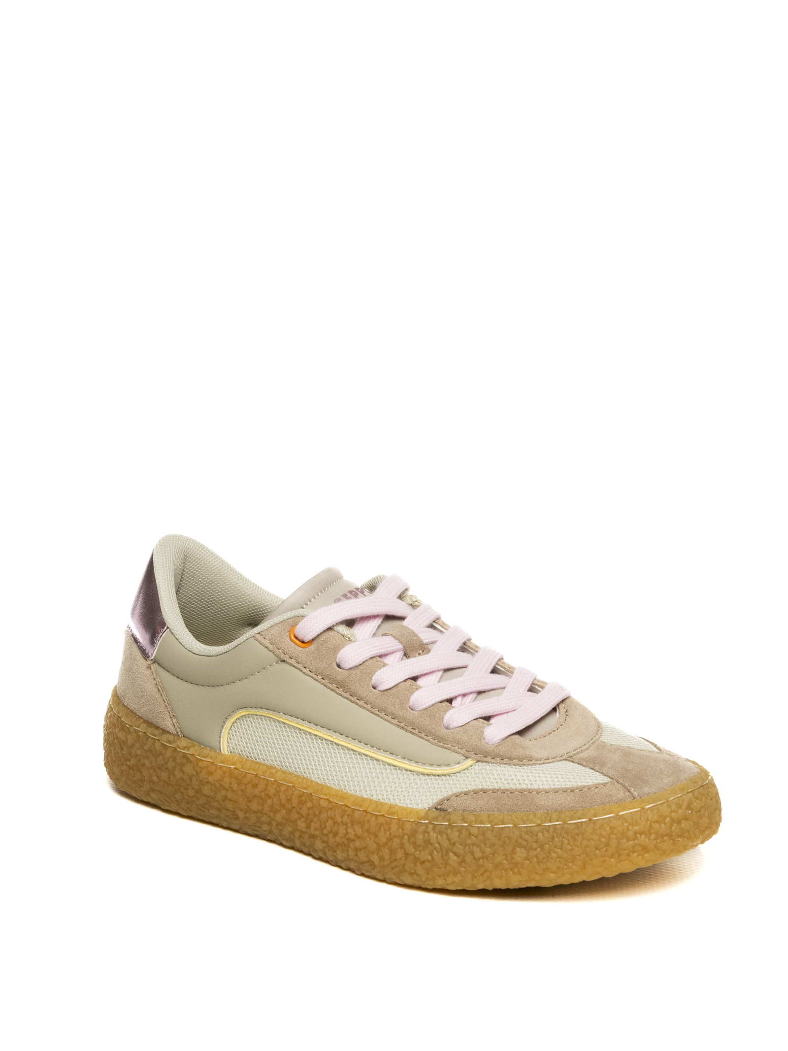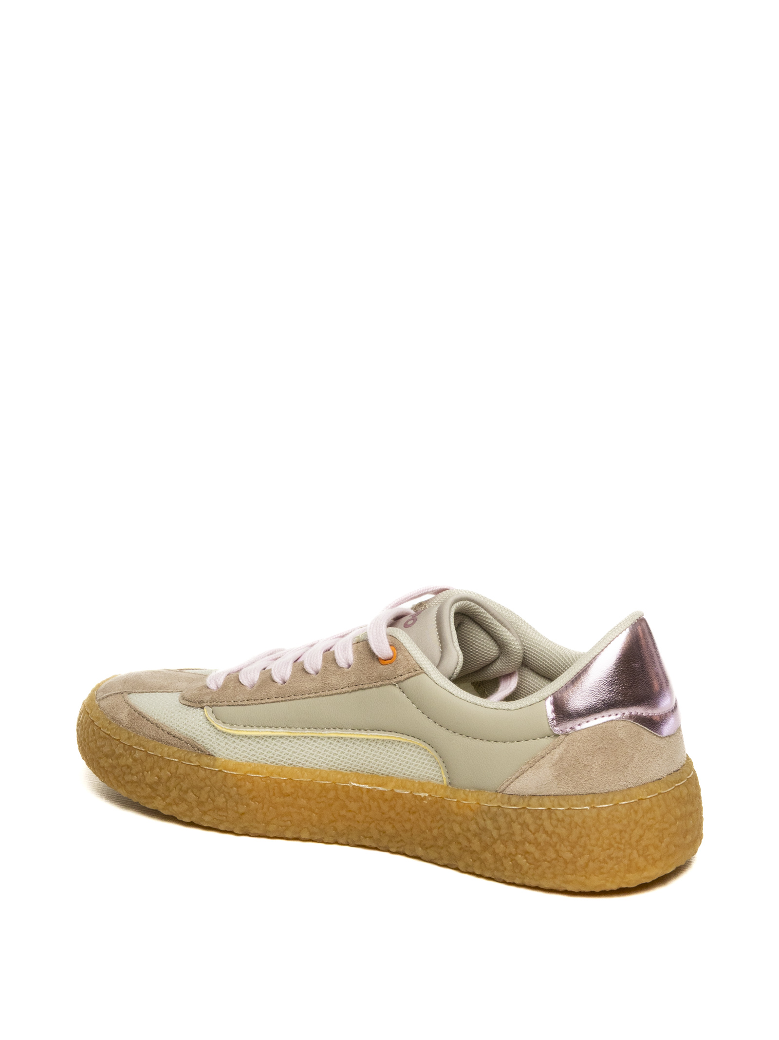 La tomaia è realizzata con una combinazione premium di materiali: una base in tessuto tecnico traspirante color tortora è arricchita da inserti in morbida pelle scamosciata tono su tono sulla punta e sui profili. Il design è reso unico dai dettagli luminosi, come il profilo laterale giallo fluo e l'iconico talloncino in pelle laminata rosa metallizzato, che conferiscono alla scarpa un tocco glamour e originale. La chiusura con lacci piatti in cotone assicura una calzata precisa e confortevole.