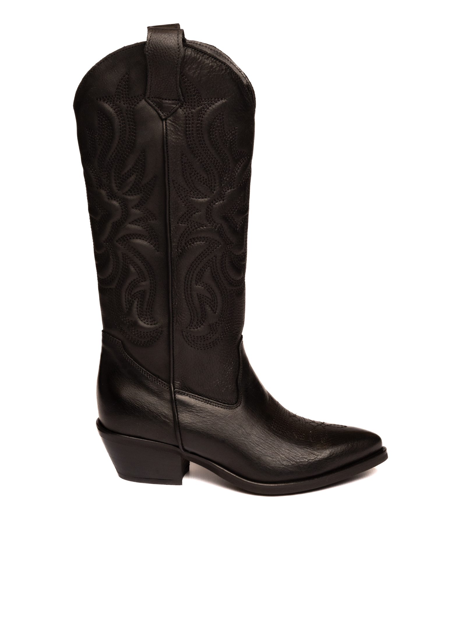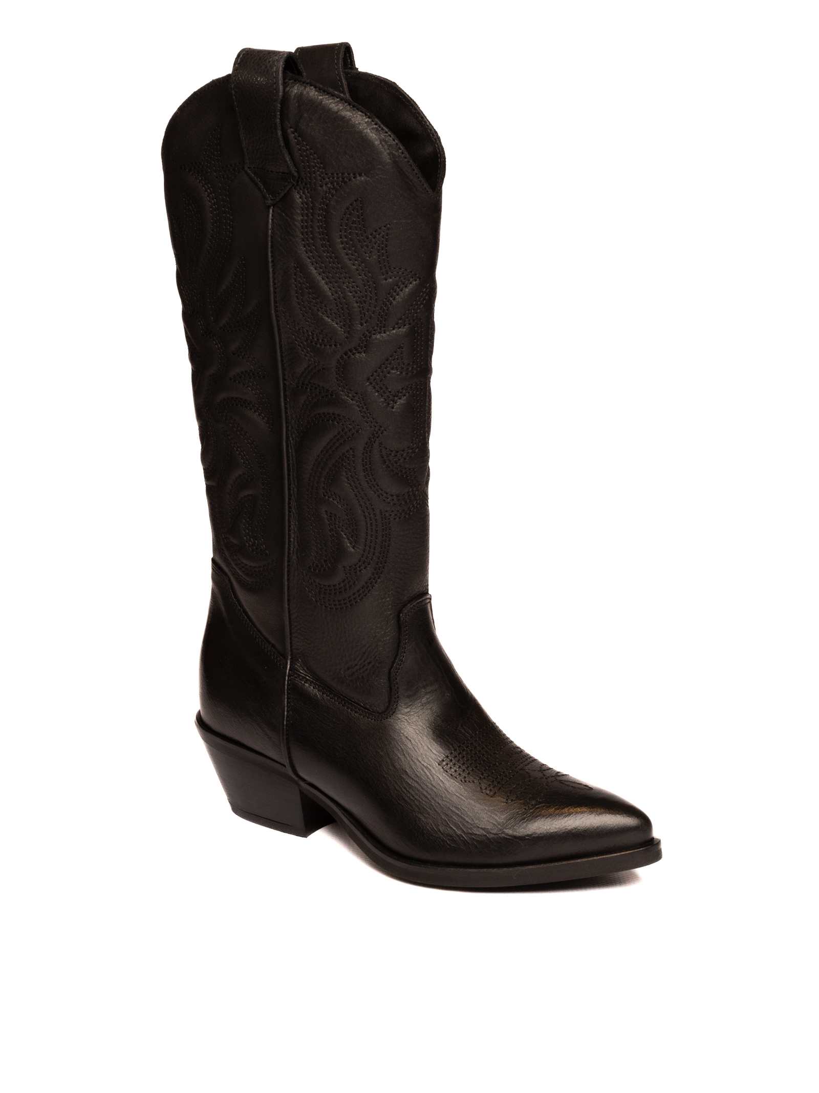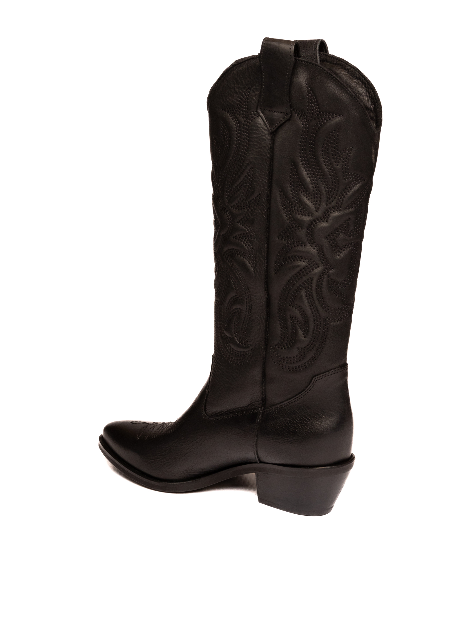 Stivale texano in morbida pelle nera, simbolo dell'eleganza e dell'artigianalità italiana firmata Gisel Moirè.