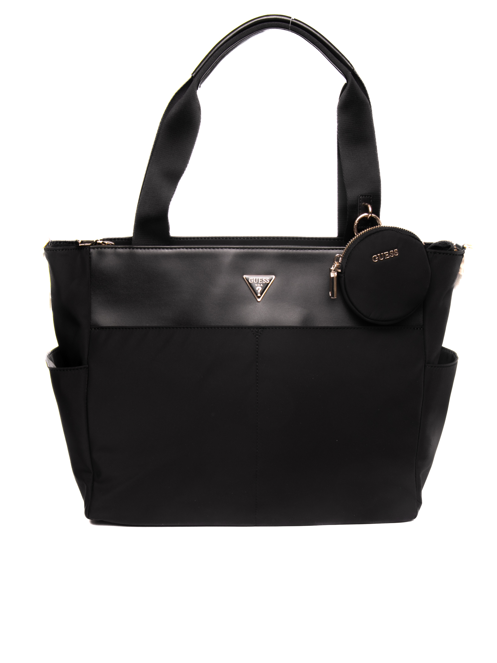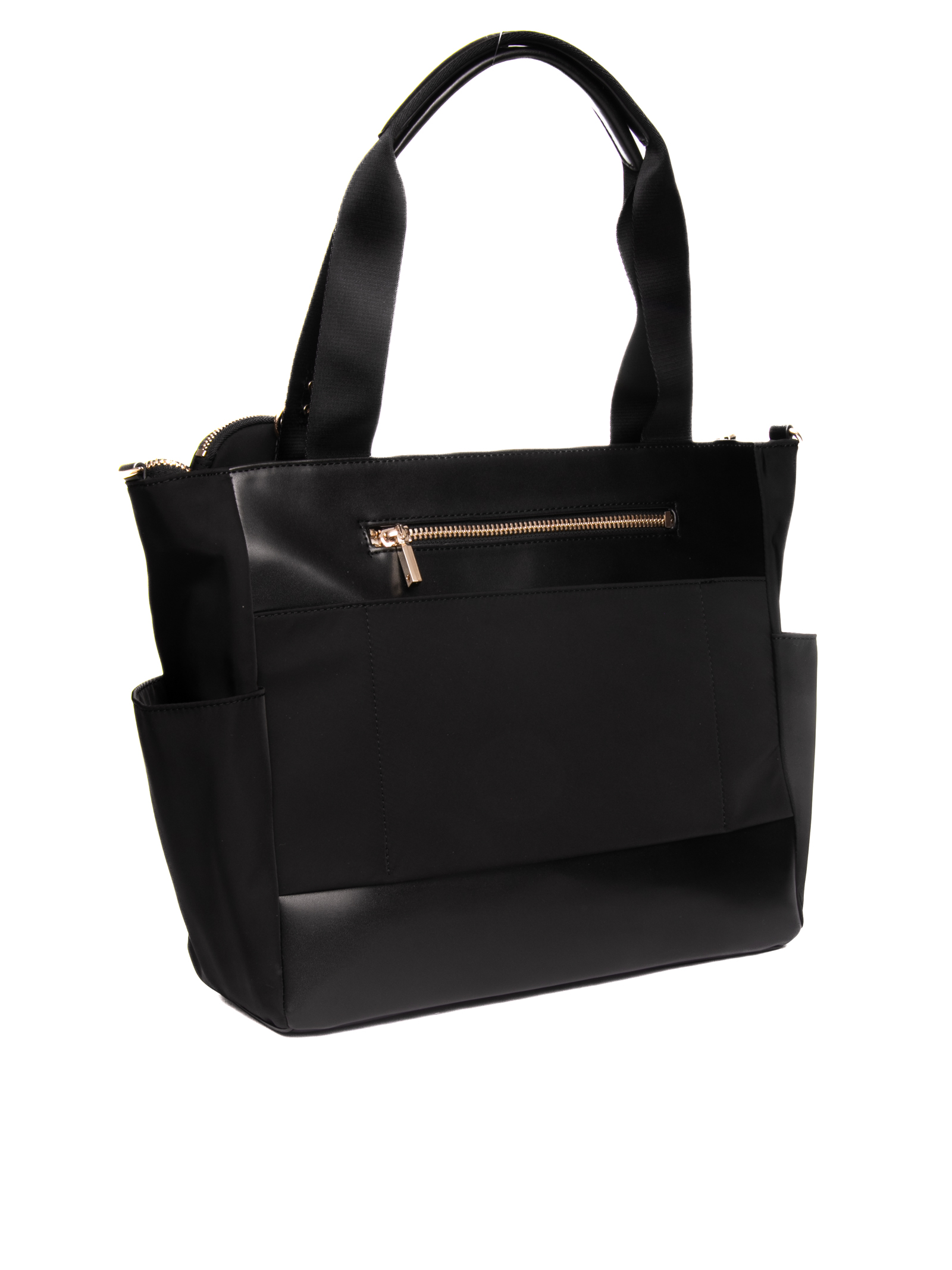 Shopping in tessuto. Dettagli in ecopelle. Chiusura con zip. Charm removibile alla base del manico. Tasche laterali. Tasca posteriore con zip. Tasche interne. Dimensioni: 45x32x12 cm.