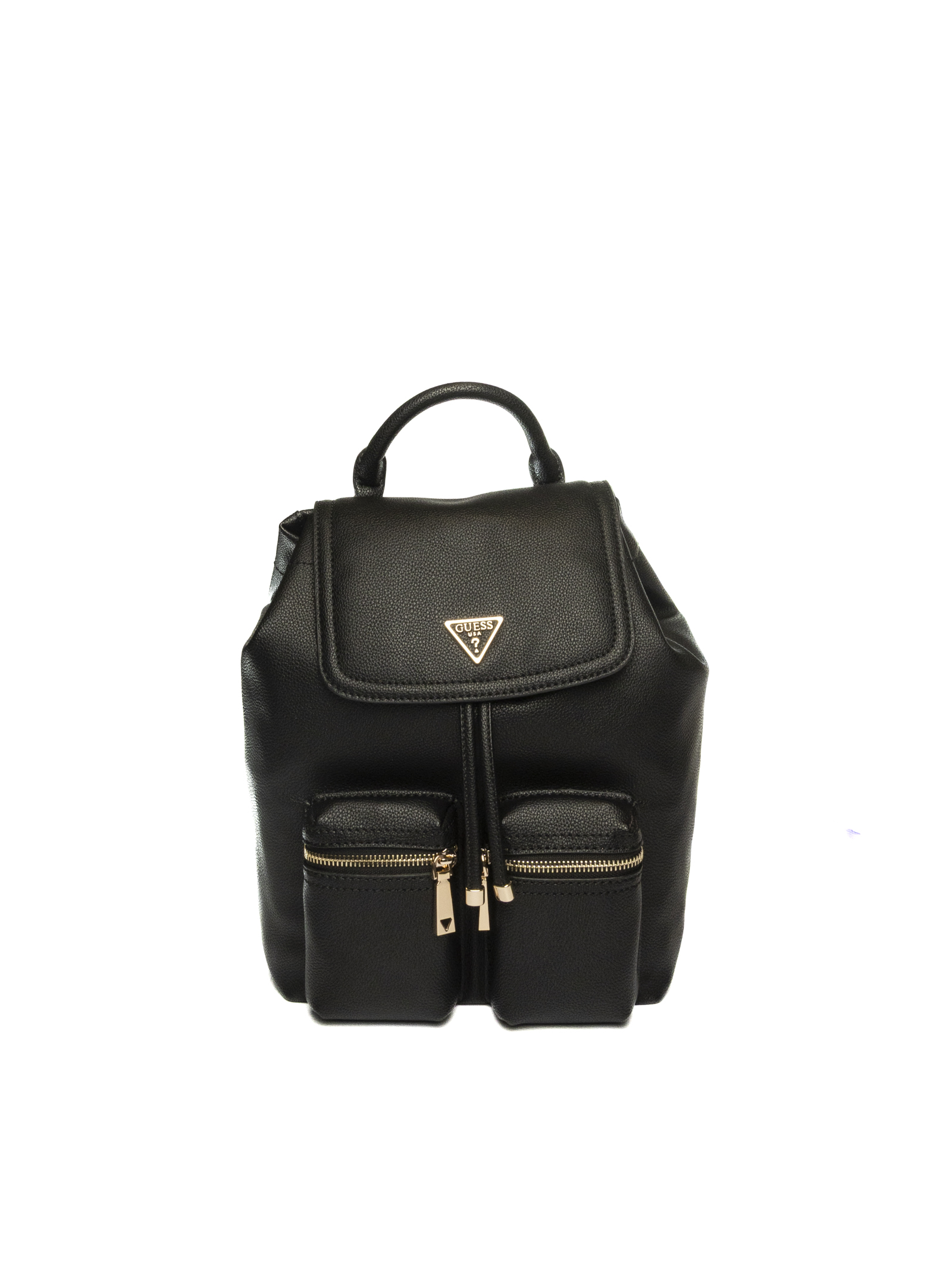 Realizzato in ecopelle nera effetto saffiano, presenta un design moderno con logo triangolare in metallo sul flap e due tasche frontali con zip che aggiungono un tocco sportivo e funzionale.