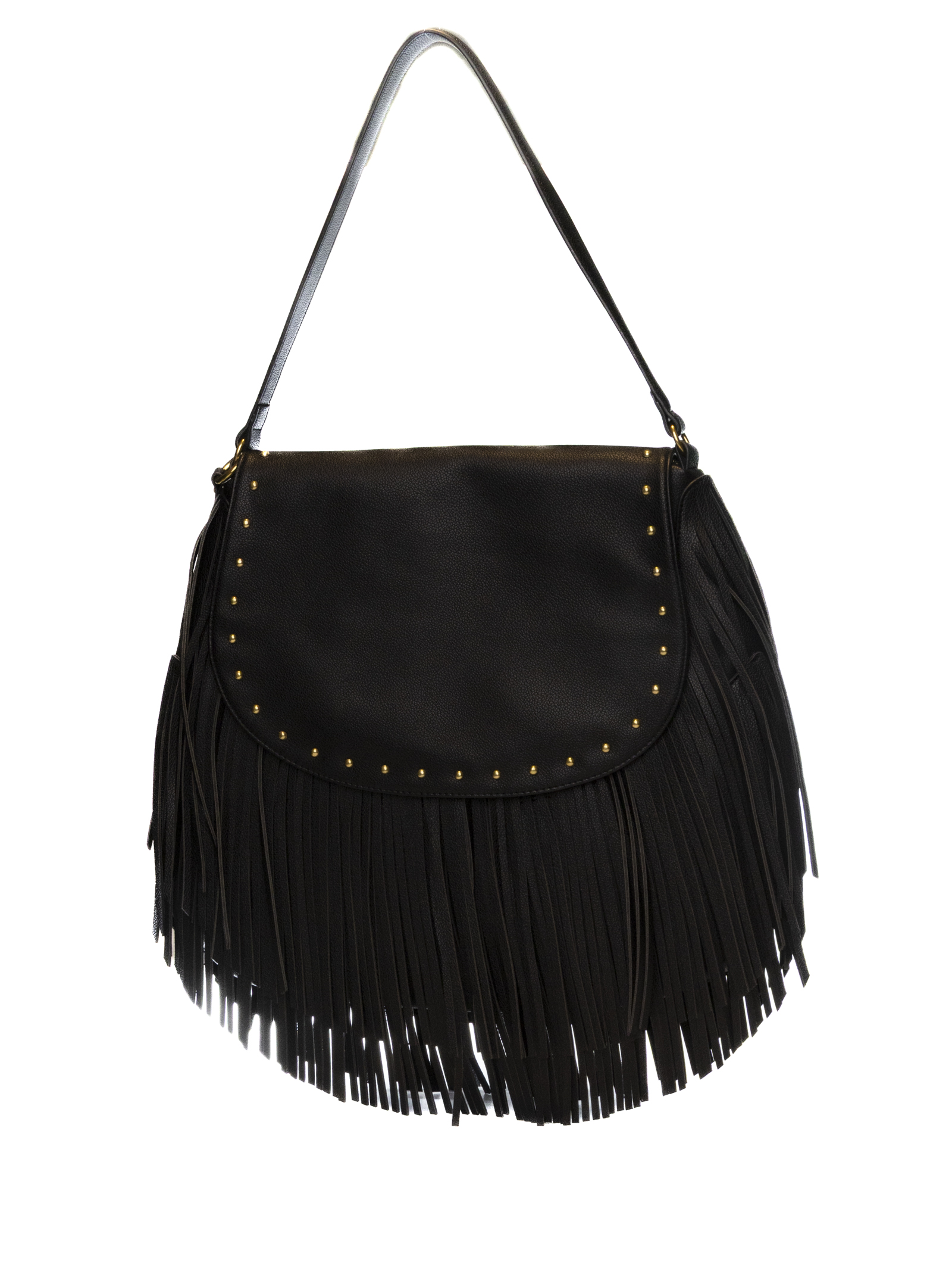 Realizzata in ecopelle morbida con dettagli di borchie dorate sul risvolto, presenta un design a frange lunghe che donano movimento e personalità.