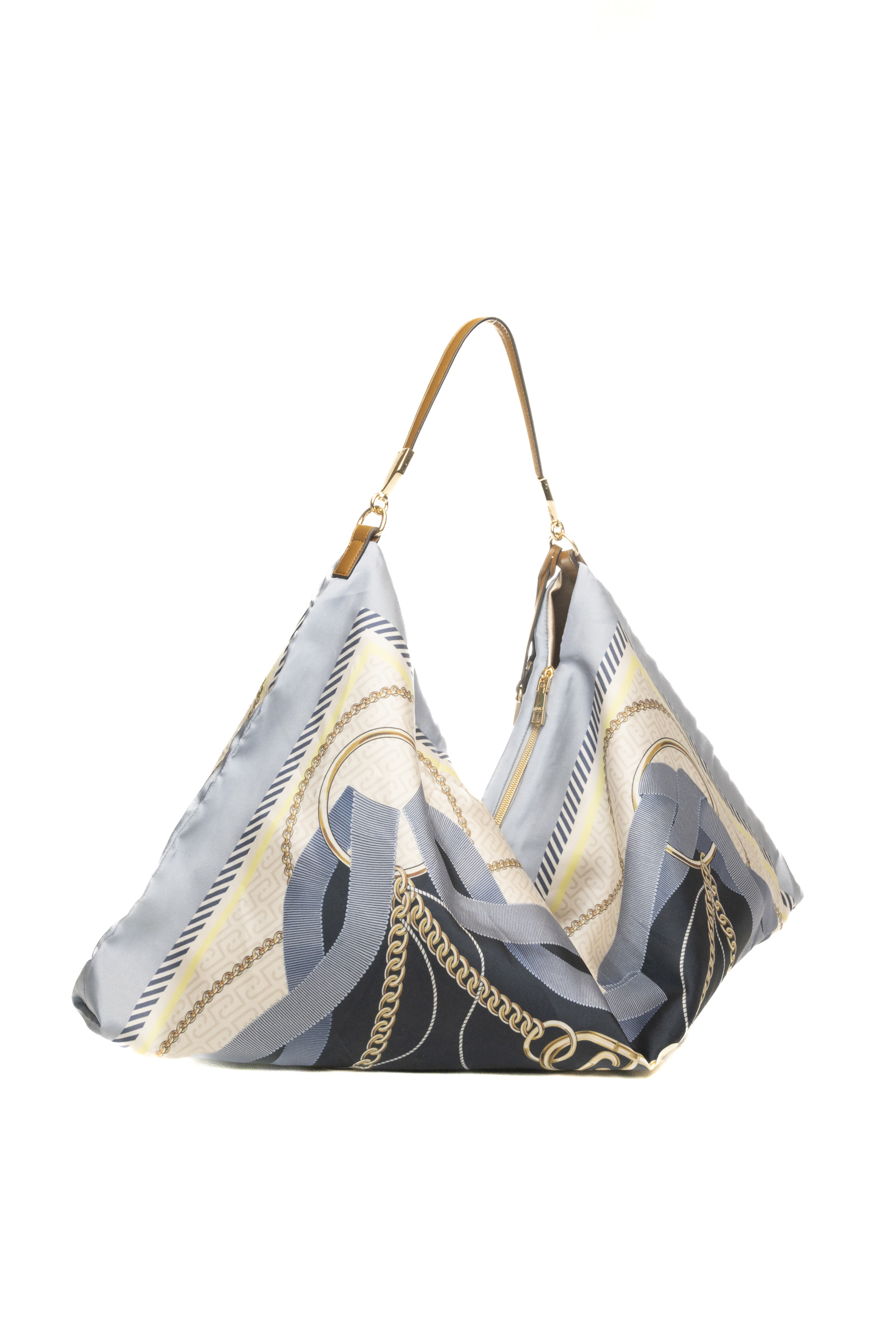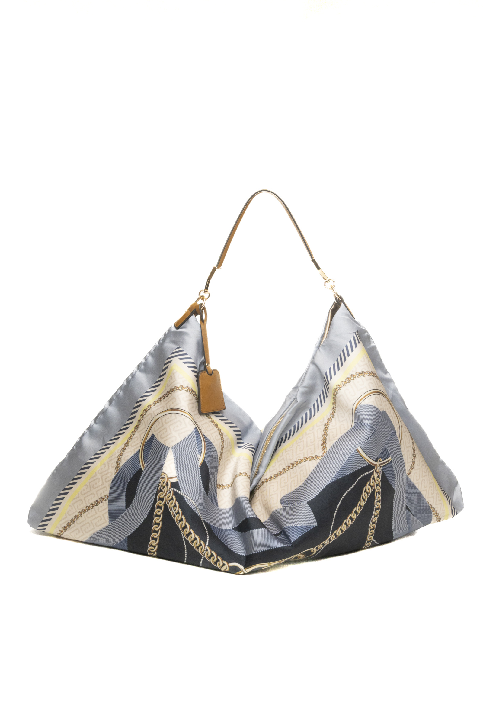 Il corpo della borsa è interamente rivestito da una raffinata stampa foulard all-over sui toni del blu denim, grigio e crema, arricchita da motivi a catena dorata che creano un gioco grafico lussuoso e dinamico. Il manico singolo in ecopelle color cuoio crea un contrasto cromatico caldo e sofisticato, permettendo una portabilità a spalla confortevole che segue i movimenti del corpo.