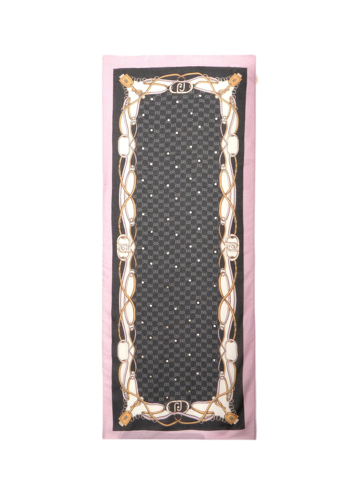 Un foulard raffinato che unisce la delicatezza del bordo rosa cipria alla modernità del motivo geometrico centrale nei toni del grigio. L' elegante cornice con dettagli intrecciati oro e avorio aggiunge un tocco prezioso e sofisticato, rendendo questo accessorio perfetto per completare outfit sia casual che eleganti.