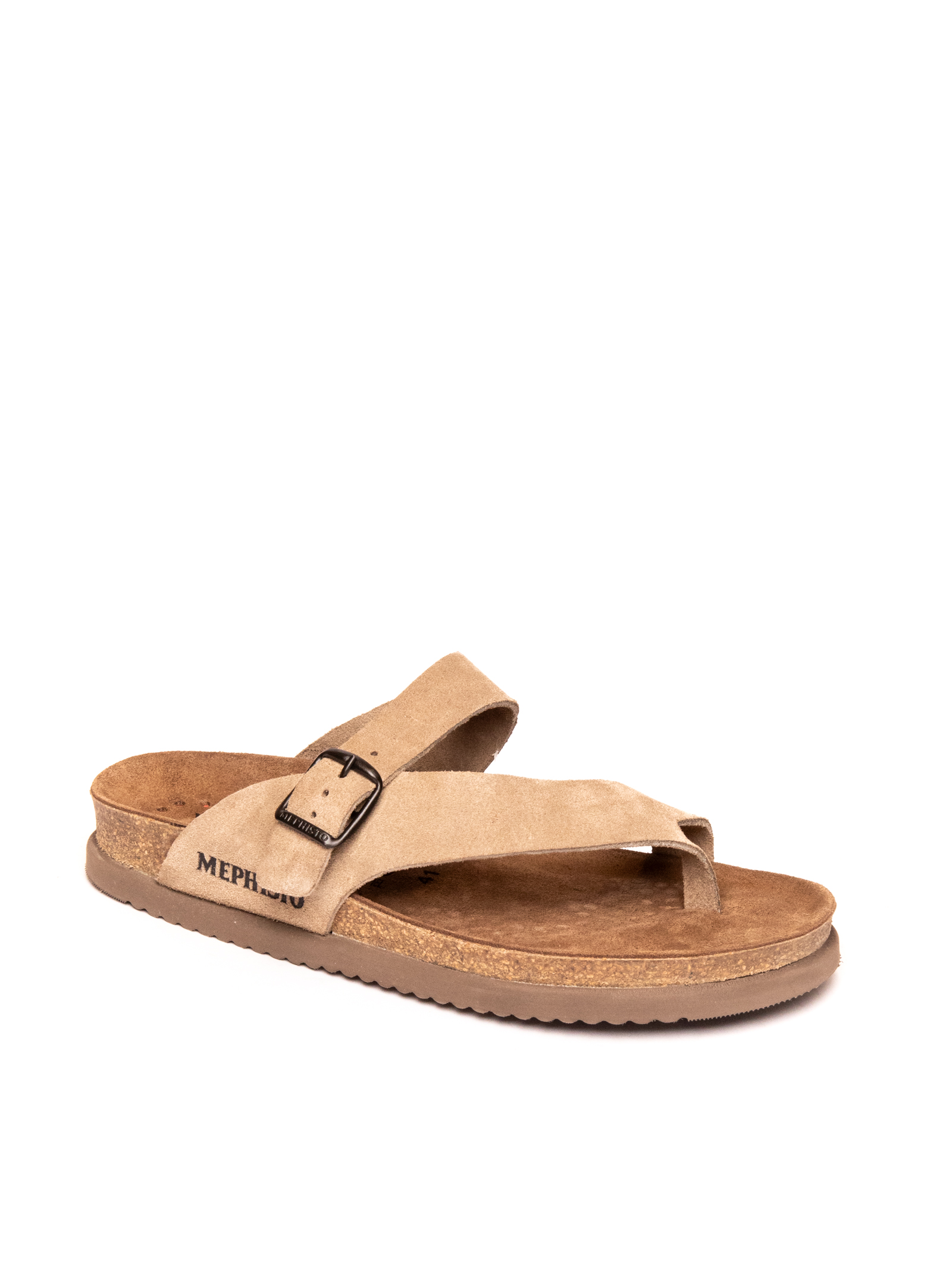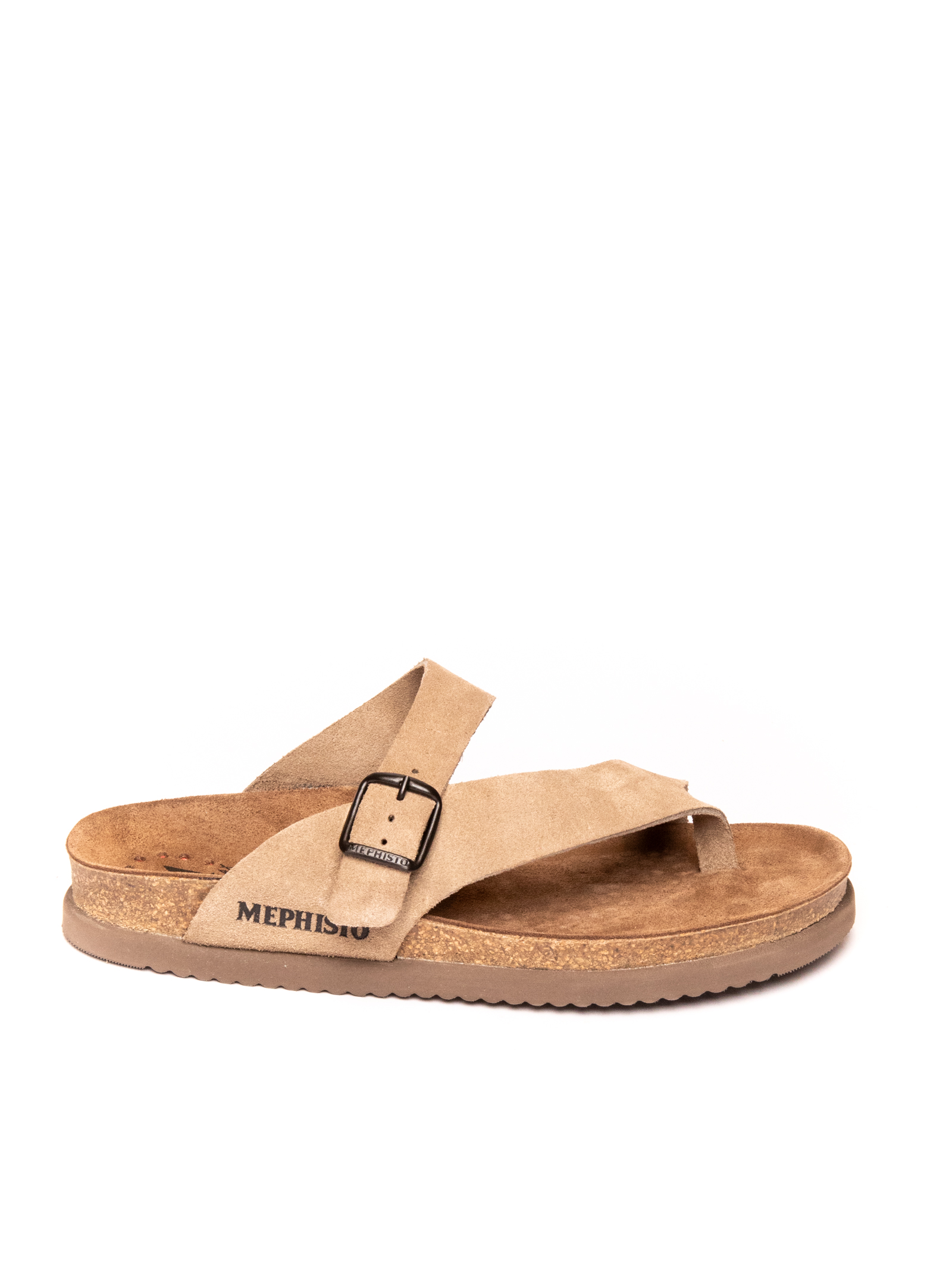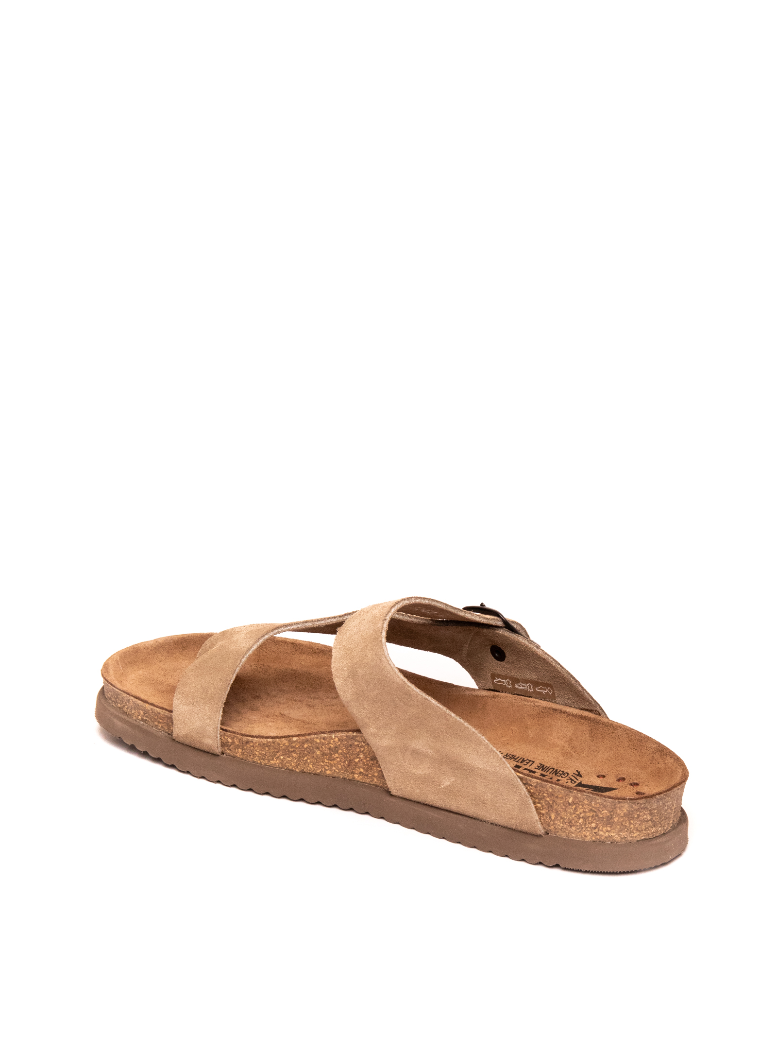 Sandalo infradito in Nubuk. Fasce con fibbia regolabile. Fondo in sughero e gomma. Plantare anatomico con tecnologia Soft Air®. Alto 40mm.