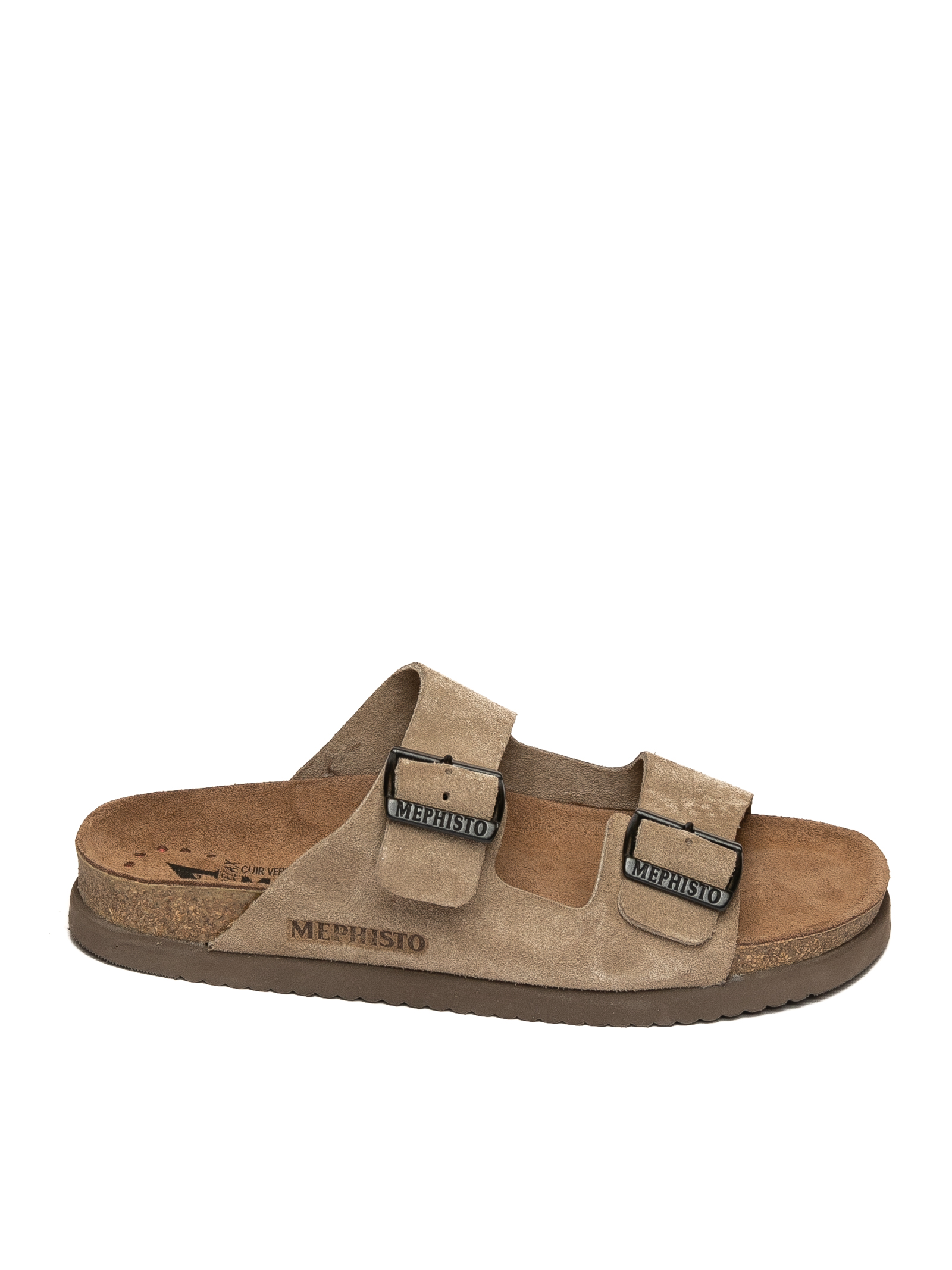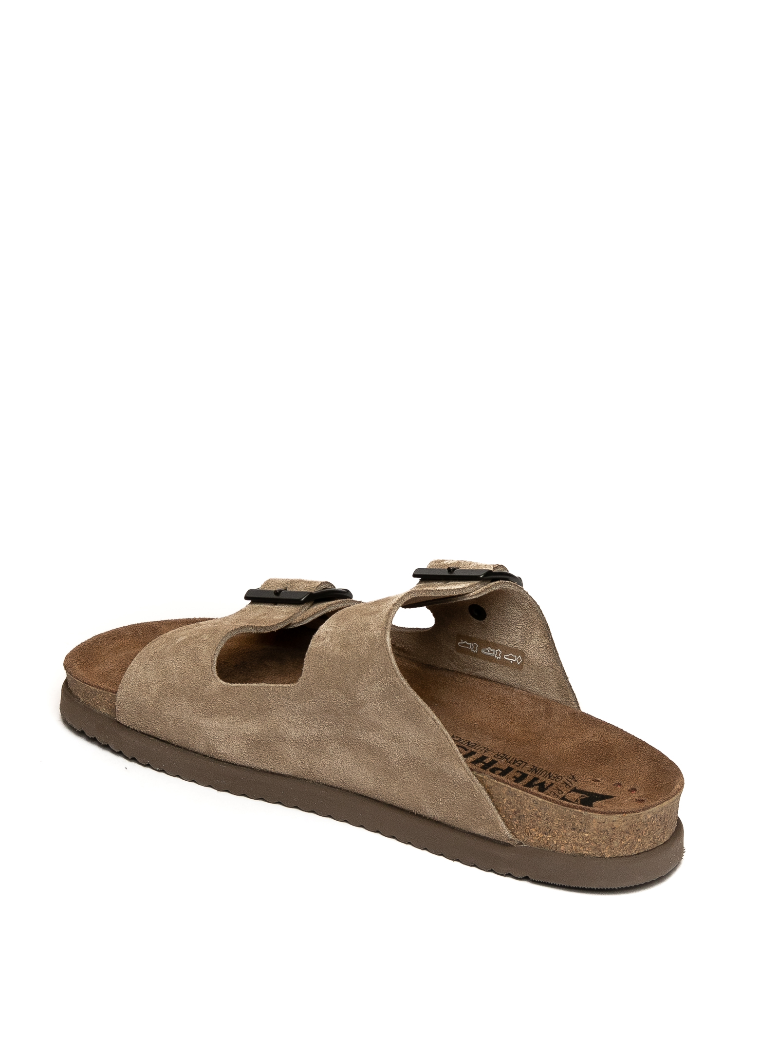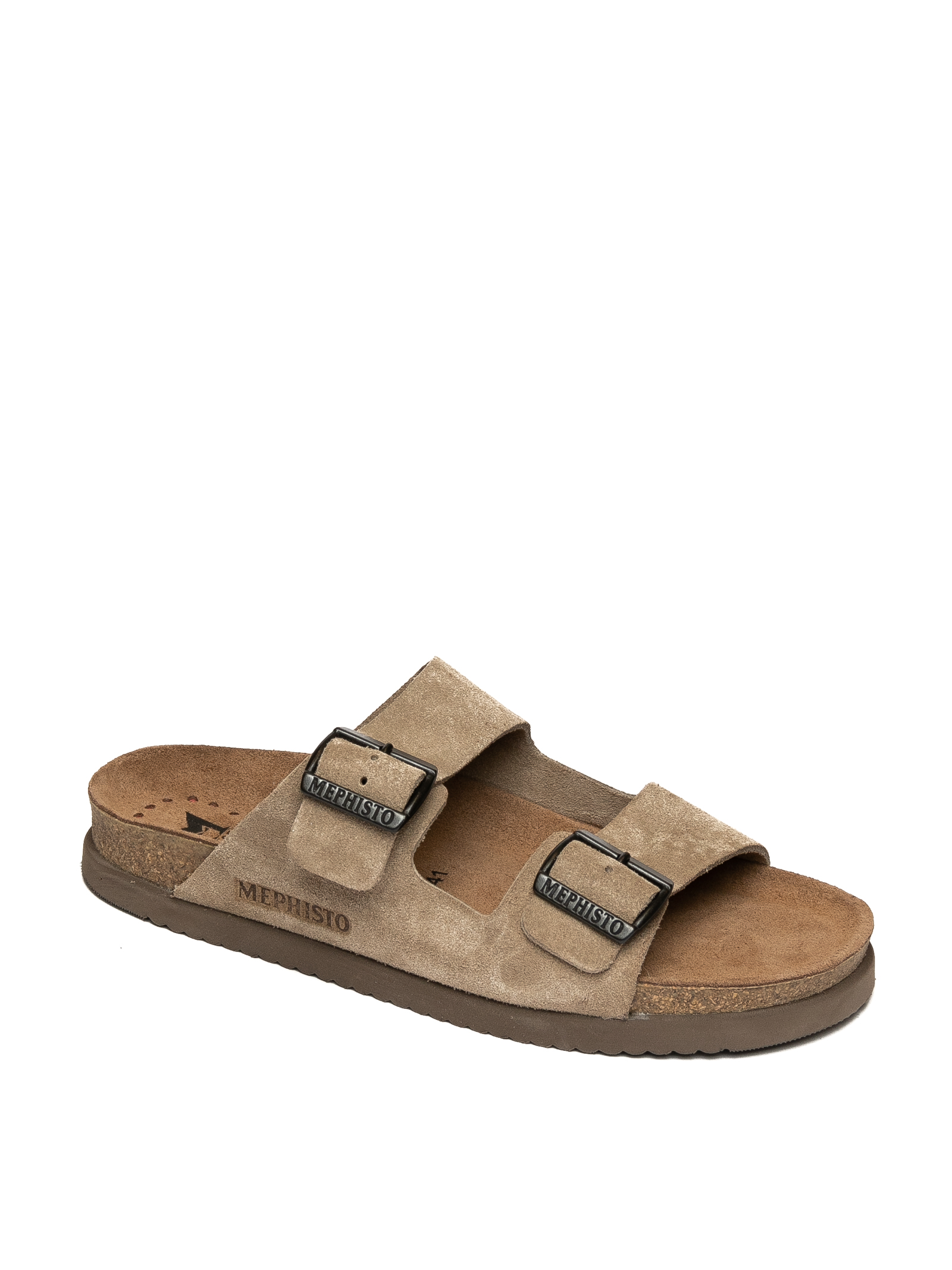 Sandalo in suede. Fasce con 2 fibbia regolabile. Fondo in sughero e gomma. Plantare anatomico con tecnologia Soft Air®. Alto 40mm.