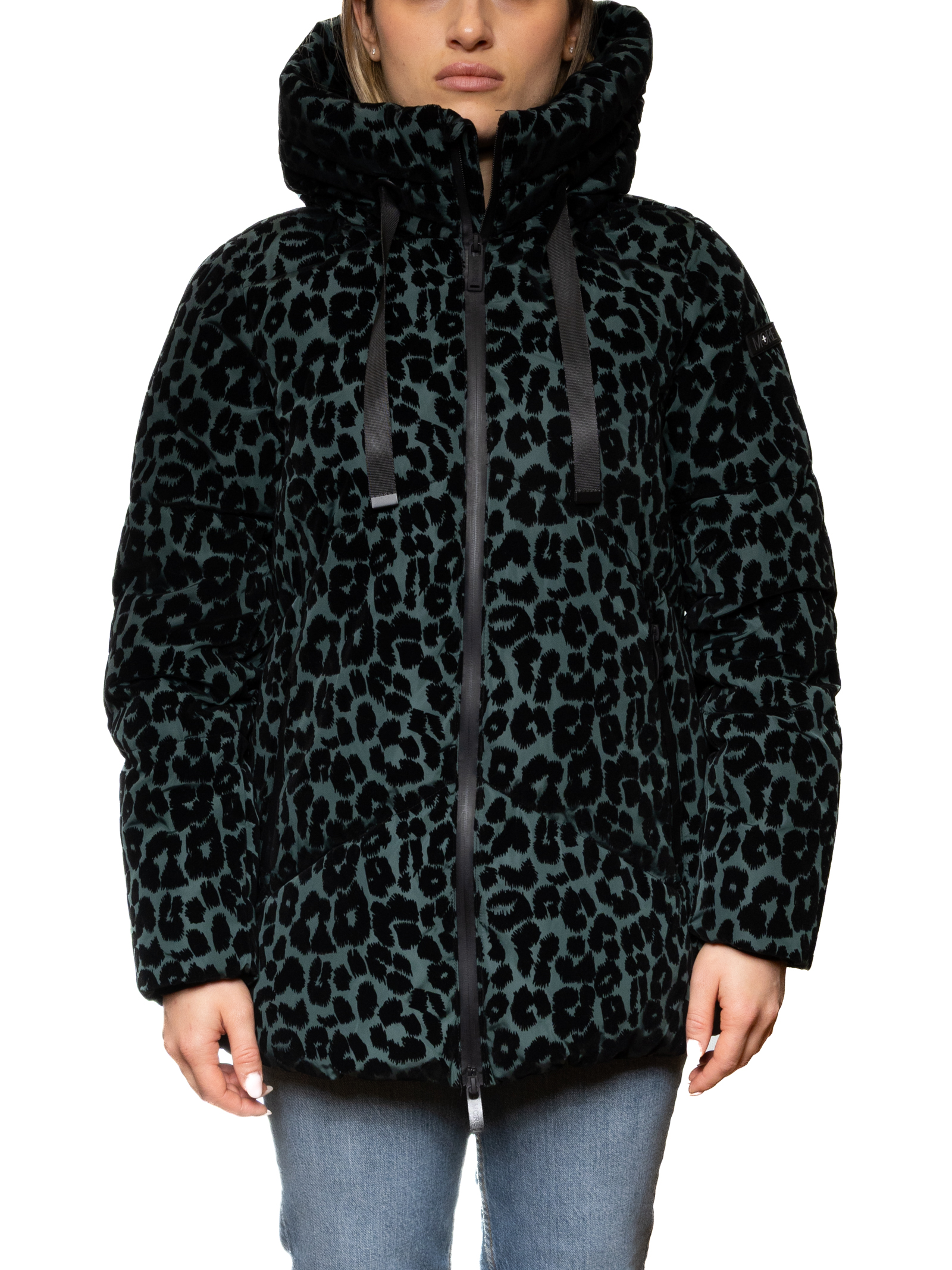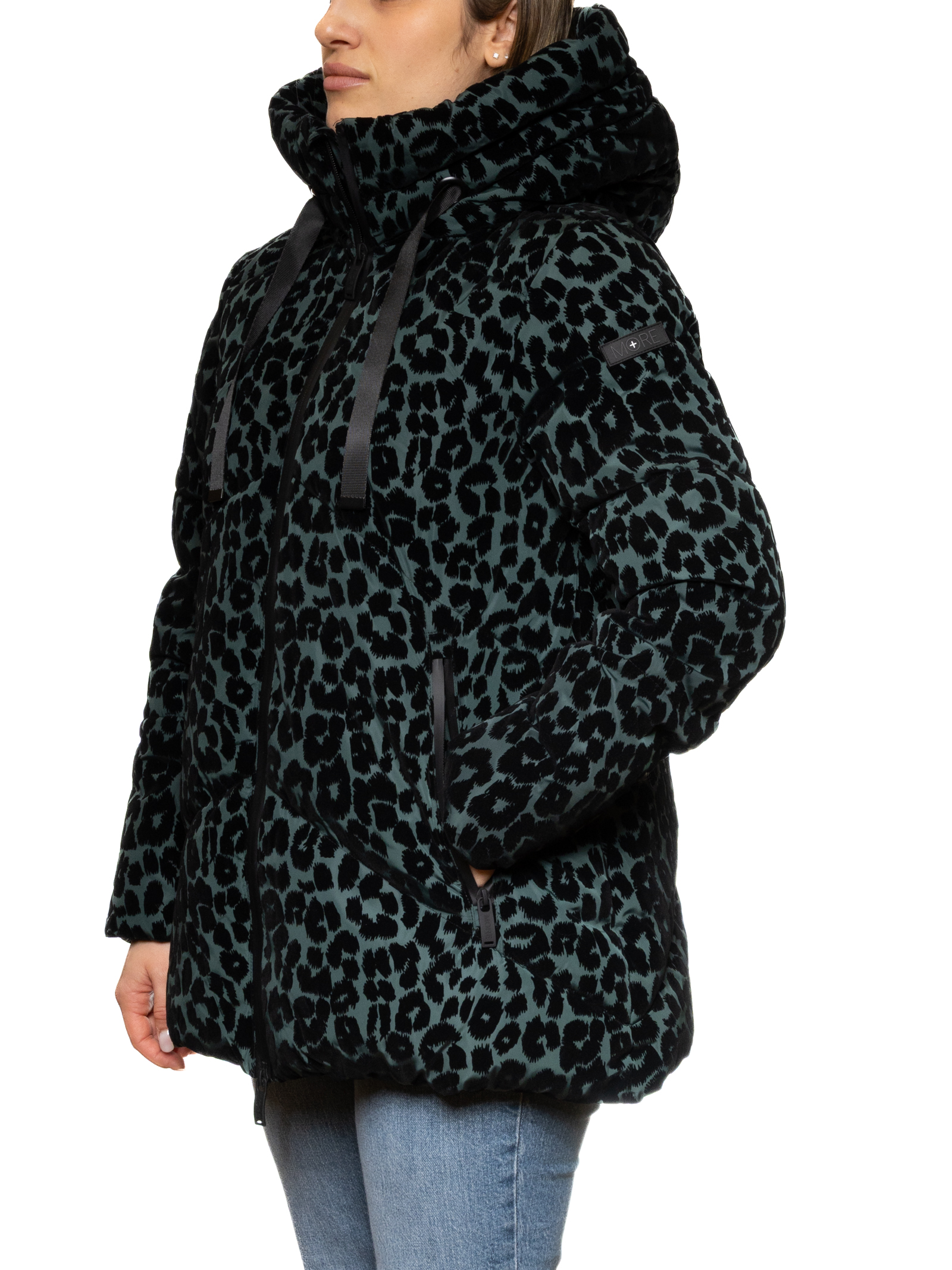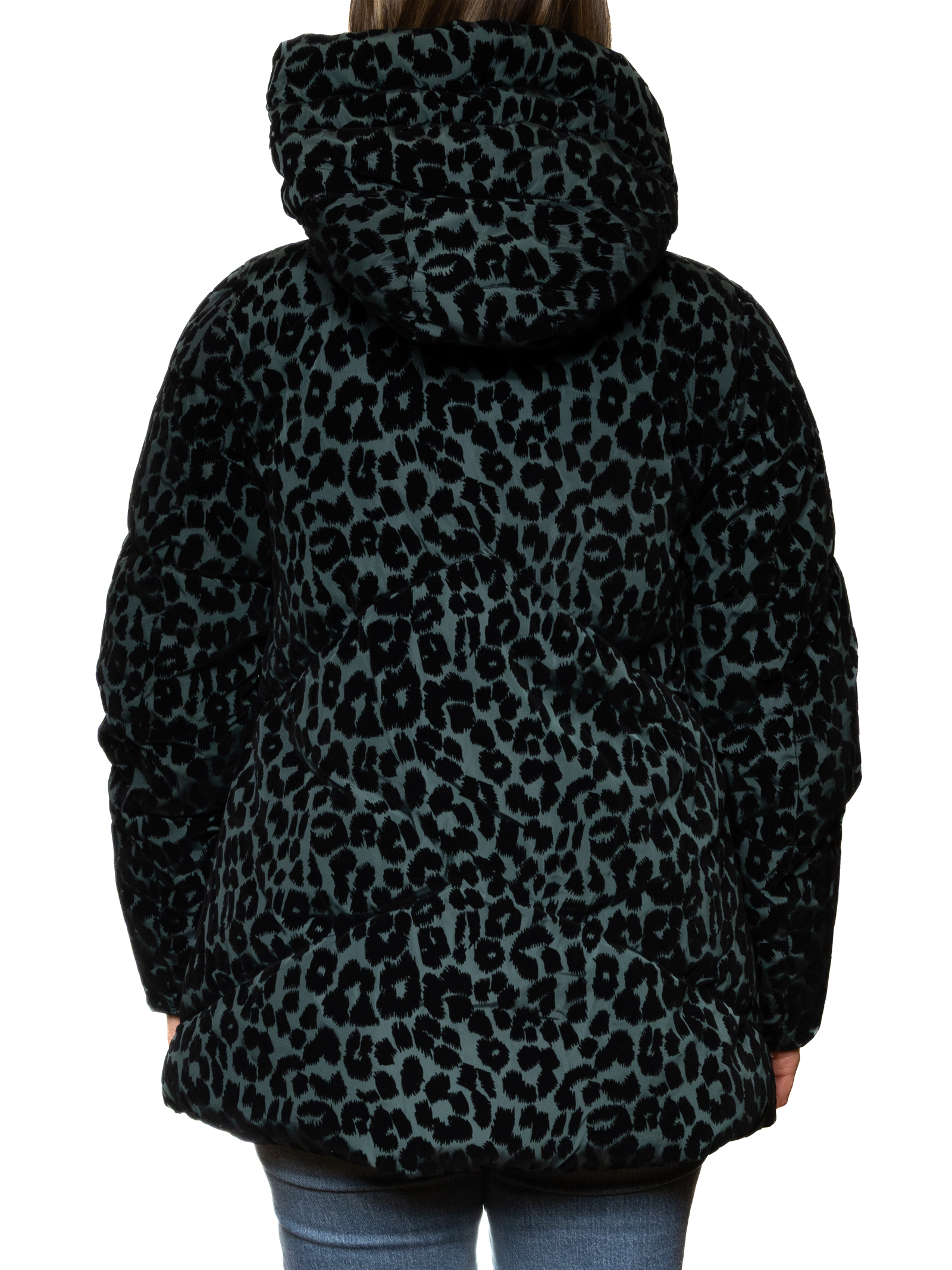 Realizzato in tessuto tecnico leggero con motivo leopardato nei toni del verde e del nero, unisce calore, comfort e personalità in un unico capo.
