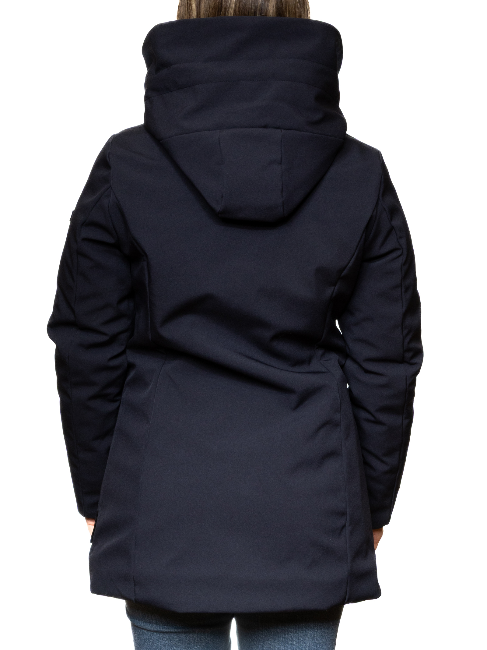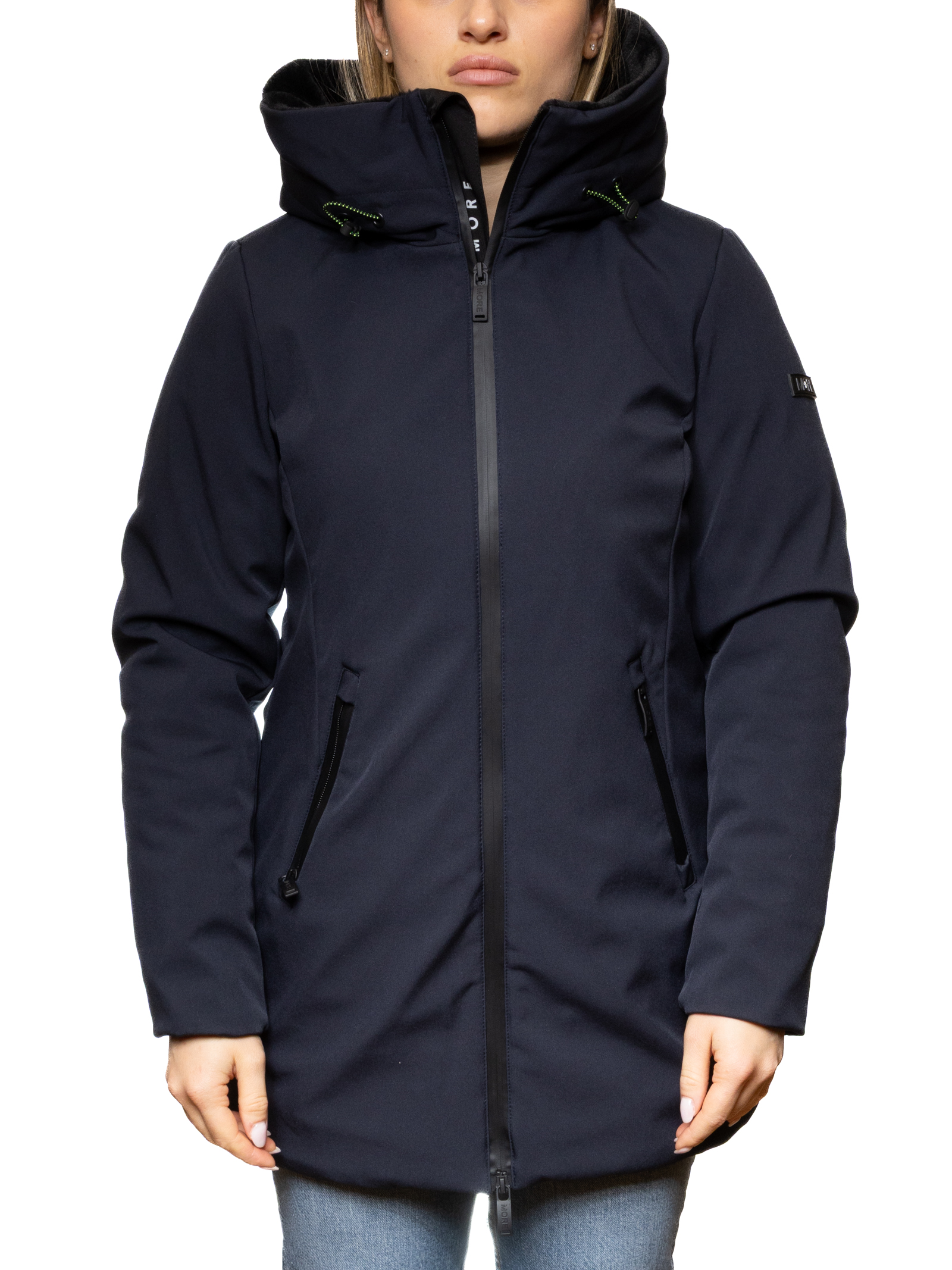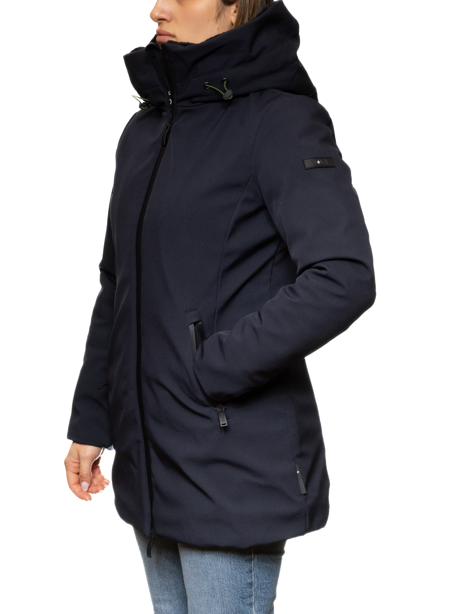 Il piumino donna MORE in colore blu scuro con interno in eco-pelliccia unisce stile e funzionalità in un capo sofisticato e accogliente.