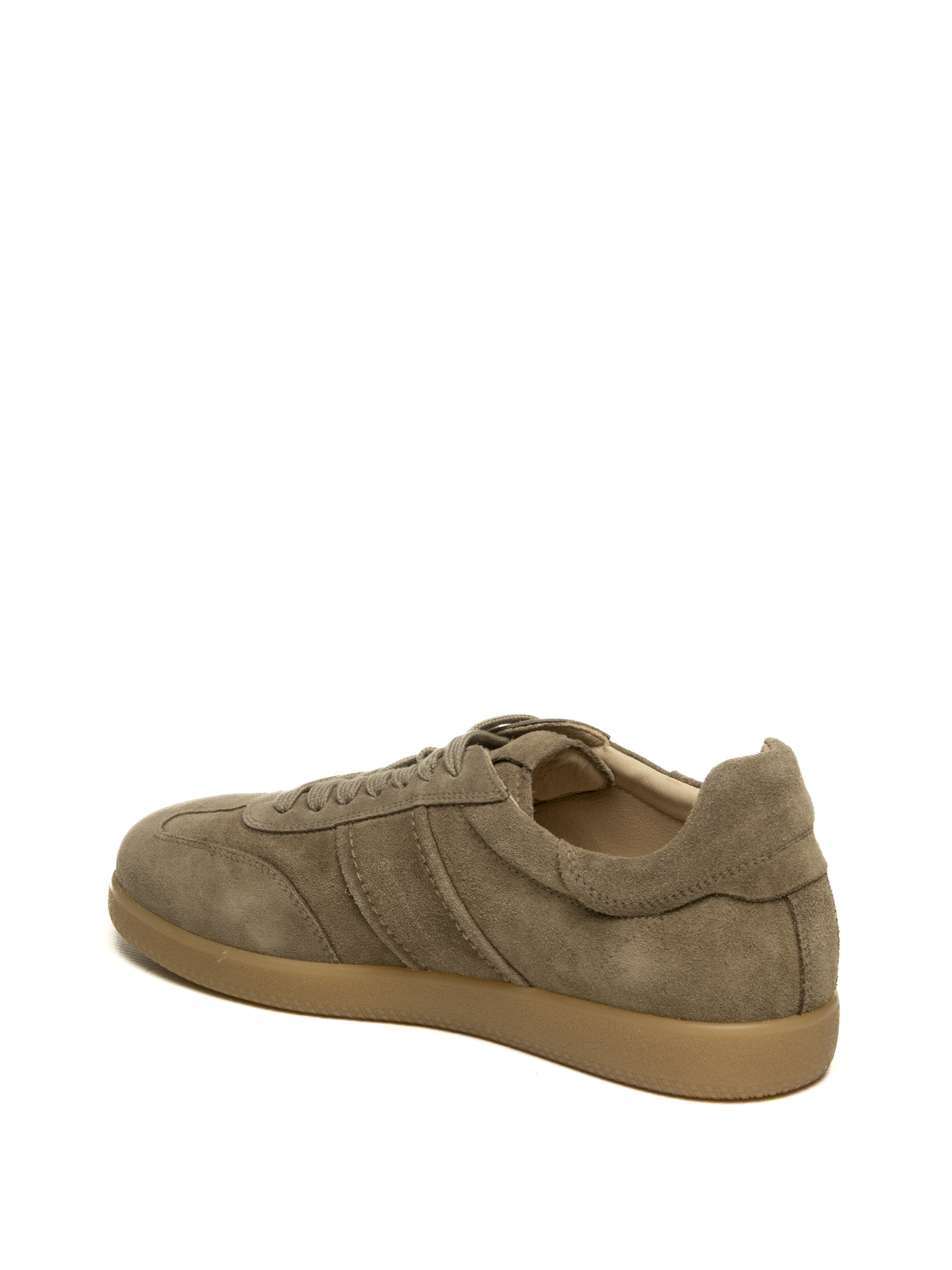 La tomaia è interamente realizzata in pregiata pelle scamosciata (suede) di colore beige talpa, caratterizzata da una silhouette 'low-cut' dalle linee pulite e moderne. Il design è impreziosito da cuciture artigianali a vista e da un inserto laterale con il logo NeroGiardini in rilievo, che sottolinea l'identità ricercata del brand. La linguetta e il collarino leggermente imbottiti assicurano una calzata avvolgente, mentre i lacci piatti tono su tono completano l'estetica sofisticata della calzatura.