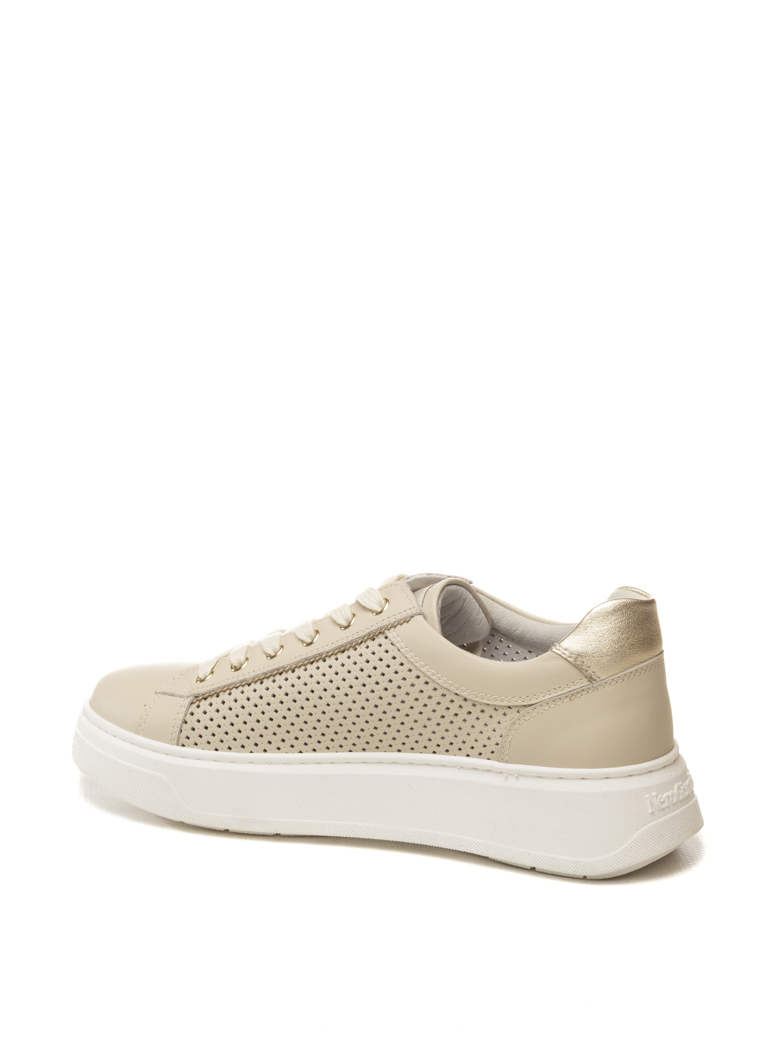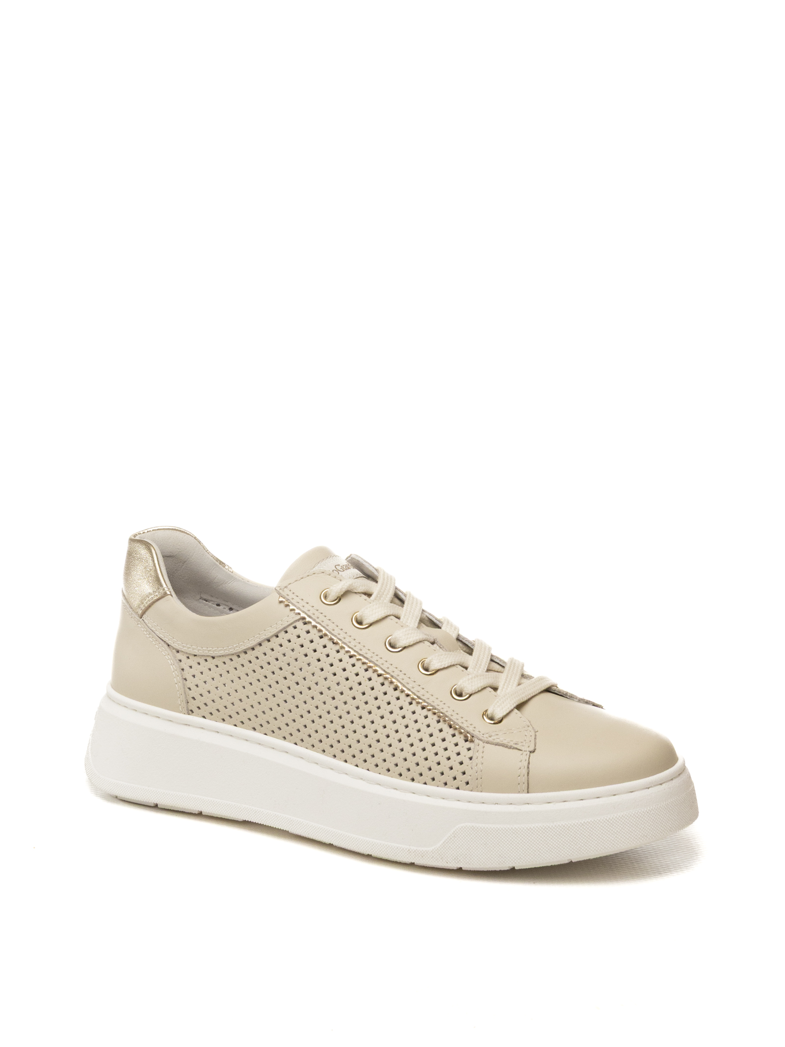 La tomaia è realizzata in pregiata vera pelle color latte, una tonalità crema delicata e sofisticata, caratterizzata da una lavorazione traforata sui fianchi che, oltre a creare un motivo estetico distintivo, garantisce un'ottima traspirabilità per le stagioni più calde. Il design minimale è impreziosito da un elegante talloncino in pelle laminata color oro, che aggiunge una nota di glamour alla silhouette. La chiusura con lacci piatti tono su tono assicura una calzata precisa e confortevole, mantenendo la pulizia delle linee.