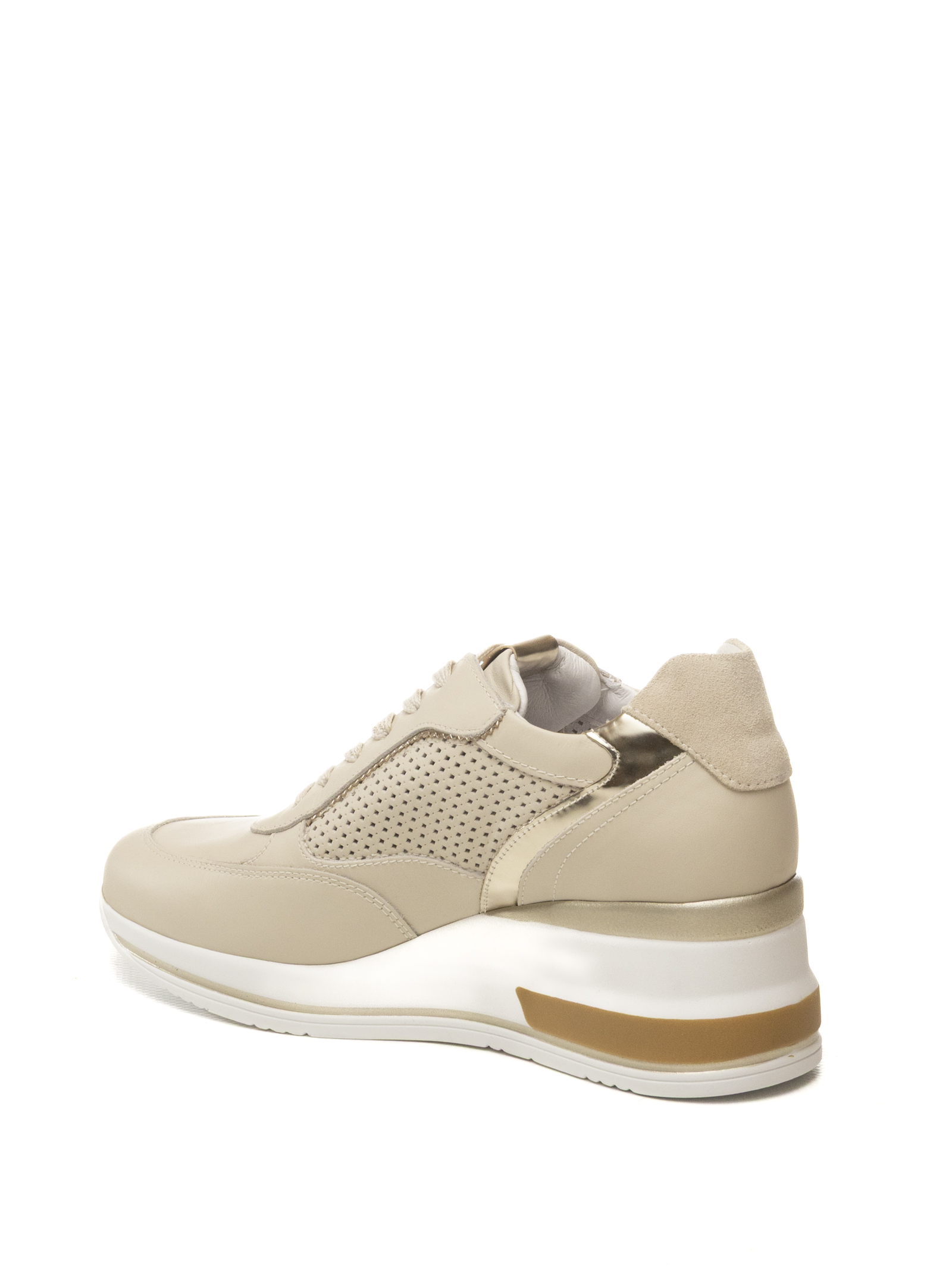 La tomaia è realizzata in pregiata vera pelle color latte, una tonalità crema delicata e raffinata, caratterizzata da una combinazione di texture: pannelli lisci si alternano a zone con lavorazione micro-perforata laterale che assicura un'ottima traspirabilità. Il design è impreziosito da eleganti inserti laminati color oro che profilano la silhouette e il tallone, donando un tocco di luce e modernità. La pratica zip laterale esterna facilita la calzata, rendendo la scarpa funzionale oltre che stilisticamente ricercata.