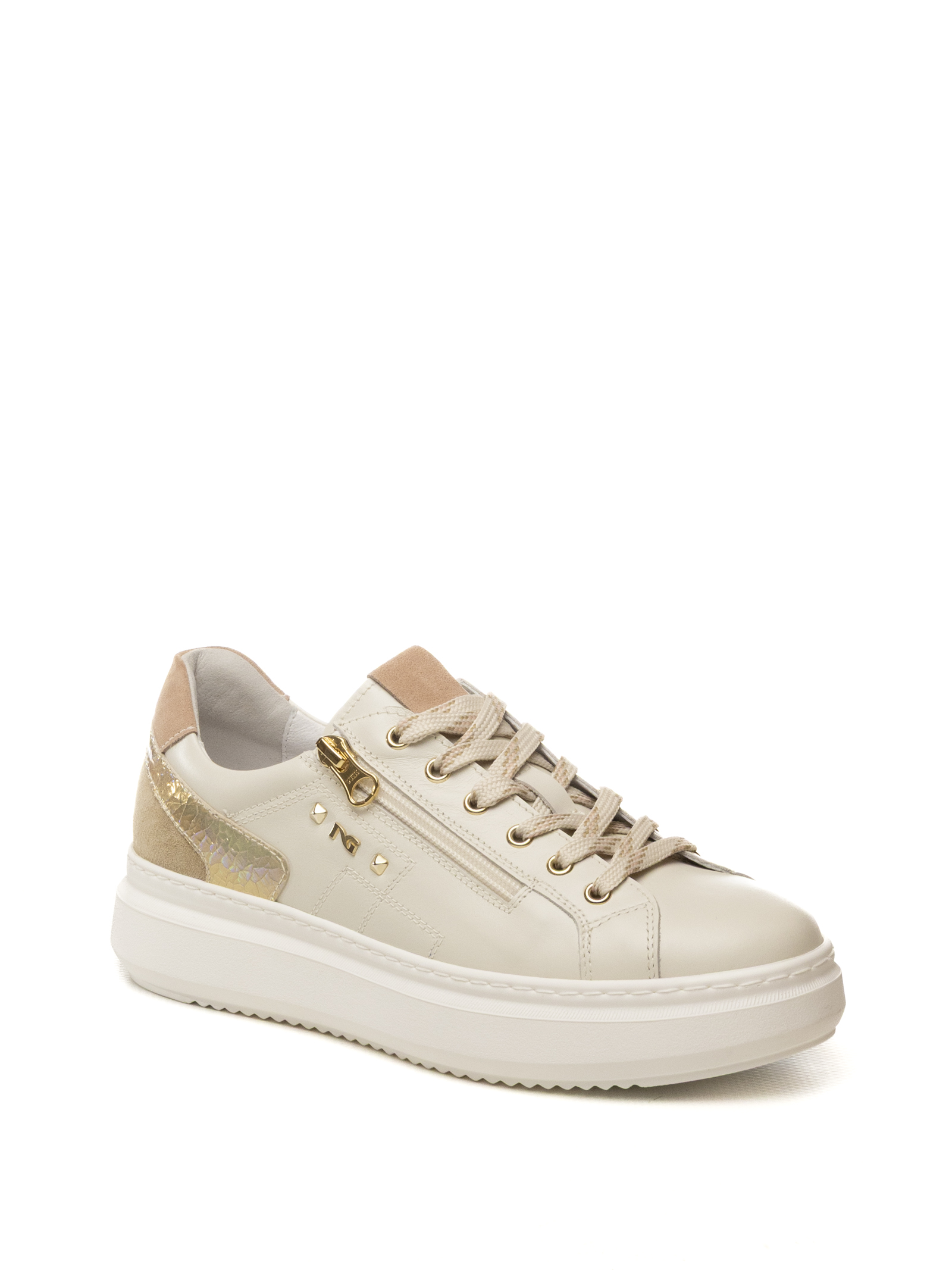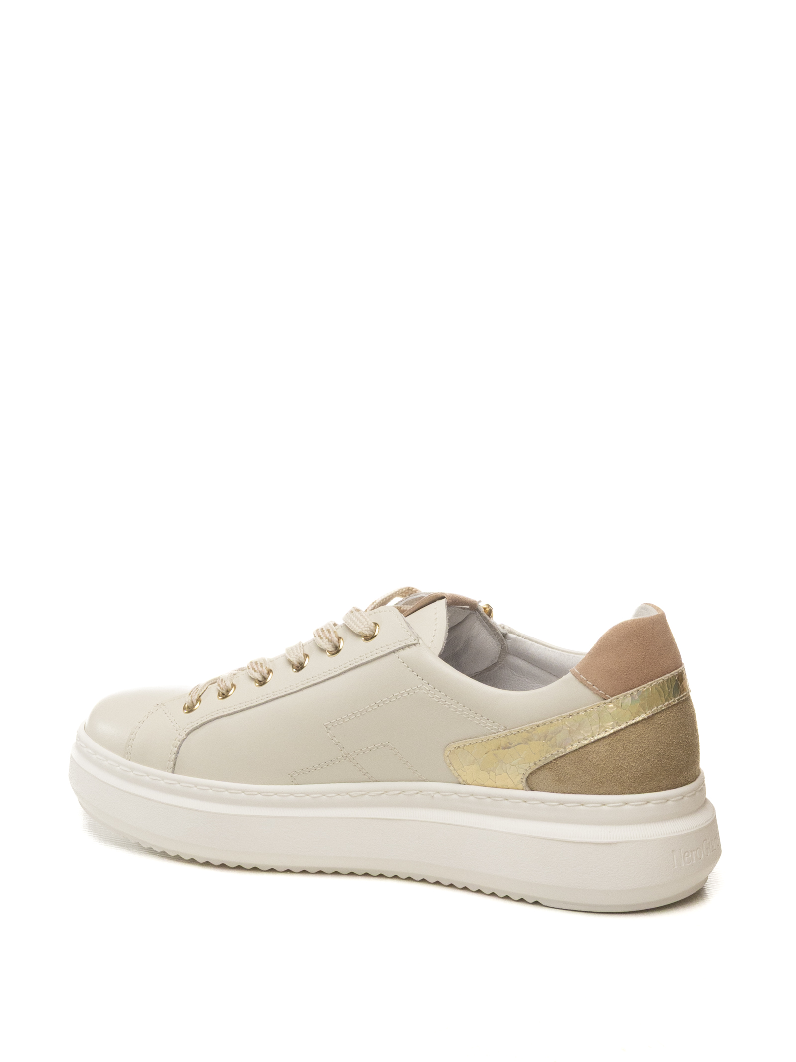Sneaker donna NeroGiardini modello Velvet-713 in colorazione Osso, una calzatura che esprime l'eccellenza del Made in Italy attraverso un design contemporaneo, dinamico e ricco di dettagli preziosi.