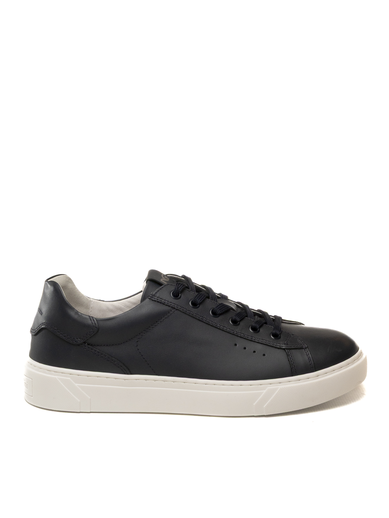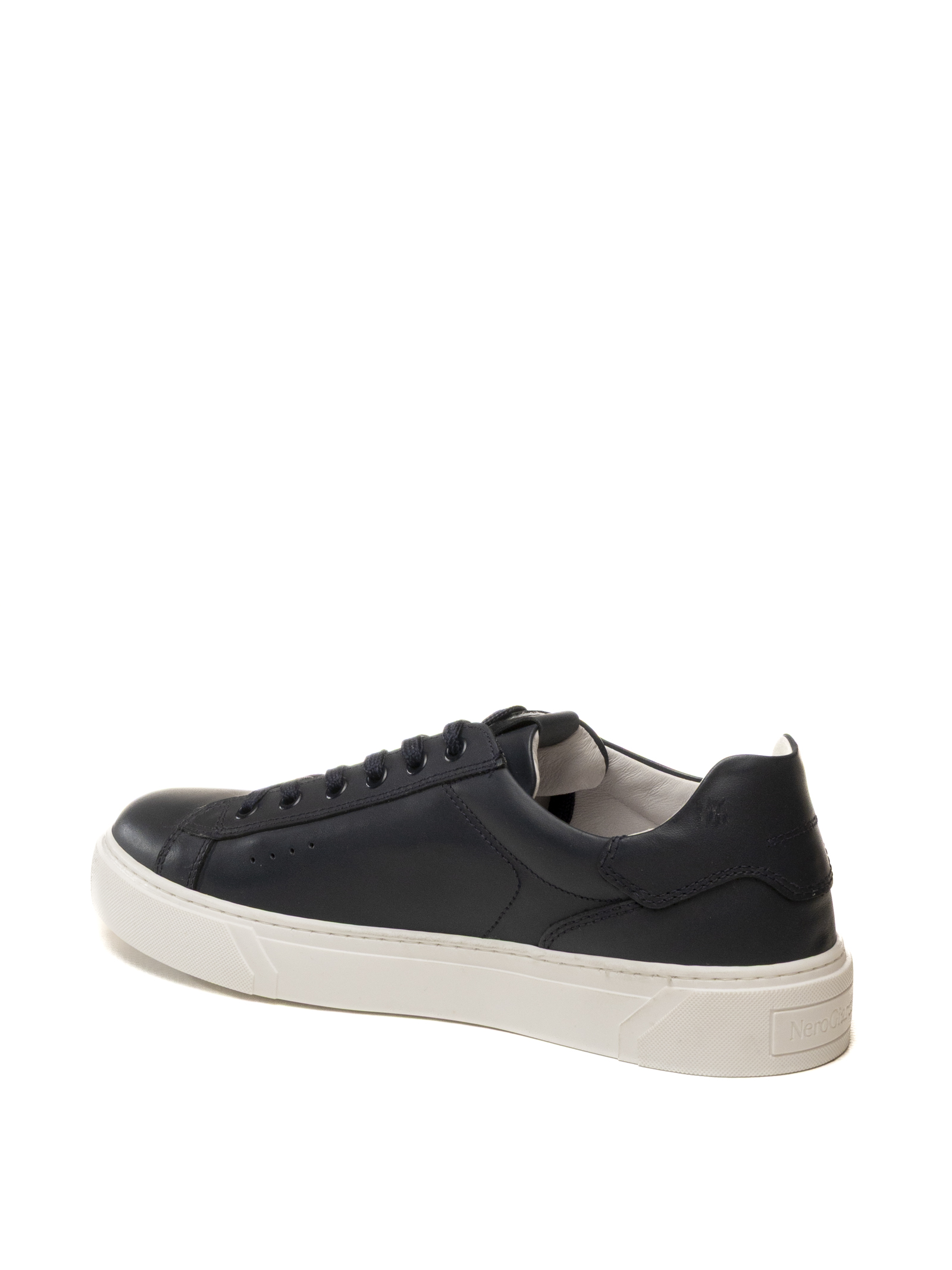 La tomaia è interamente realizzata in pregiata vera pelle liscia di colore nero, definita da linee pulite e una silhouette 'low cut' estremamente versatile. Il contrasto cromatico con la suola bianca a cassetta dona un look contemporaneo e grintoso, perfetto per completare outfit sia casual che formali. La cura artigianale è sottolineata dalle cuciture tono su tono e dai dettagli micro-perforati laterali che favoriscono la traspirabilità, aggiungendo un tocco tecnico e moderno. La linguetta è impreziosita dal logo NG impresso, mentre il talloncino assicura stabilità e uno stile impeccabile.