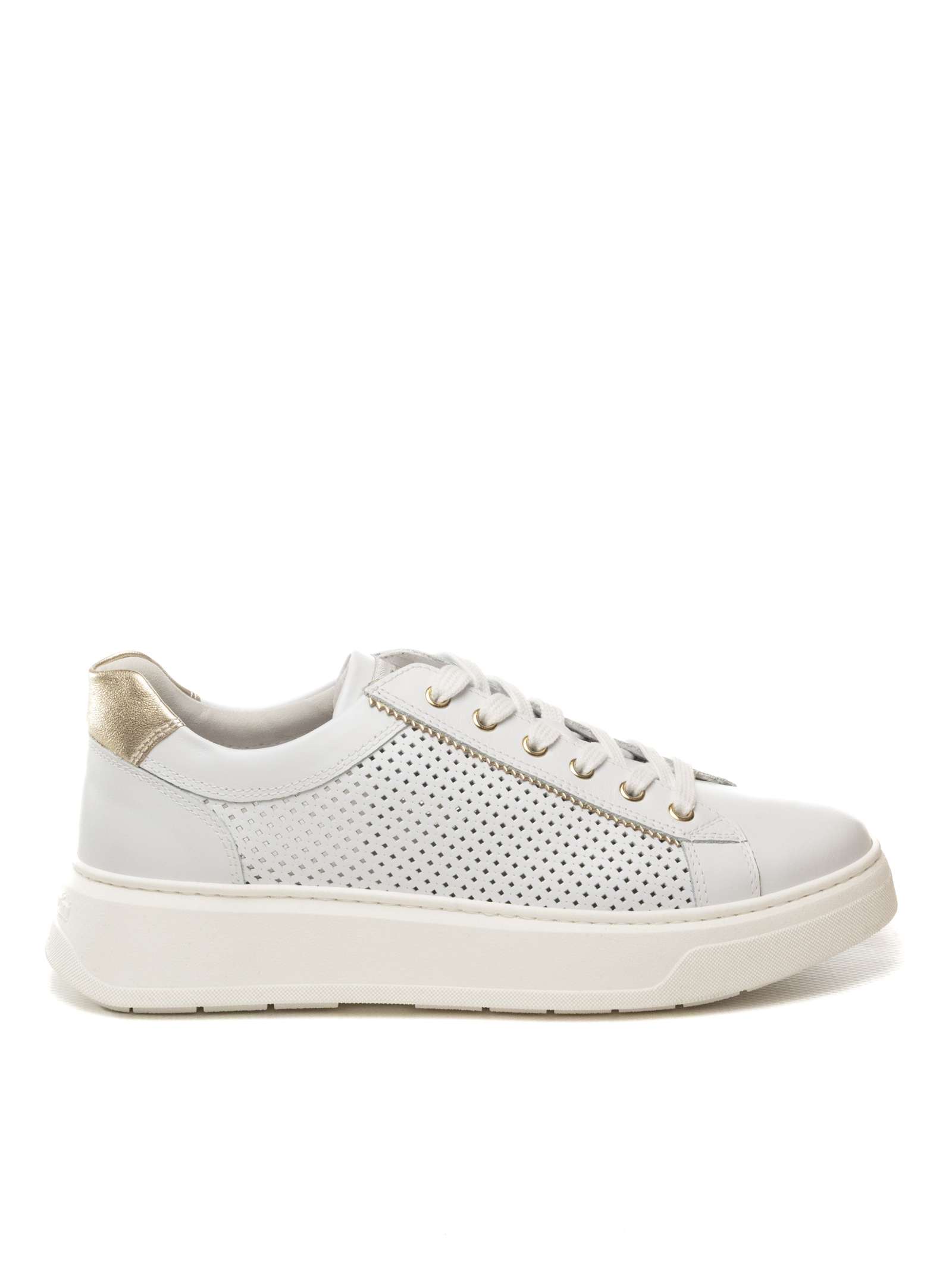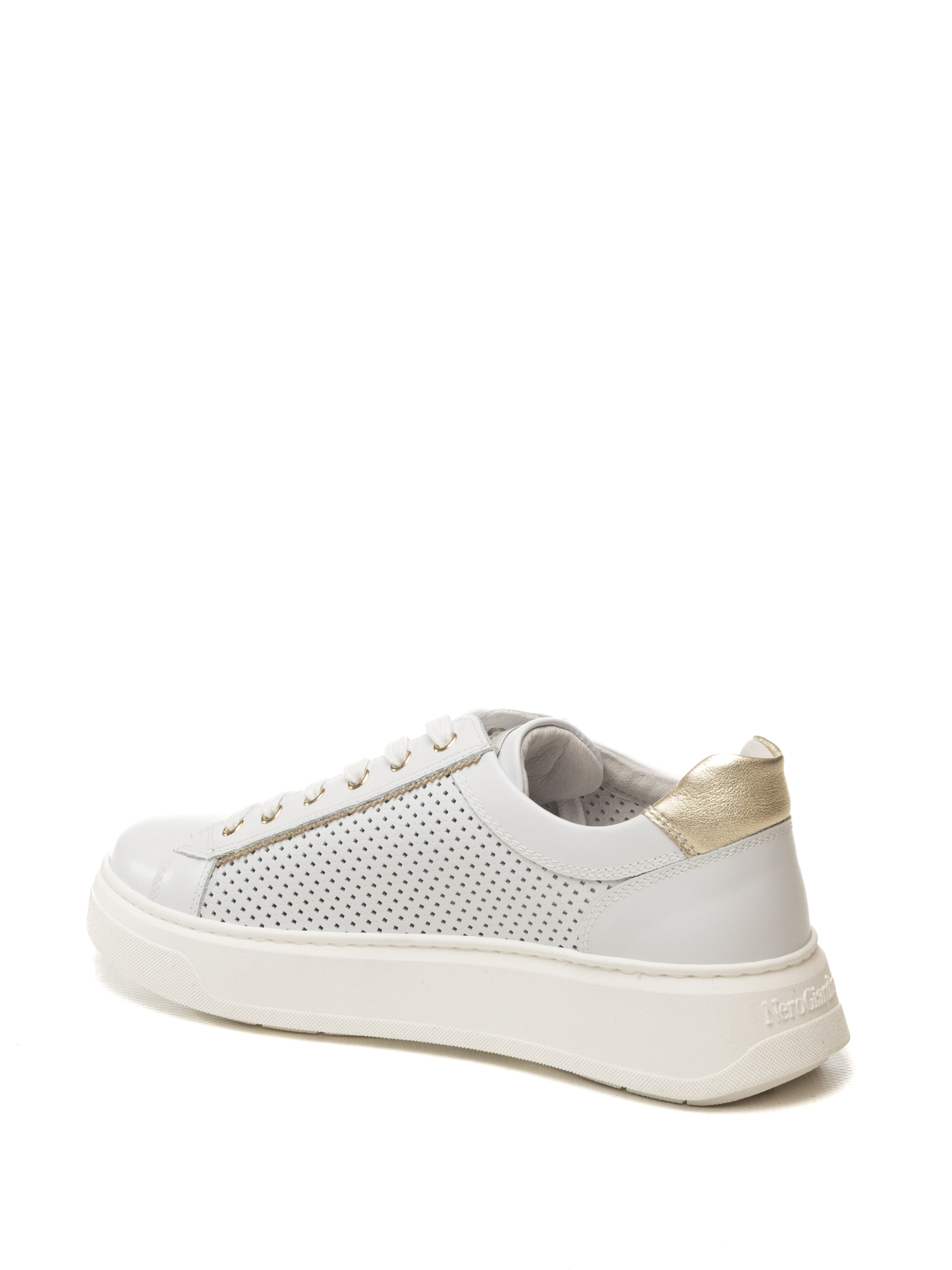 La tomaia è realizzata in pregiata vera pelle bianca, caratterizzata da una sofisticata lavorazione traforata sui fianchi che, oltre a creare un motivo estetico distintivo, garantisce un'ottima traspirabilità per le stagioni più calde. Il design minimale è impreziosito da un elegante talloncino in pelle laminata color oro, che aggiunge una nota di glamour e sofisticatezza alla silhouette. La chiusura con lacci piatti tono su tono assicura una calzata precisa e confortevole, mantenendo la pulizia delle linee.