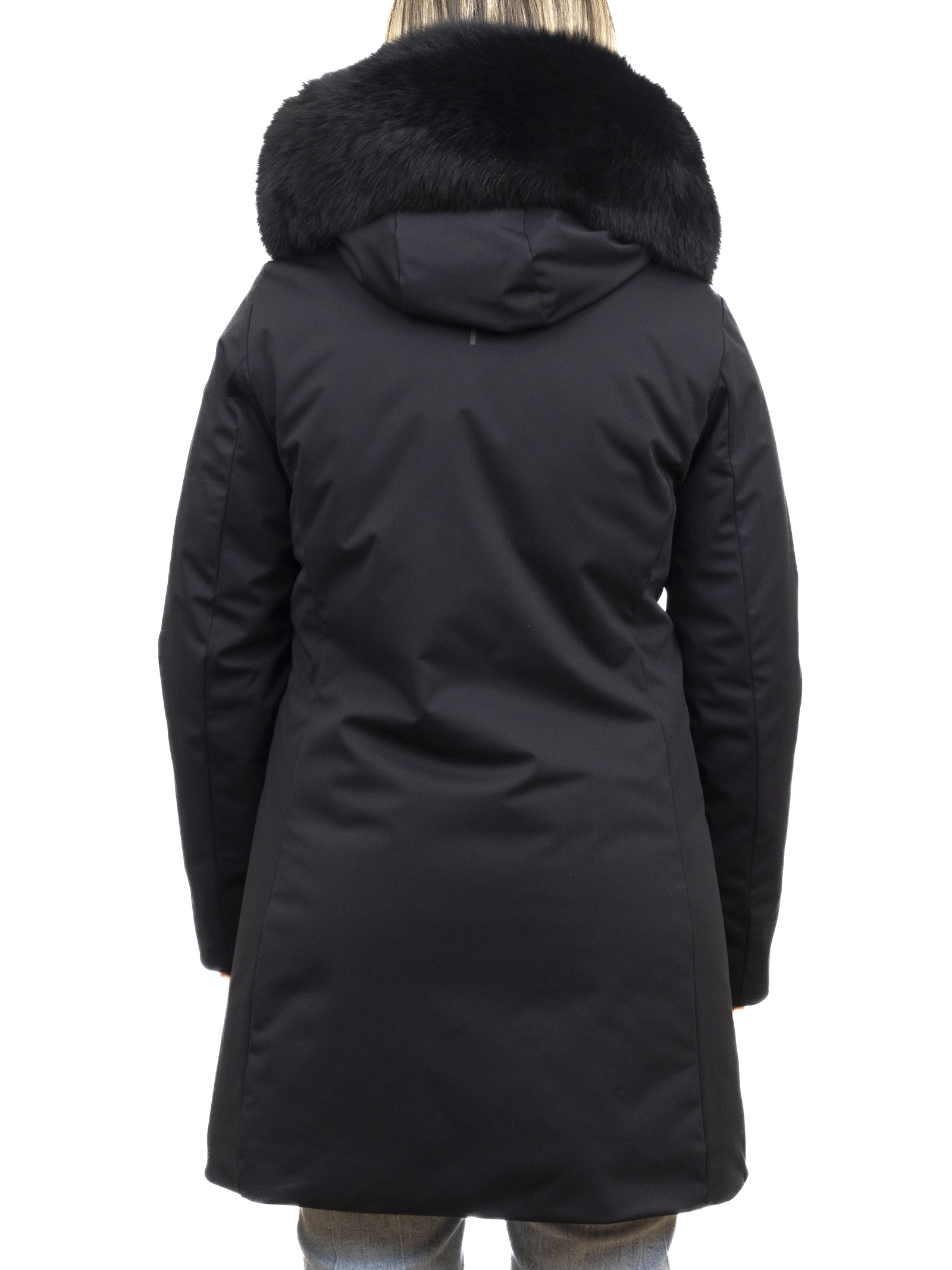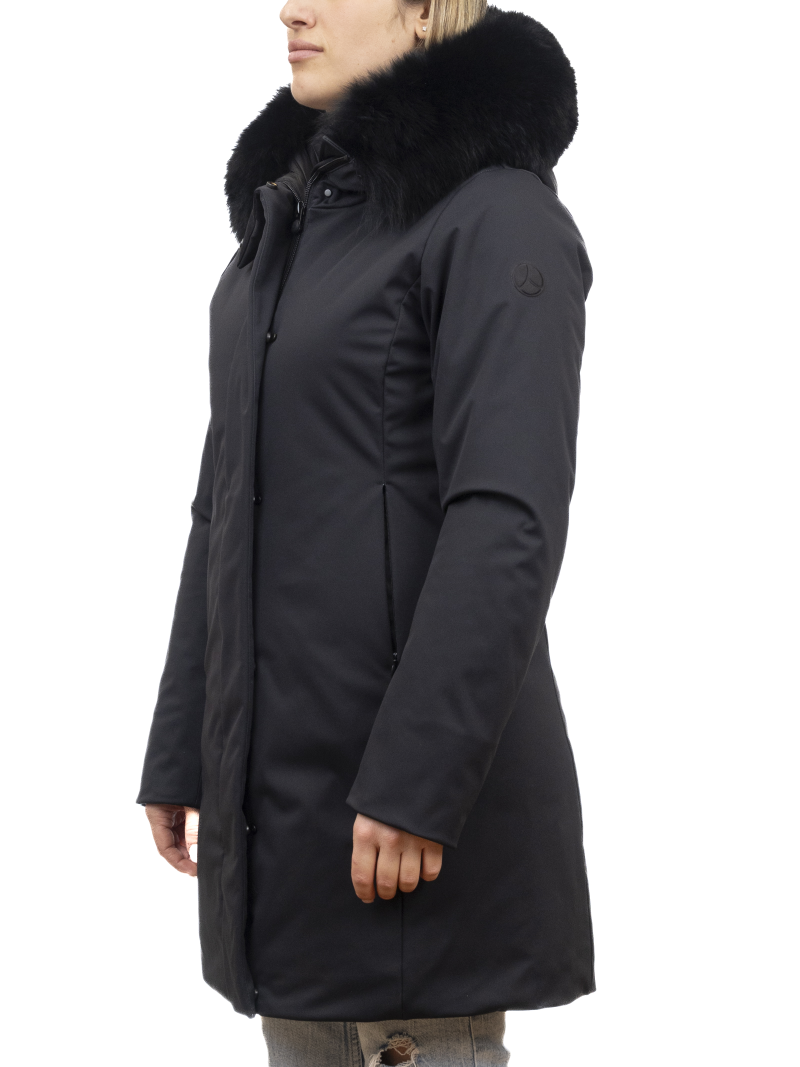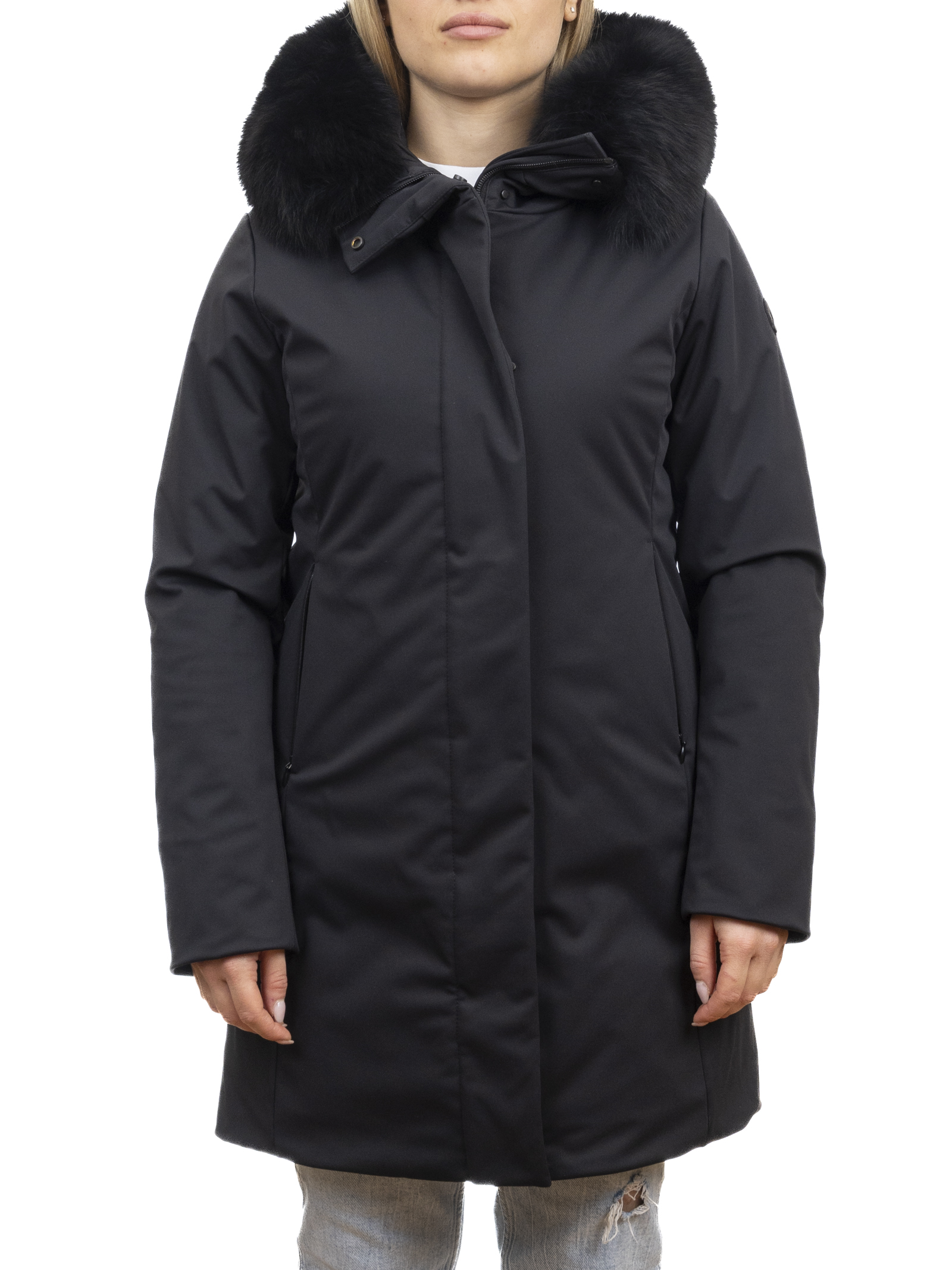 Giacca in nylon imbottito. Chiusura con zip e patta. Tasche zip laterali. Cappuccio con pelliccia removibile. Logo laterale.