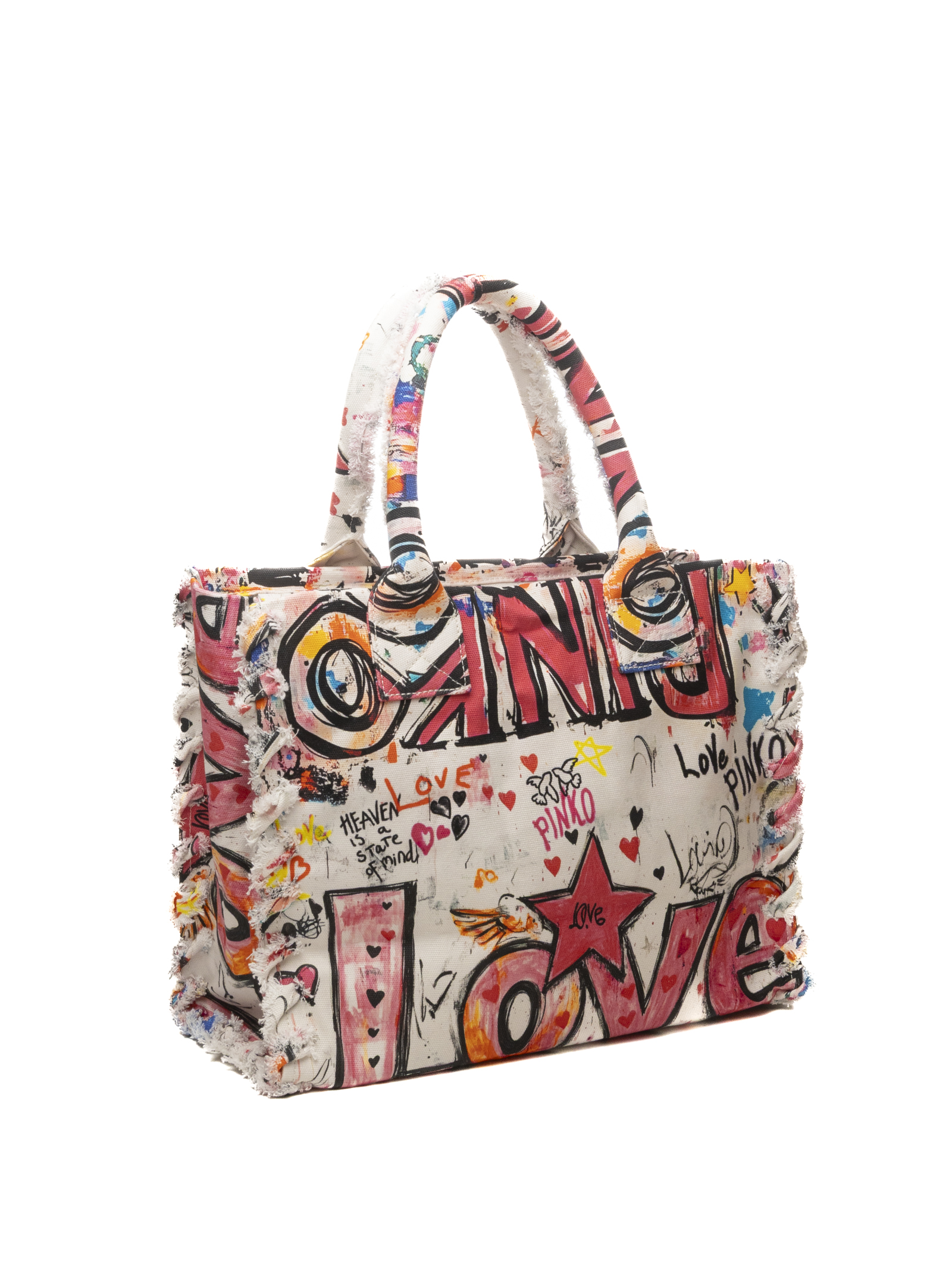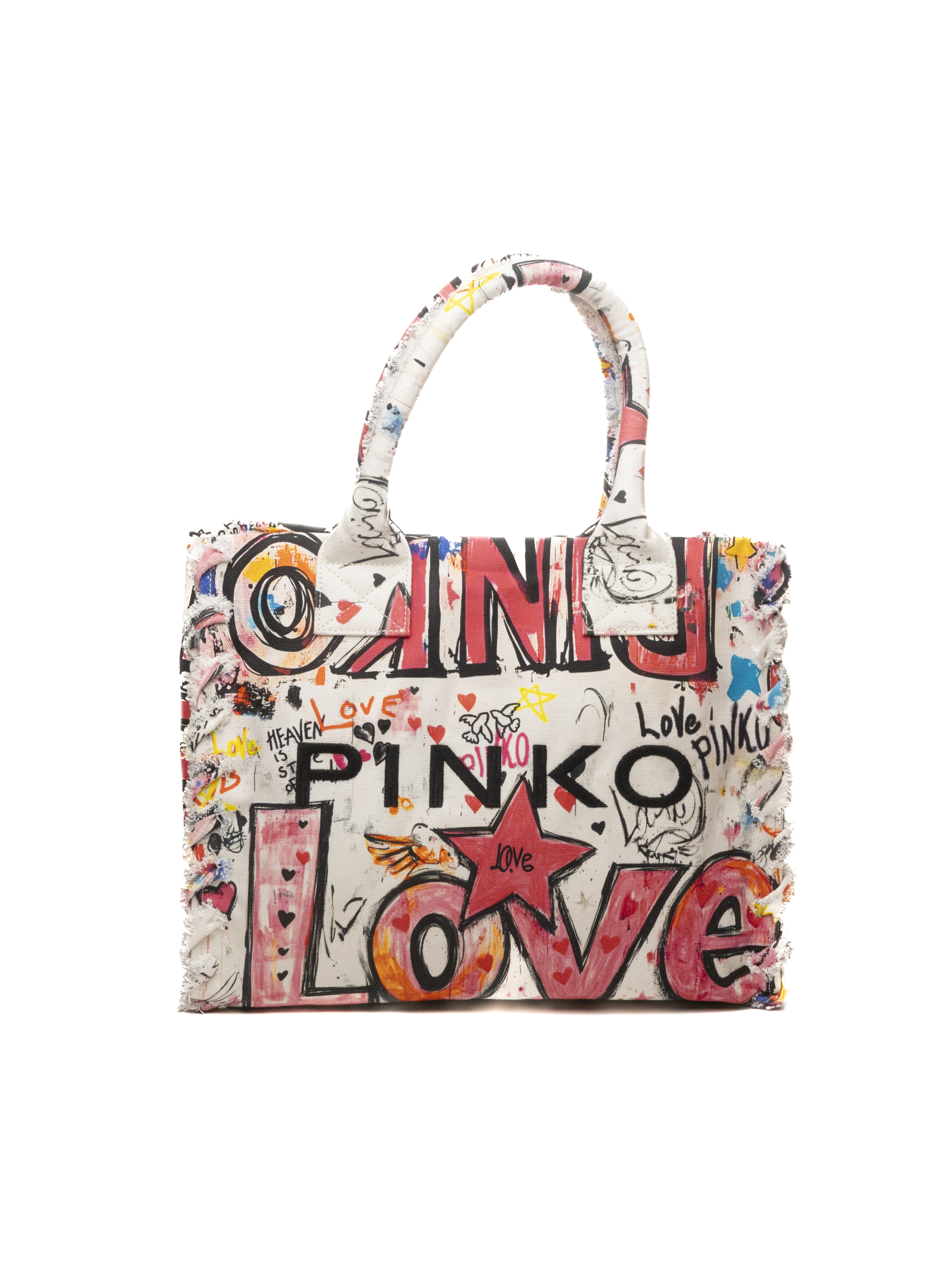 Realizzata in canvas di cotone riciclato, questa shopper di grandi dimensioni unisce sostenibilità e stile espressivo. La superficie è interamente decorata con una grafica colorata che include cuori, stelle e scritte iconiche come "LOVE" e il logo lettering PINKO, creando un effetto visivo dinamico e artistico. I profili sfrangiati completano il design, conferendo all'accessorio un carattere rilassato e tipicamente estivo.