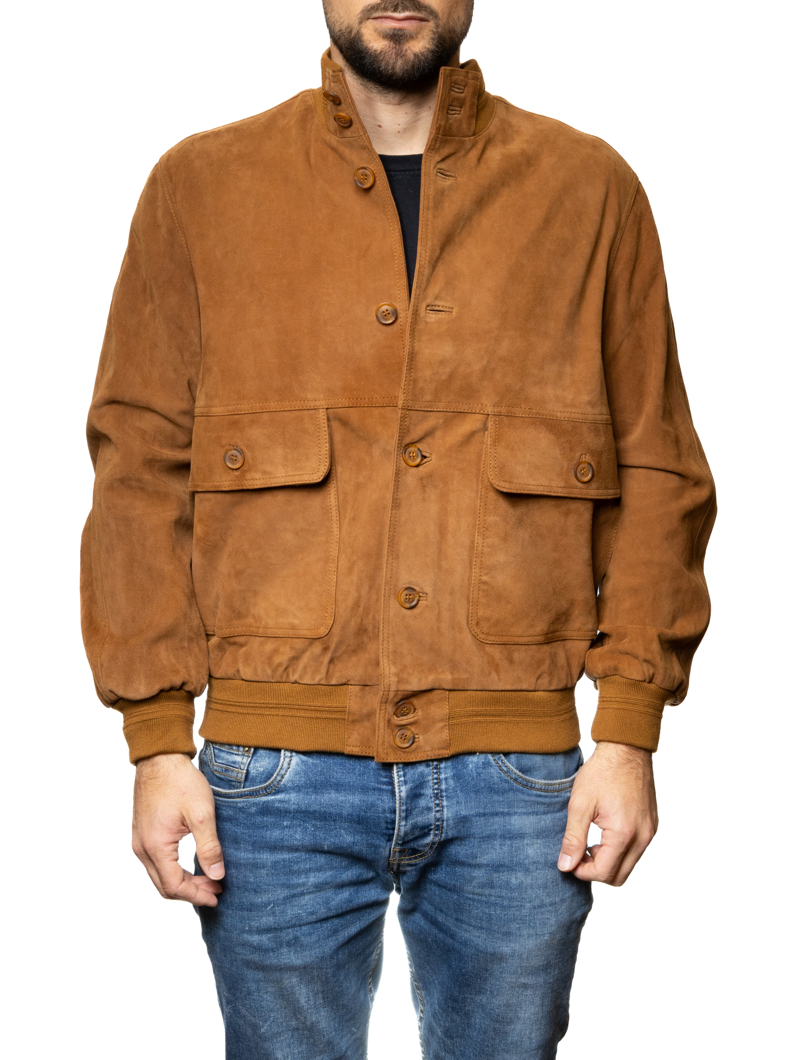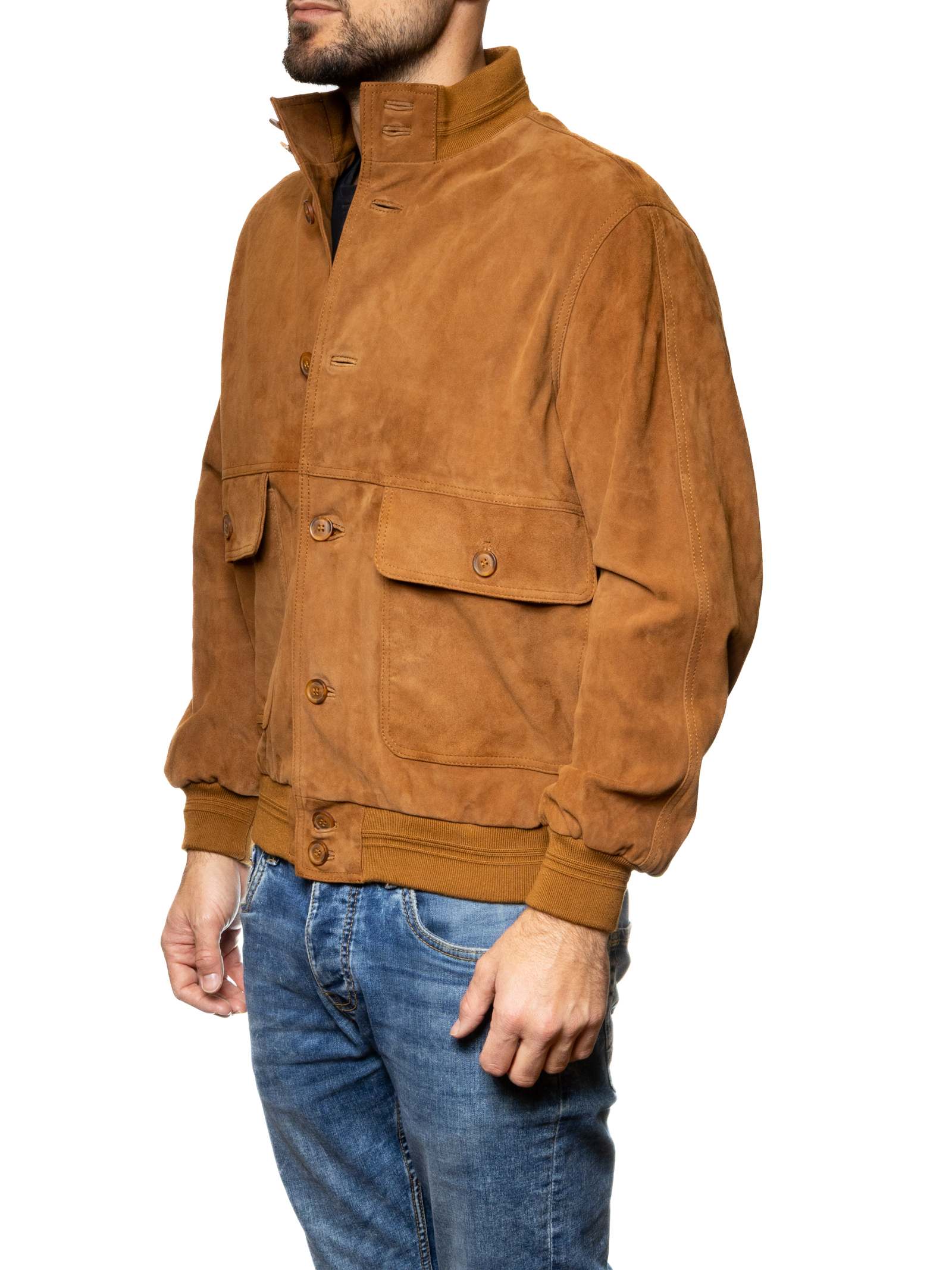 Giacca da uomo in morbido suede, dal carattere vintage e intramontabile. Il colore cuoio caldo e avvolgente valorizza la texture scamosciata, conferendo al capo un aspetto elegante e allo stesso tempo casual, perfetto per la mezza stagione o per arricchire outfit quotidiani con un tocco di stile.