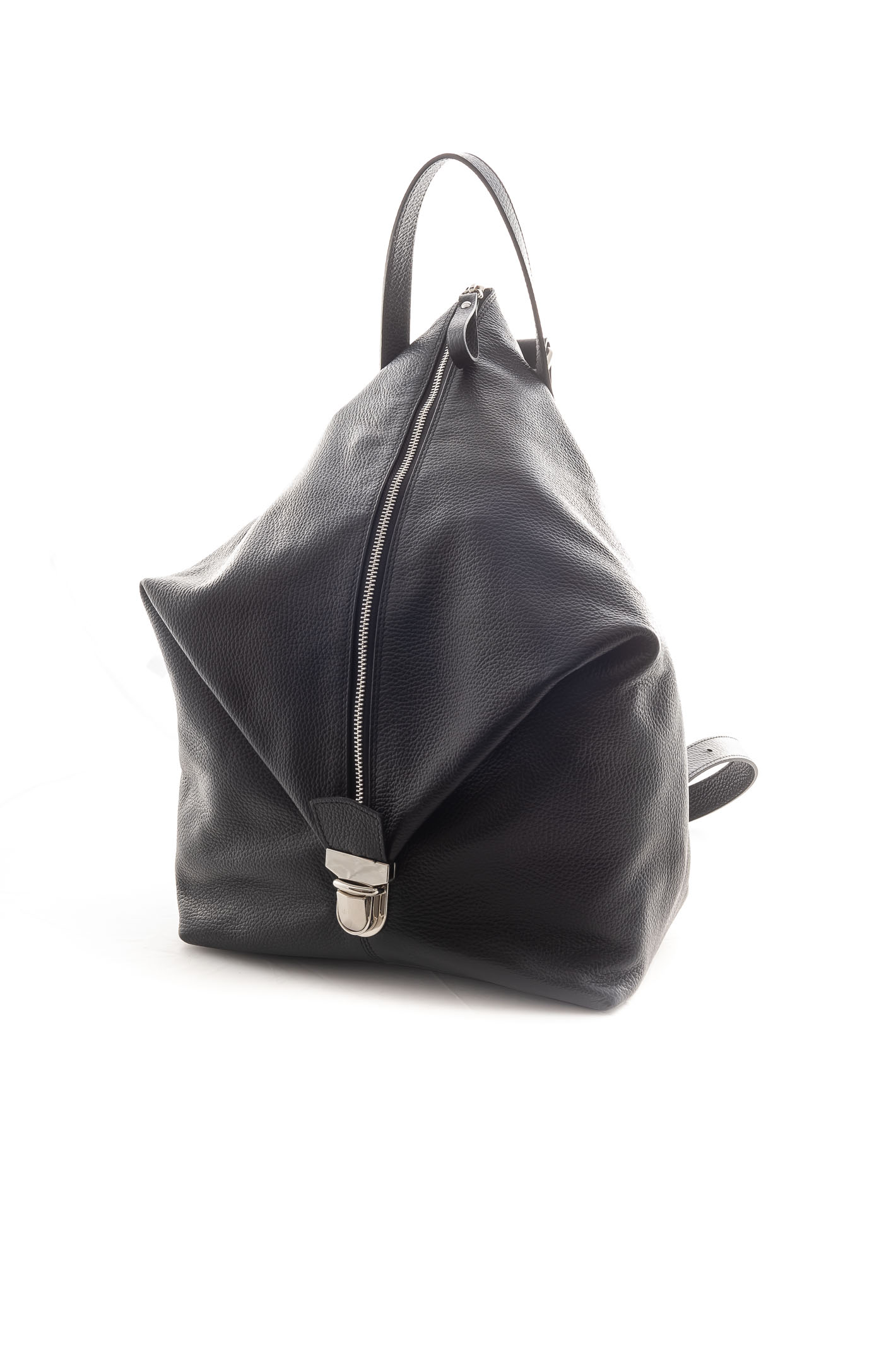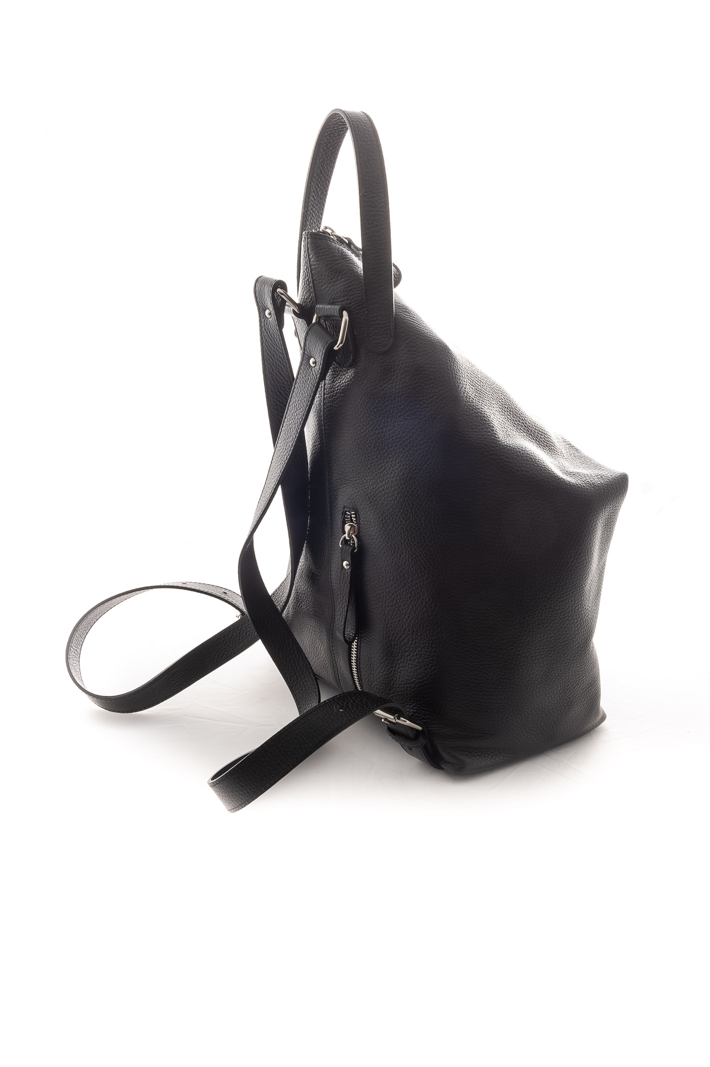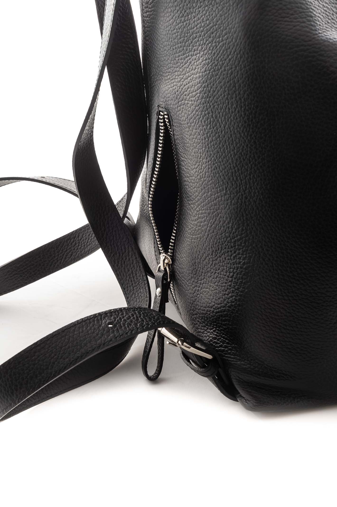 Zaino in pelle. Chiusura zip. Taschino posteriore. Manico. Spallotte regolabili. Made in Italy.