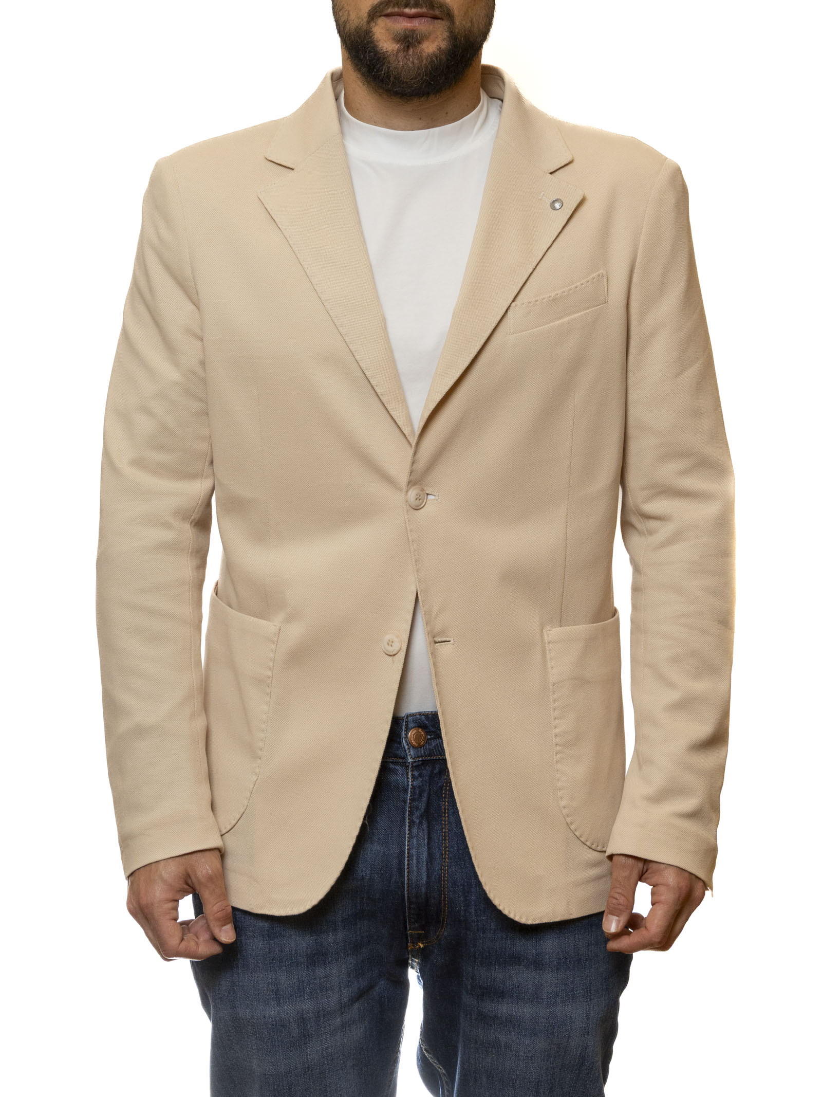 Il design mantiene la costruzione smart e decostruita tipica del brand, con una silhouette Slim Fit che valorizza la figura in modo moderno. Il modello è caratterizzato da revers a lancia, chiusura a due bottoni e le pratiche tasche a toppa che ne sottolineano l'anima versatile e meno formale. Il dettaglio distintivo è rappresentato dal pin logo metallico sul bavero, sinonimo di qualità e ricerca stilistica. Grazie alla sua tonalità neutra e calda, questa giacca è estremamente facile da abbinare: splendida con un denim lavaggio chiaro per un look da giorno, o con un pantalone scuro per creare un contrasto elegante nelle serate estive.