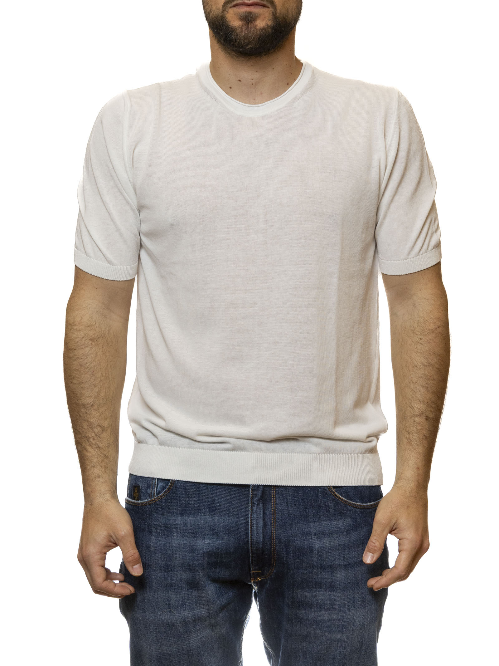 Questa t-shirt in maglia firmata QB24 in versione White è l'essenza della purezza e del lusso informale. Realizzata con una pregiata lavorazione in 100% cotone a maglia finissima, il capo sprigiona una luminosità naturale che mette in risalto la texture leggera e traspirante del filato. A differenza delle comuni t-shirt in jersey, la particolare struttura tricot di questo modello offre una caduta fluida e una mano vellutata, garantendo un'eleganza superiore senza rinunciare alla freschezza indispensabile per la stagione calda.