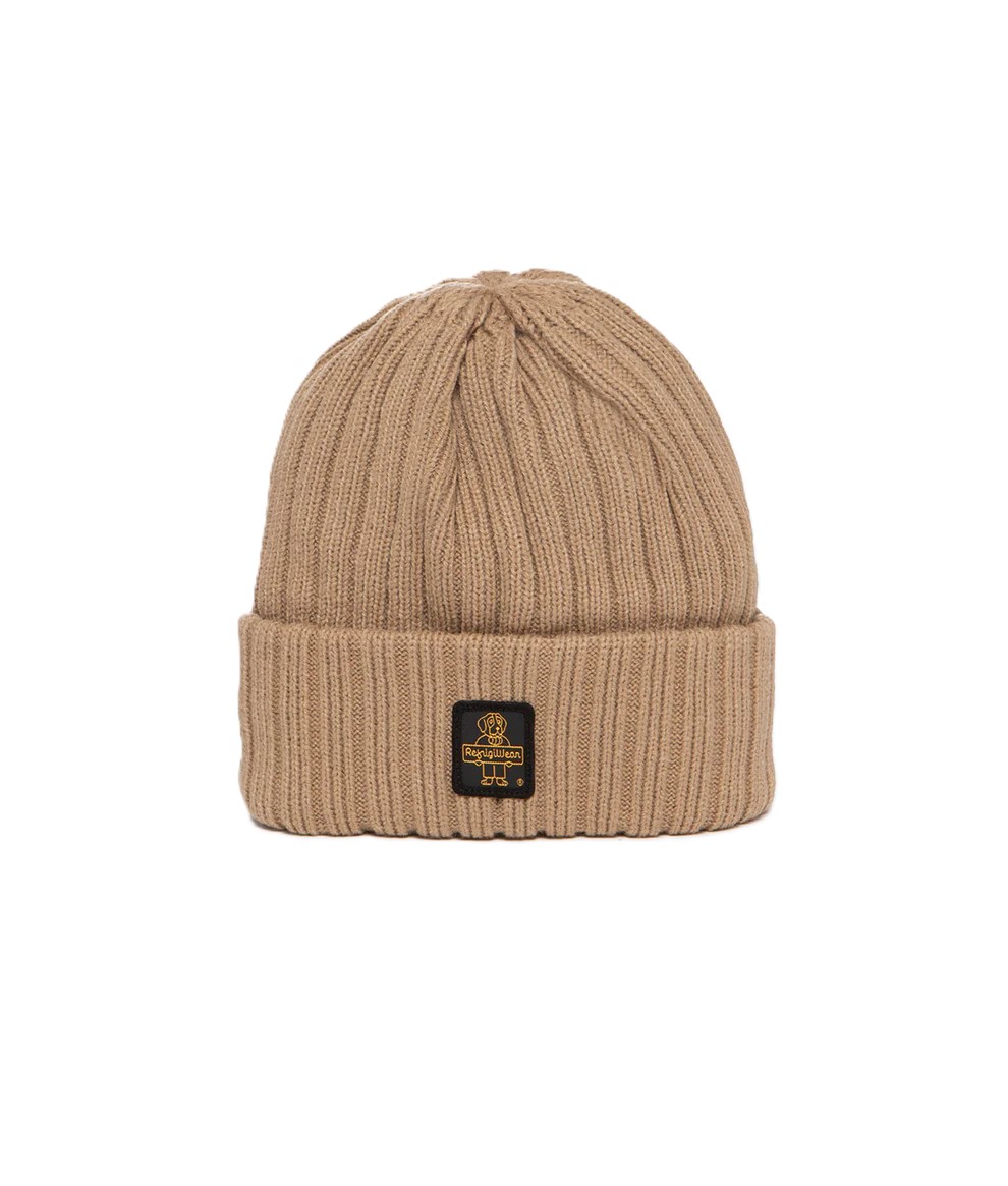 Il berretto taupe in maglia a coste con risvolto e logo frontale ricamato è l' accessorio perfetto per affrontare la stagione fredda con stile.